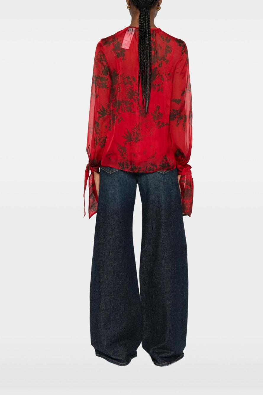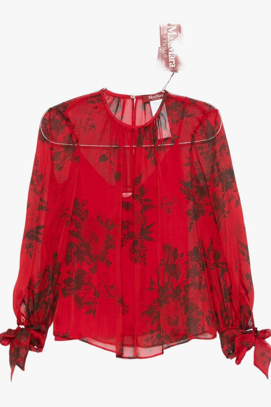 Caratterizzata da una stampa floreale rossa all-over, presenta scollo tondo, maniche lunghe e polsini annodati che aggiungono un tocco di grazia e movimento. Ideale da indossare con pantaloni sartoriali o gonne midi, incarna la classe e l’equilibrio stilistico tipici di Max Mara.