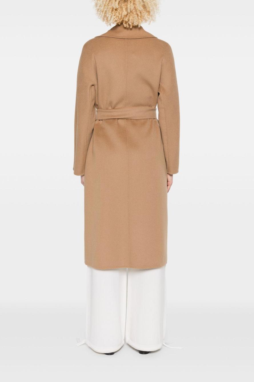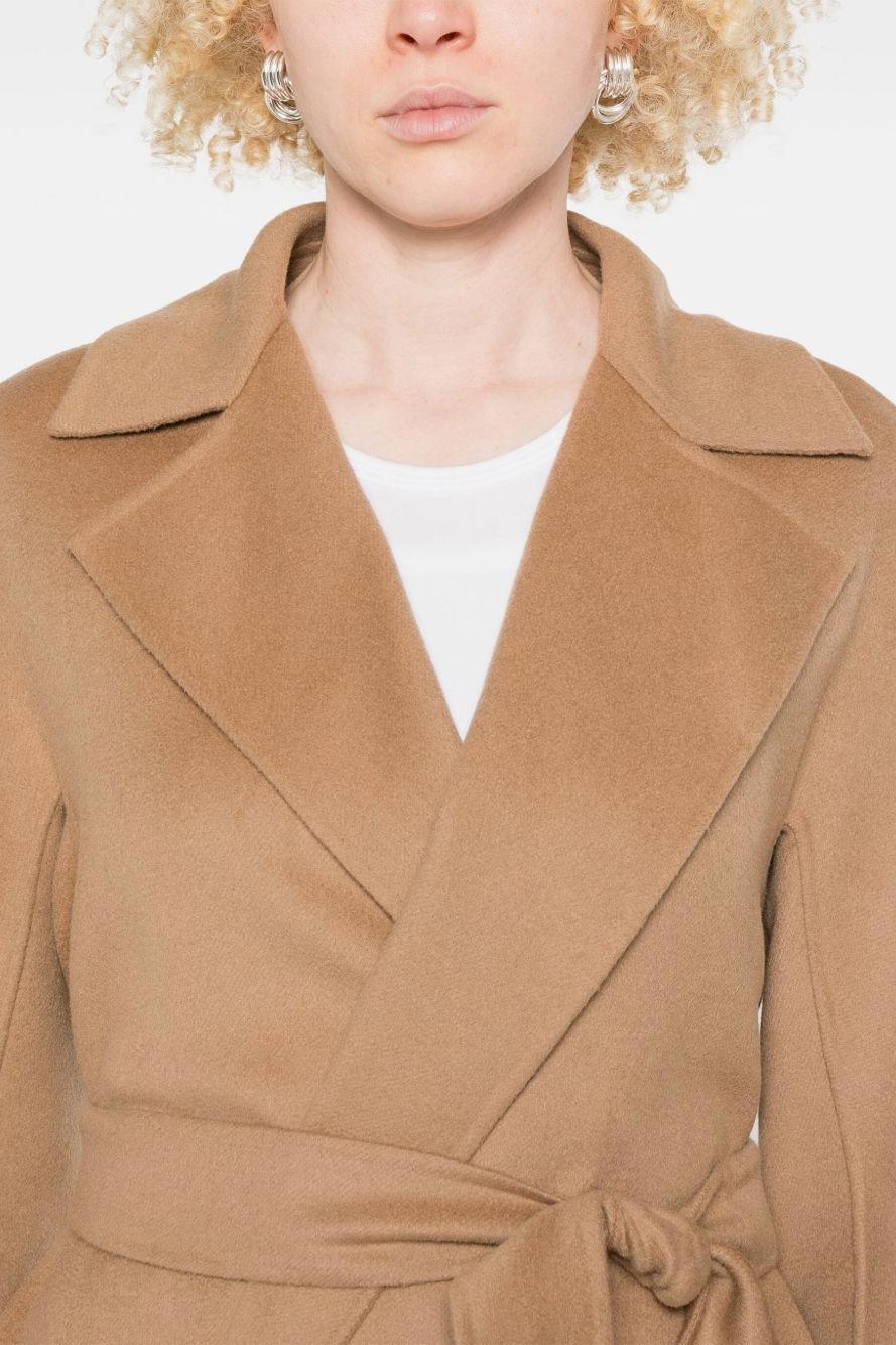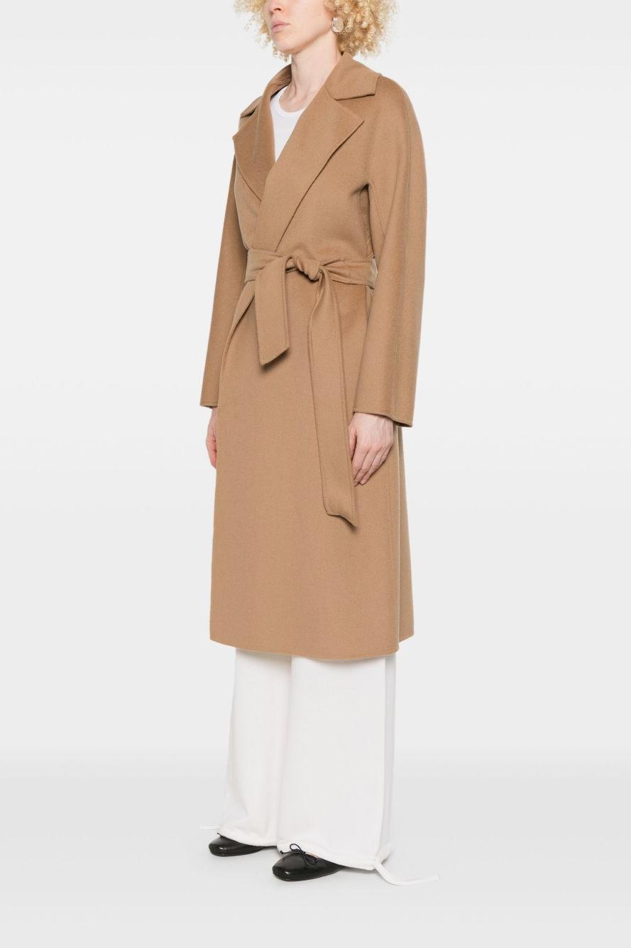 Proposto in una raffinata tonalità marrone cammello, presenta una parte frontale aperta senza chiusure, due tasche laterali a filetto e una cintura coordinata che valorizza la silhouette con classe. I revers classici completano il design con un tocco di sobria raffinatezza, tipico dello stile Max Mara.