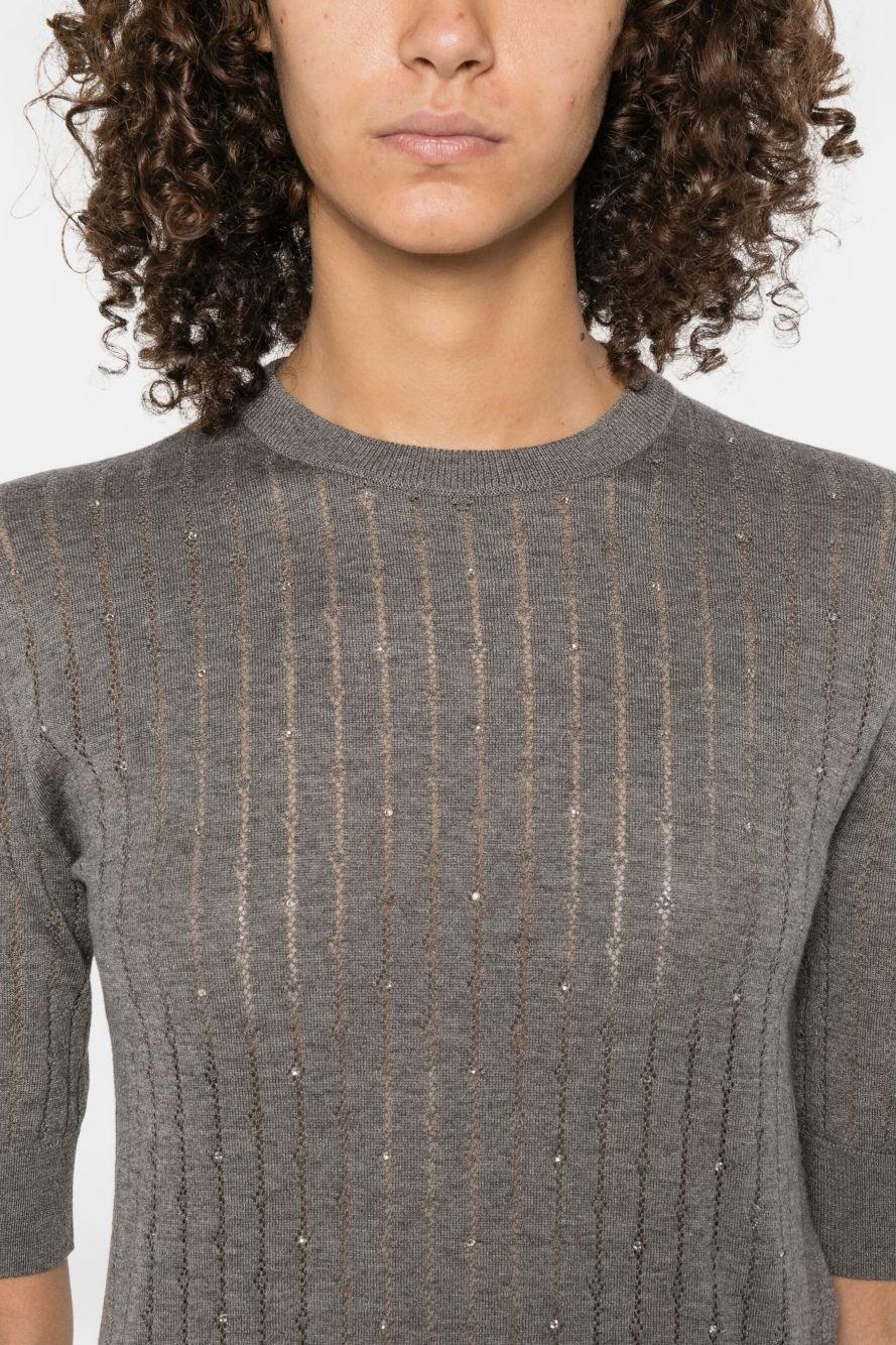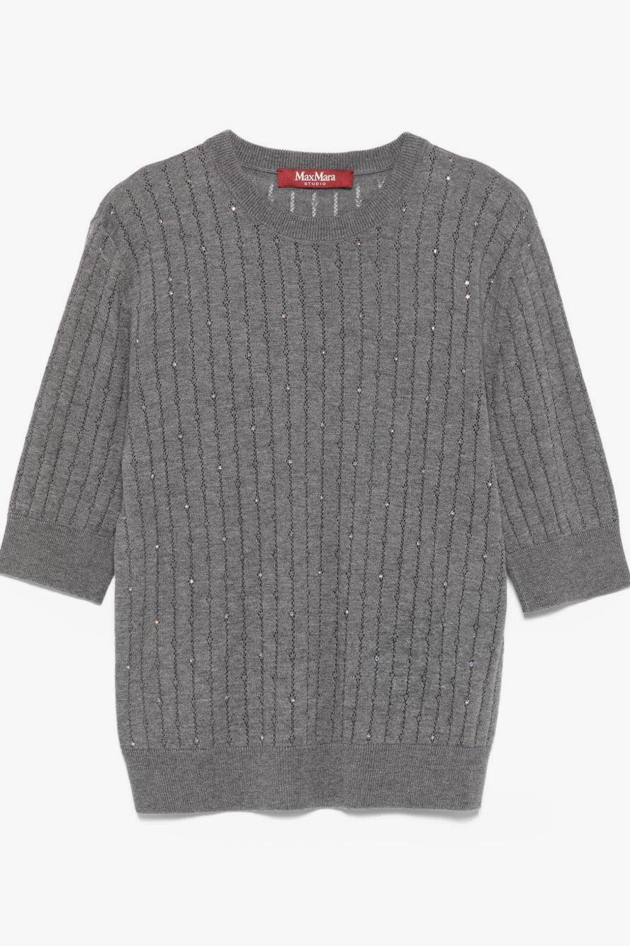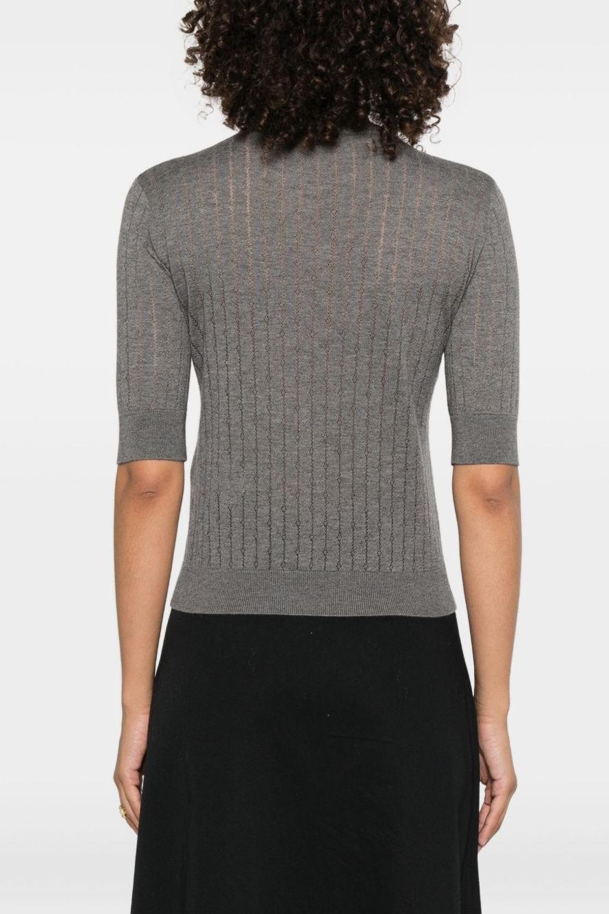 Proposto in grigio, presenta una lavorazione a coste con decorazione, girocollo classico, maniche corte e orlo dritto, per una linea pulita e sofisticata. L’equilibrio tra semplicità e dettaglio decorativo rende questo maglione un capo versatile e di classe.