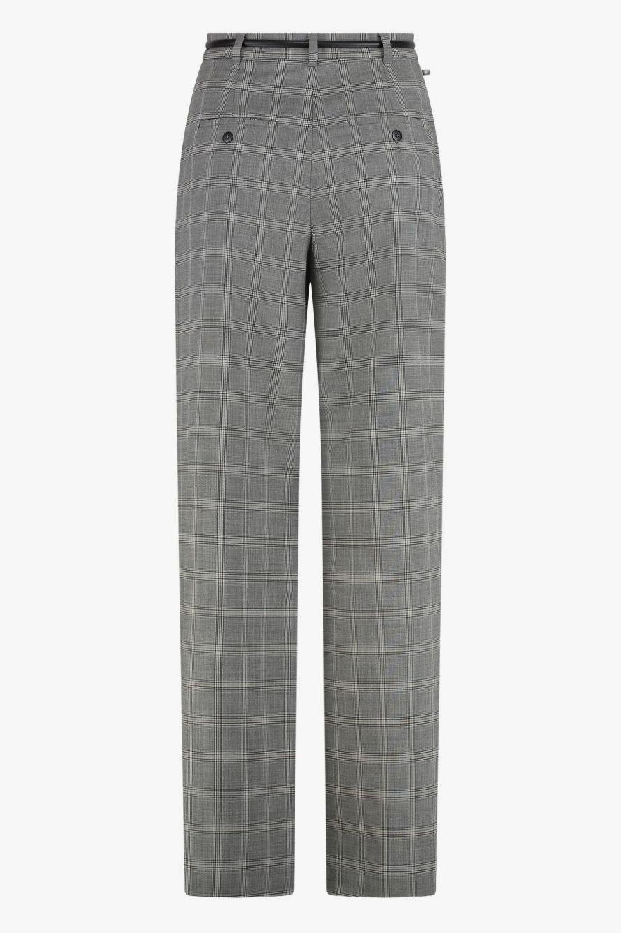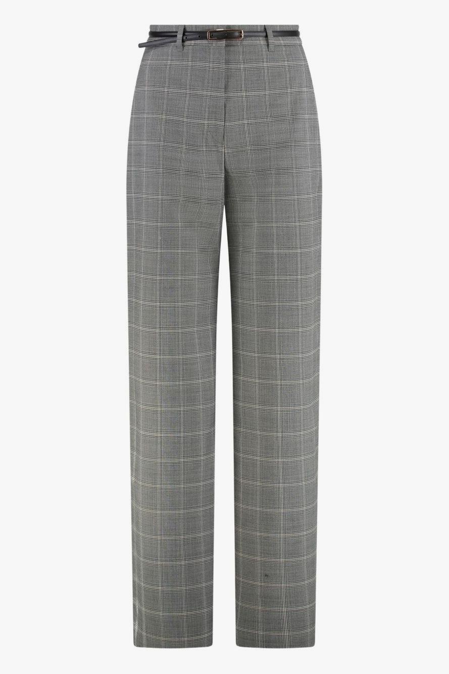 Proposti in grigio con motivo a quadri, presentano passanti per cintura e taglio dritto, che valorizzano la silhouette mantenendo un’eleganza sobria e raffinata. La cintura in coordinato completa il look, sottolineando il punto vita con discrezione. Orgogliosamente Made in Italy, incarnano la qualità e la classe inconfondibili di Max Mara.