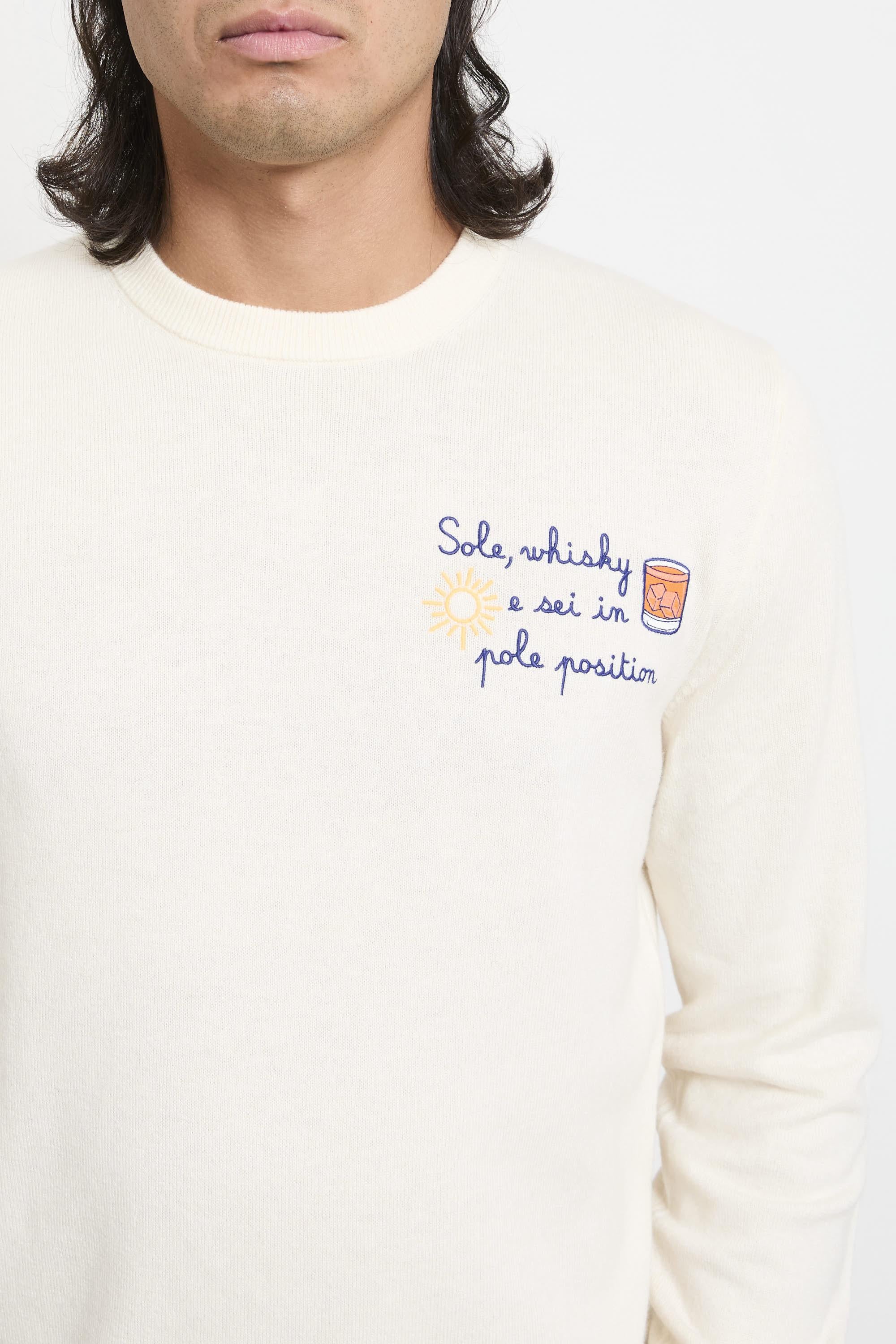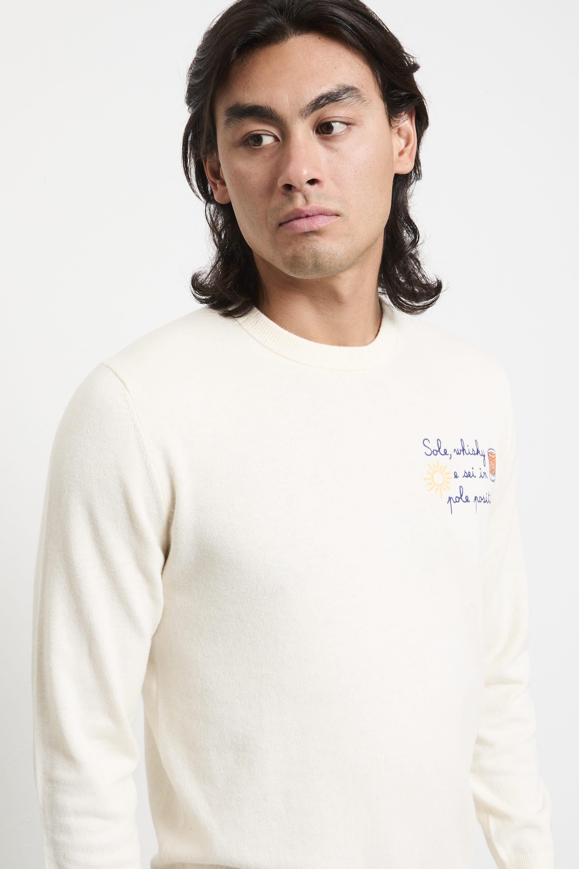 Con il suo design raffinato e il richiamo a una battuta cult del cinema, questo maglione è un must-have per chi cerca comfort e stile in un unico capo dal carattere ironico e raffinato. Realizzata in un pregiato mix di lana, cashmere, viscosa e altr fibre, offre una vestibilità regolare che garantisce comfort e stile. Il ricamo "Sole, whisky e sei in pole position!" sul petto e il logo Saint Barth sul polso aggiungono un tocco distintivo. Perfetta per le serate invernali, si abbina splendidamente a pantaloni in velluto a coste e scarpe derby in pelle scura. Vestibilità: Regolare Composizione: 40% lana, 10% cashmere, 25% viscosa, 25% altre fibre Colore: Panna Taglia indossata: M