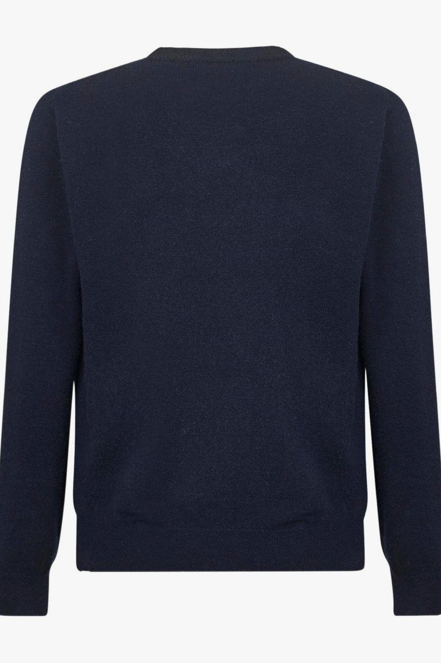 La tonalità blu navy, profonda e versatile, rende il maglione ideale per la stagione fredda e per molteplici abbinamenti. La composizione — una miscela morbida di lana (35%), cashmere (10%) e altri materiali — assicura calore, comfort e una mano soffice sulla pelle. Il girocollo a coste, le maniche lunghe e gli orli a coste definiscono una silhouette classica e accogliente, perfetta per i look casual e invernali.