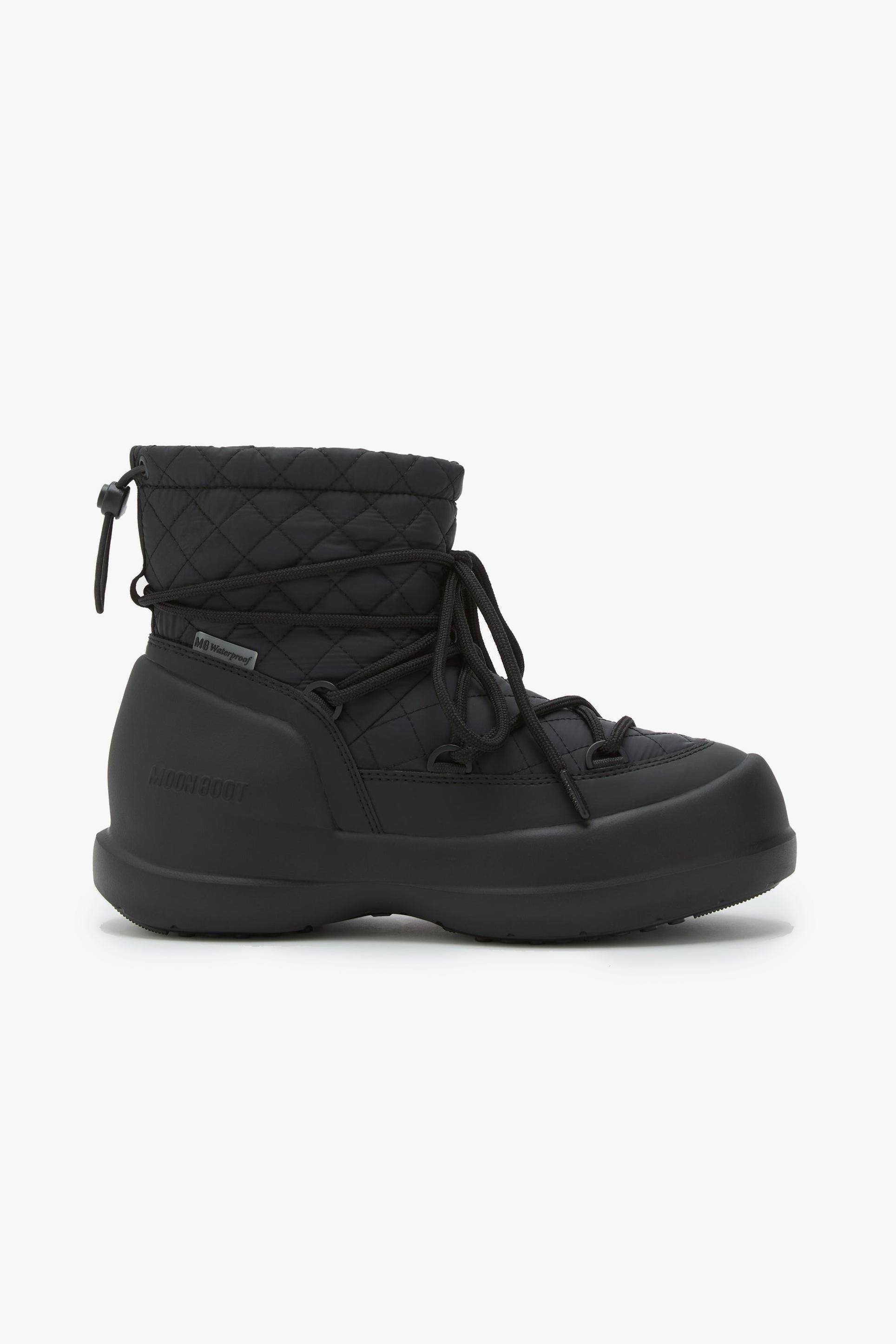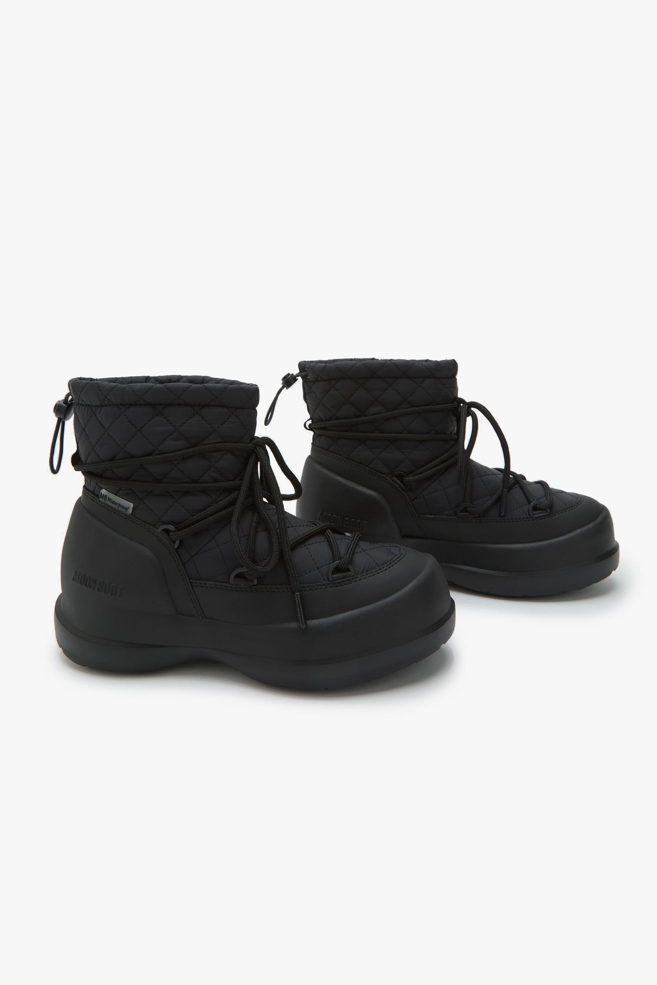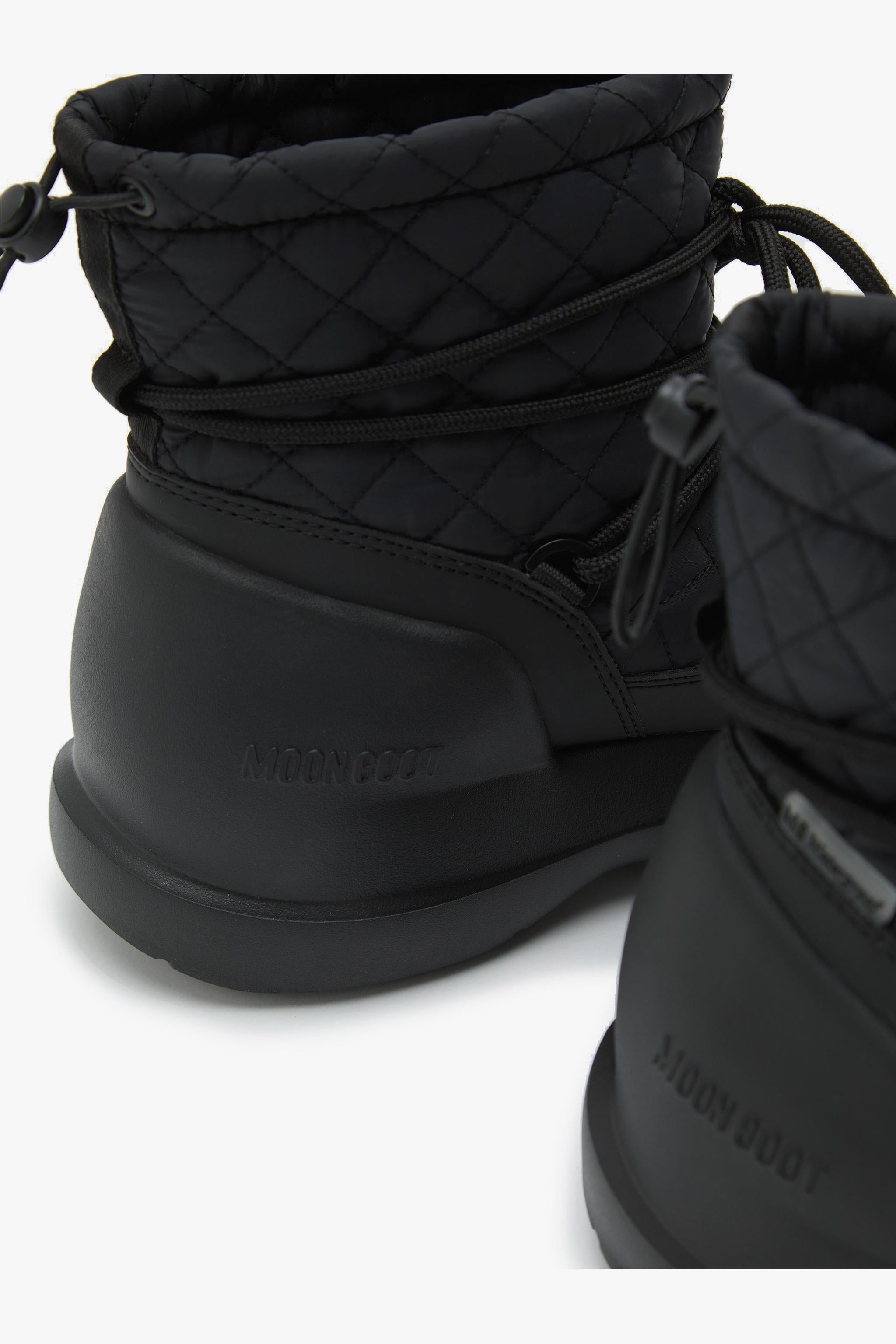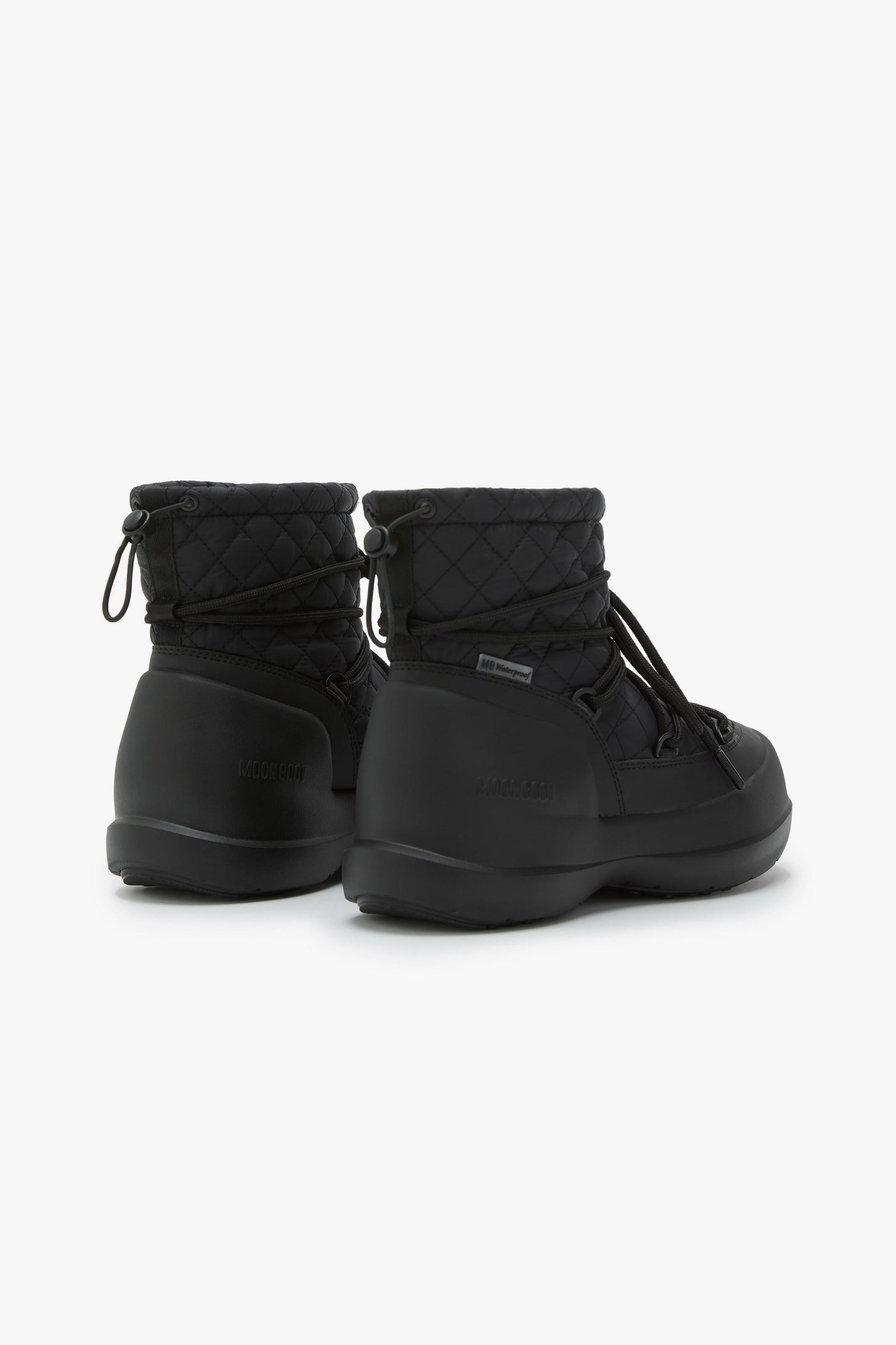 Moon Boot Mezzaluna Quilted High in nero veste l’inverno con un’estetica trapuntata di carattere e una protezione studiata per la vita quotidiana. Il gambale alto scolpisce la silhouette, mentre la costruzione 100% impermeabile mantiene il piede asciutto tra pioggia, neve e pozzanghere urbane. L’allacciatura con lacci tubolari incrociati e coulisse permette di regolare l’aderenza in un attimo; sotto, intersuola in EVA e battistrada in gomma termoplastica garantiscono ammortizzazione leggera e presa affidabile su superfici fredde e bagnate. Dettagli tono su tono e logo goffrato siglano un look essenziale ma riconoscibile.Caratteristiche principali:# Modello: Mezzaluna Quilted High · Colore: Black · ID: 80D2500020. # 100% impermeabile con finitura resistente agli agenti atmosferici. # Motivo quilted sul gambale, occhielli in metallo tono su tono, logo goffrato sul tallone. # Lacci tubolari incrociati e coulisse regolabile; design slip-on per indosso rapido. # Intersuola in EVA per leggerezza e comfort; battistrada in gomma termoplastica antiscivolo. # Vestibilità: il modello calza grande; se si è tra due numeri, scegliere la taglia più piccola. # Materiali dichiarati: tomaia 80% poliammide / 20% poliuretano; fodera 85% poliestere / 15% poliammide; suola 75% EVA / 25% gomma termoplastica.