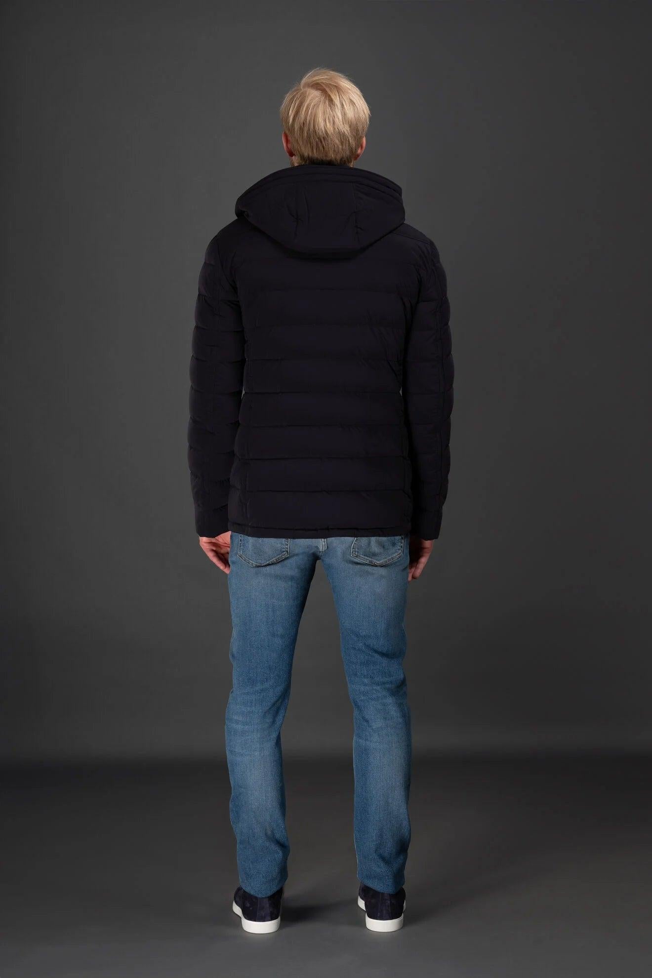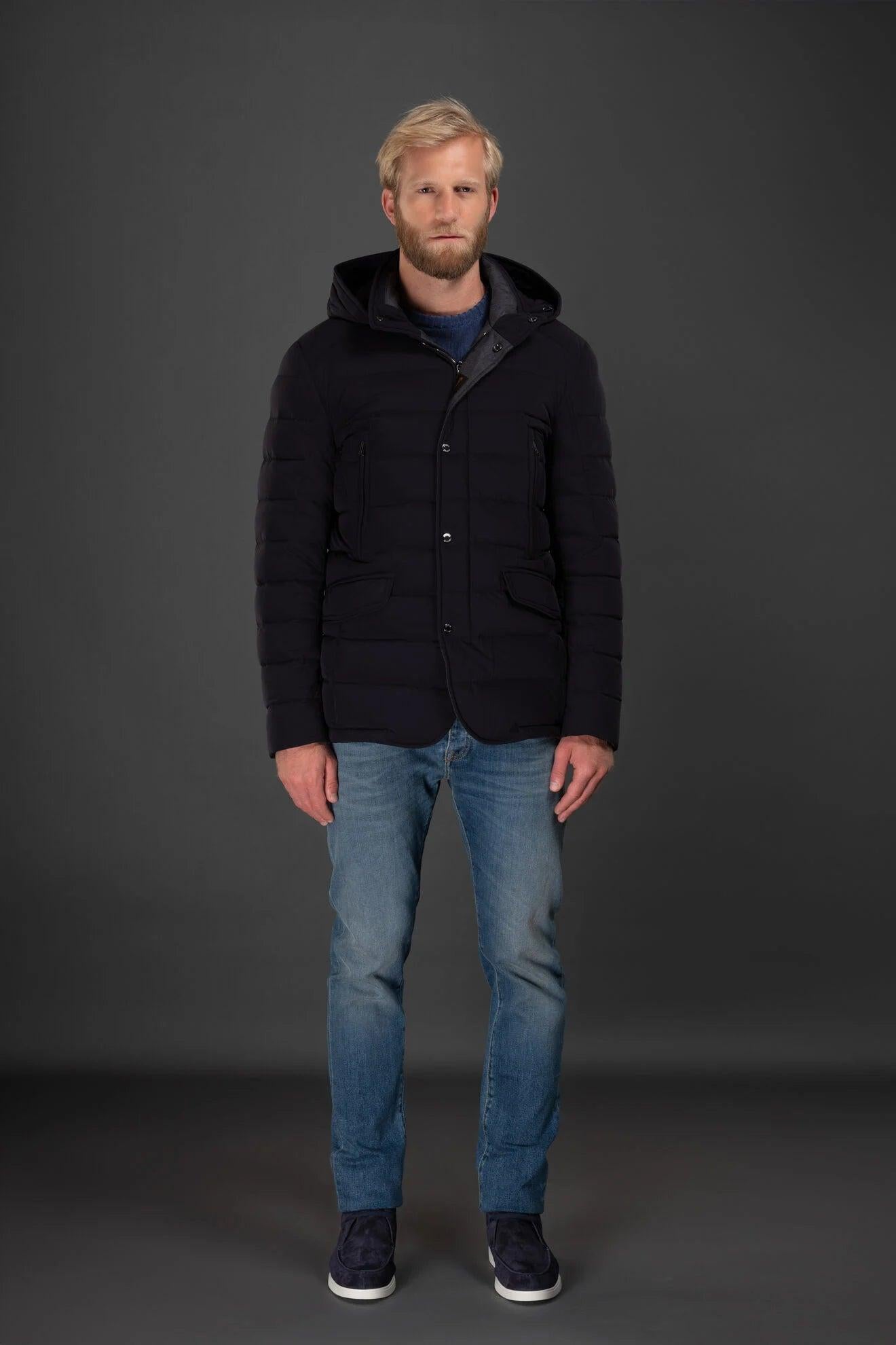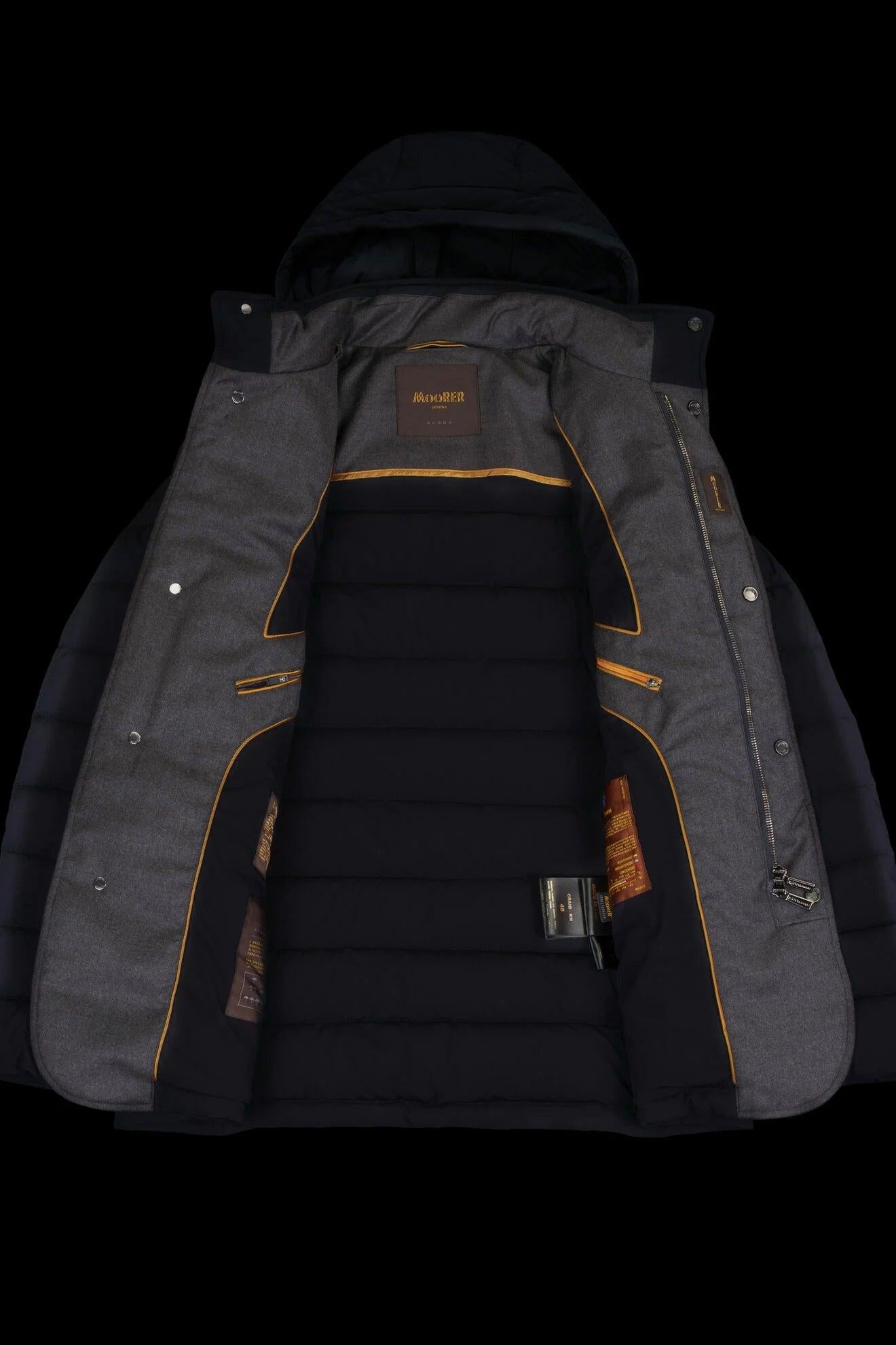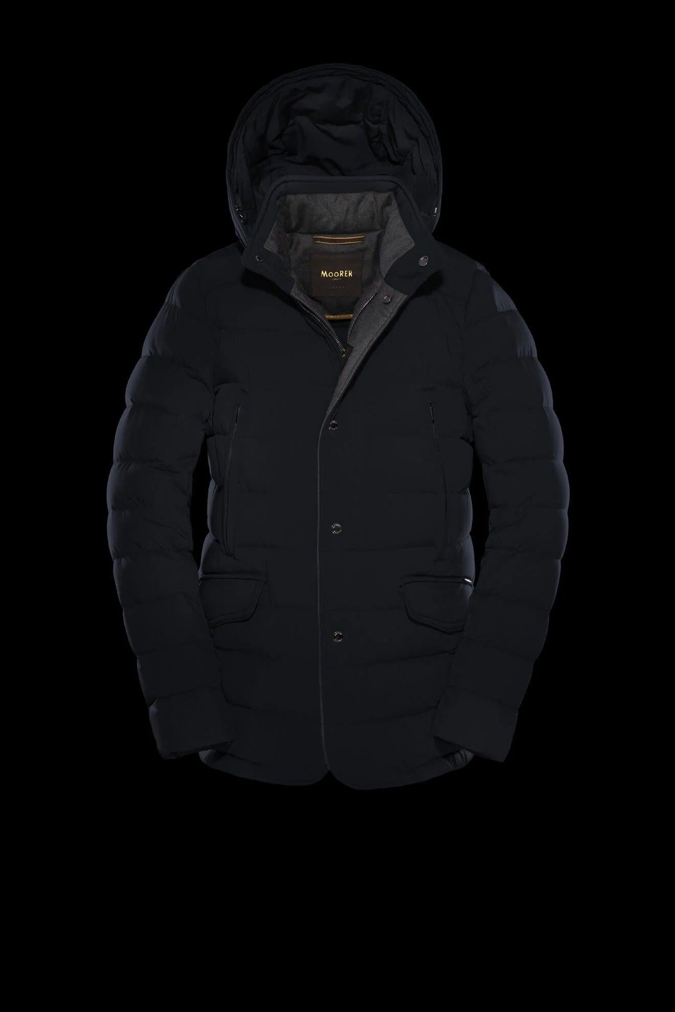Giacca dal taglio classico appartenente alla linea Acqua (1 ombrellino), imbottita in piuma d’oca, trapuntata esternamente a boudin. Realizzata in tessuto bielastico resinato idrorepellente, molto compatto e resistente alla trazione.Cappuccio con coulisse regolabile removibileCollo e paramonture impreziositi da inserti in flanella di lana vergine mista cashmereDoppia chiusura frontaleZip frontale in metallo spazzolata a doppio cursoreAbbottonatura frontale a finta con bottoni a pressione in metalloCollo chiuso da bottoni a pressione a vistaSul petto, tasche scaldamani verticali a filetto, chiuse da zipTasche con pattina sui fianchiInternamente trapuntato a boudin sul lato schiena e rifinito con fettucce logateDoppia tasca interna porta valoriMade in ItalyIl modello è alto 186 cm e indossa una taglia MooRER IT 50.Le misure del modello sono: torace 100 cm, vita 78 cm, fianchi 94 cm.