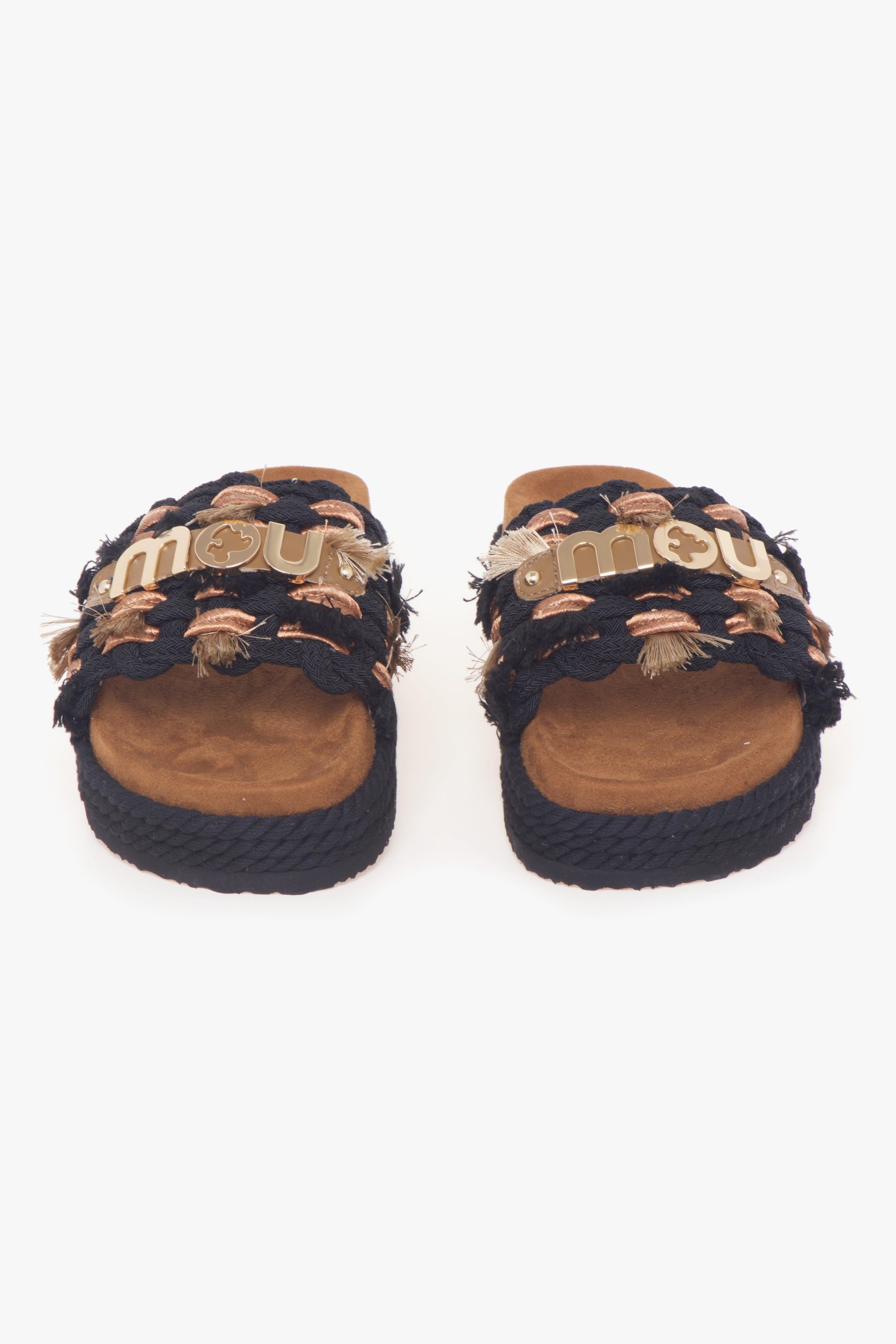 Scoprite la comodità fusionata con stile nella ciabatta Mou, perfetta per l'approccio alle giornate più calde. Fasciata in un elegante tessuto intrecciato, questa calzatura vanta frange sofisticate e un imponente logo in metallo dorato che aggiunge un tocco lussuregioso. Indossatele per aggiungere un edge sporty-chic al vostro look quotidiano o per complementare un abito lungo stampato. Dettagli del prodotto: - Sottopiede anatomico rivestito in tessuto morbido assicura un comfort duraturo. - La suola in gomma, leggerissima, è avvolta dallo stesso tessuto intrecciato del design superiore, mostrando una continuità stilistica. - Il pattern del battistrada in gomma offre una trazione ottimale. Ideale per la stagione PE24, la ciabatta Mou è l'incarnazione dell'eleganza casual. Ogni passo è un'affermazione di stile senza rinunciare alla comodità, rendendola la scelta prediletta per le donne che desiderano distingueri con classe ed eleganza.