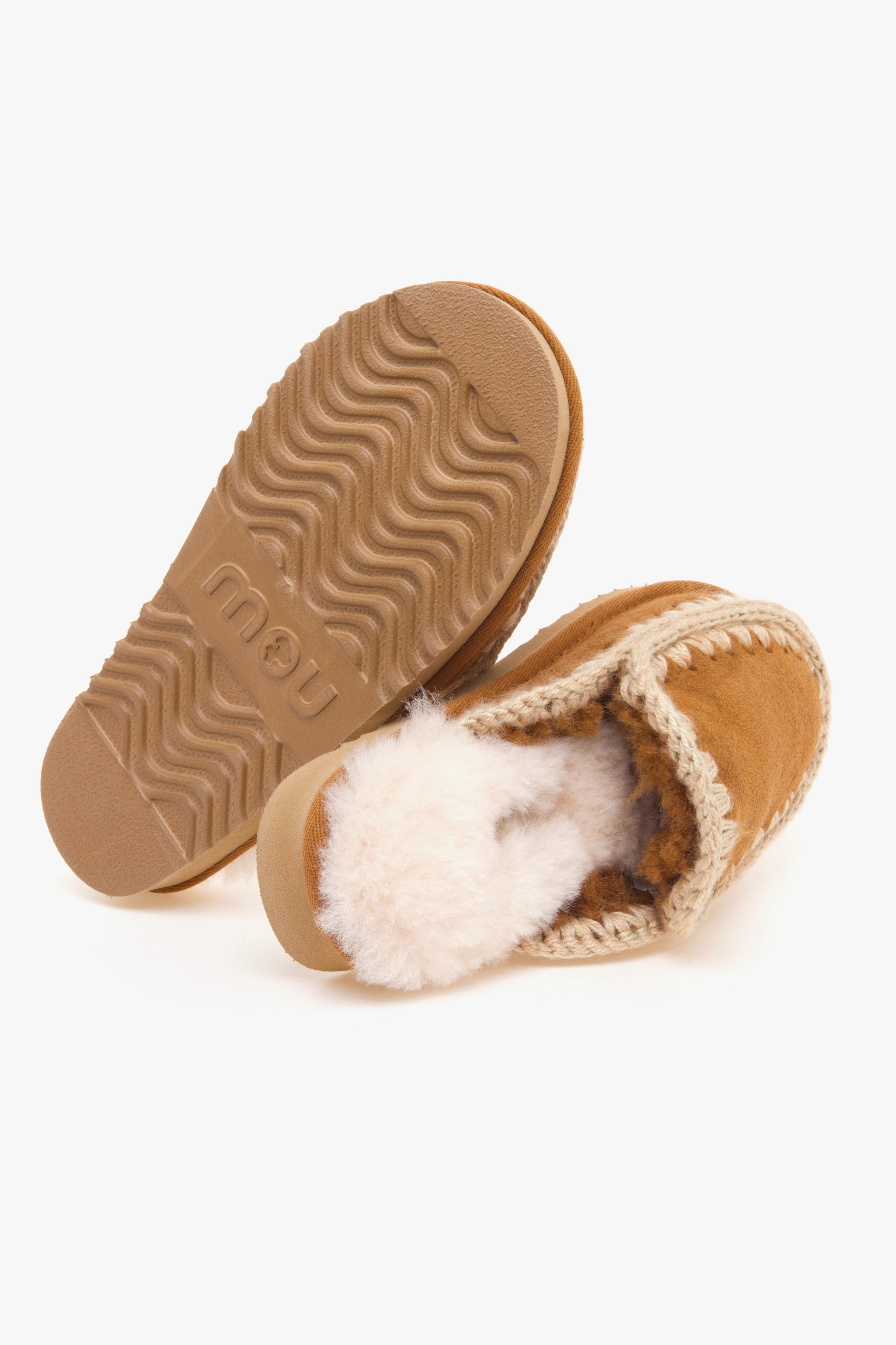 La slipper “Eskimo” firmata MOU è un modello iconico che combina artigianalità e comfort naturale. Realizzata a mano in vero montone double face, si distingue per le tipiche cuciture all’uncinetto in lana che rifiniscono il profilo con carattere distintivo. La fodera interna in montone regala calore e morbidezza avvolgente, mentre la suola in EVA leggera e battistrada in gomma assicurano stabilità e resistenza. Perfetta per i momenti di relax a casa o per completare look casual dallo stile cozy, è anche un’idea regalo raffinata e versatile.Caratteristiche principali:# Materiale esterno: montone double face naturale.# Fodera: 100% montone shearling.# Cuciture: fatte a mano all’uncinetto in lana.# Suola: EVA leggera con inserto in gomma e battistrada personalizzato.# Realizzazione: artigianale.# Uso: ideale per interni ed esterni, massima morbidezza e comfort.