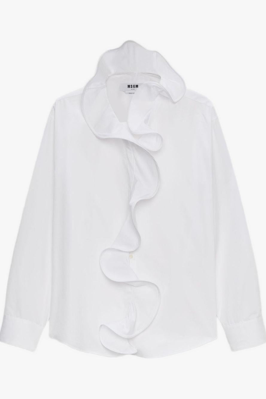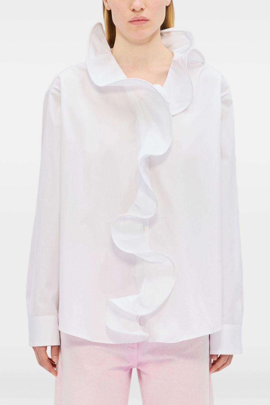 Proposta in bianco, si distingue per le rouches che decorano il fronte e per il collo oversize, dettaglio di ispirazione rétro reinterpretato in chiave moderna. Le maniche lunghe e la chiusura a bottoni completano un modello raffinato e versatile, perfetto da indossare con pantaloni sartoriali o denim per un look sofisticato e d’impatto.