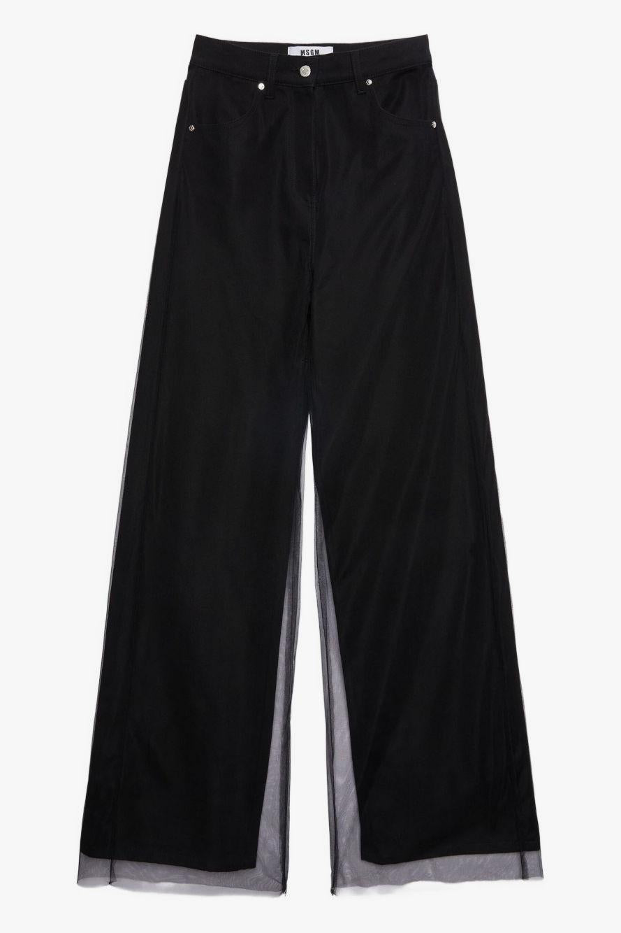 Proposti in nero, si distinguono per gli inserti in tulle che creano un raffinato gioco di trasparenze e per i dettagli color argento, che aggiungono luminosità e modernità. Il design a cinque tasche e i passanti in vita mantengono l’ispirazione classica del denim, reinterpretata secondo il linguaggio creativo di MSGM.