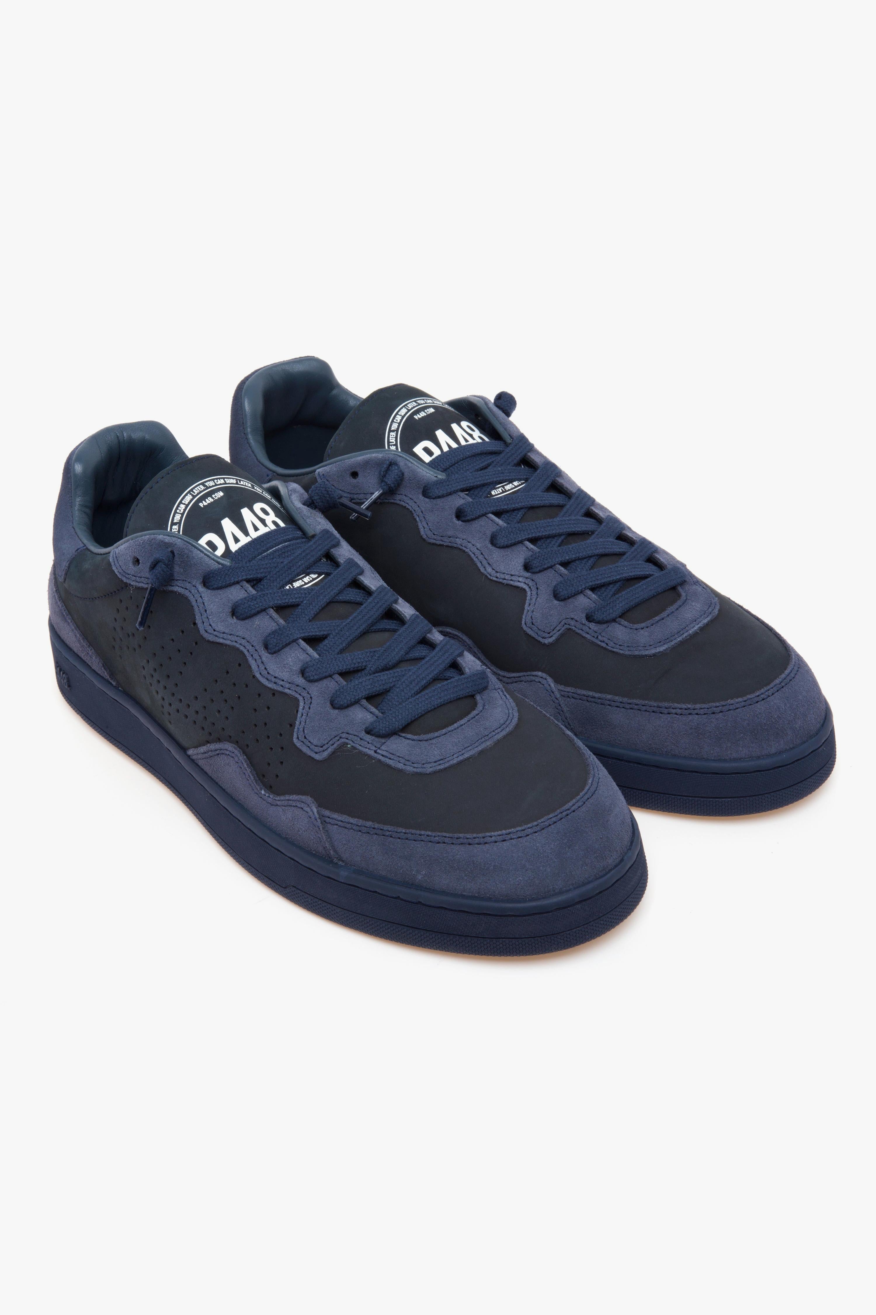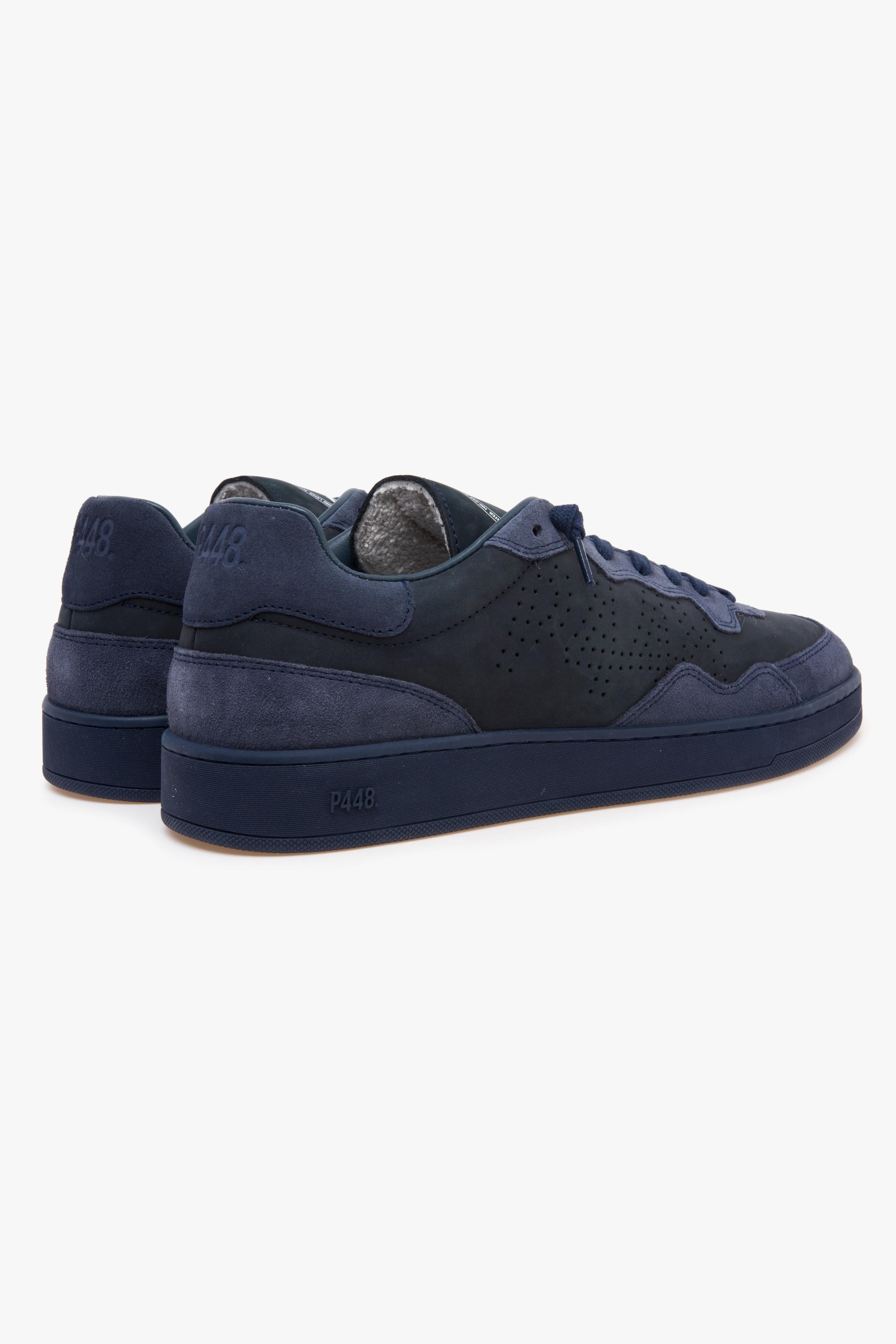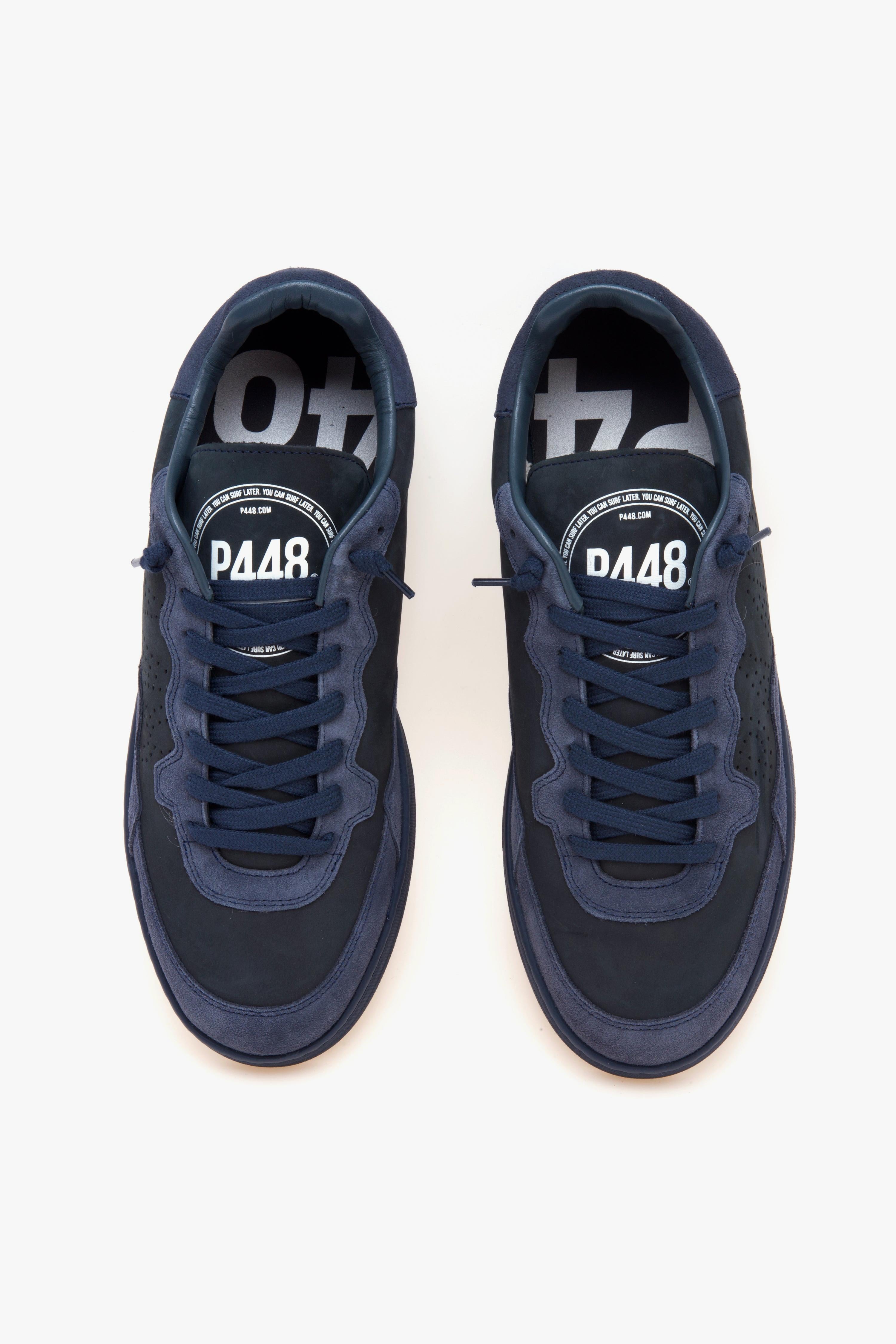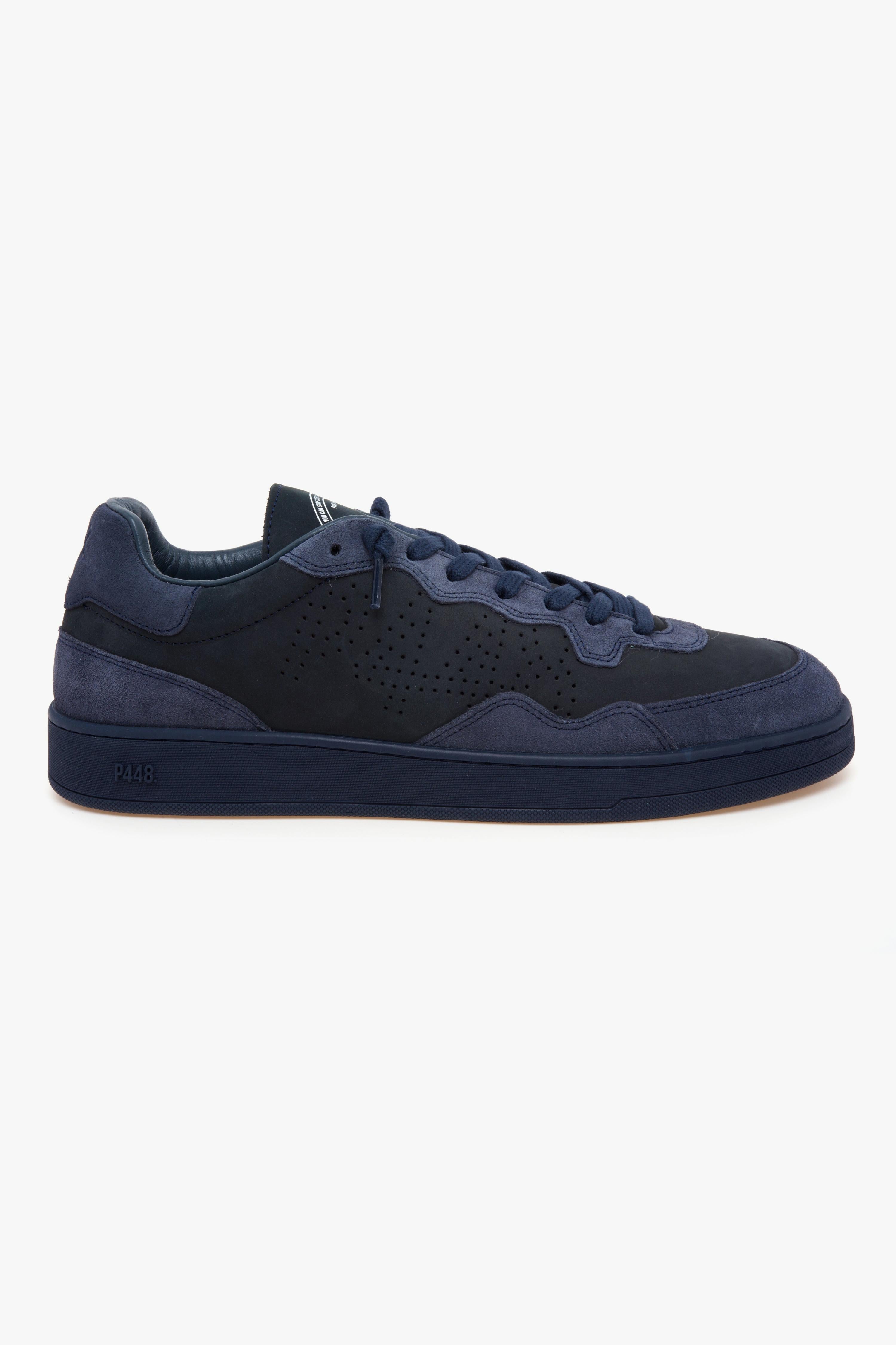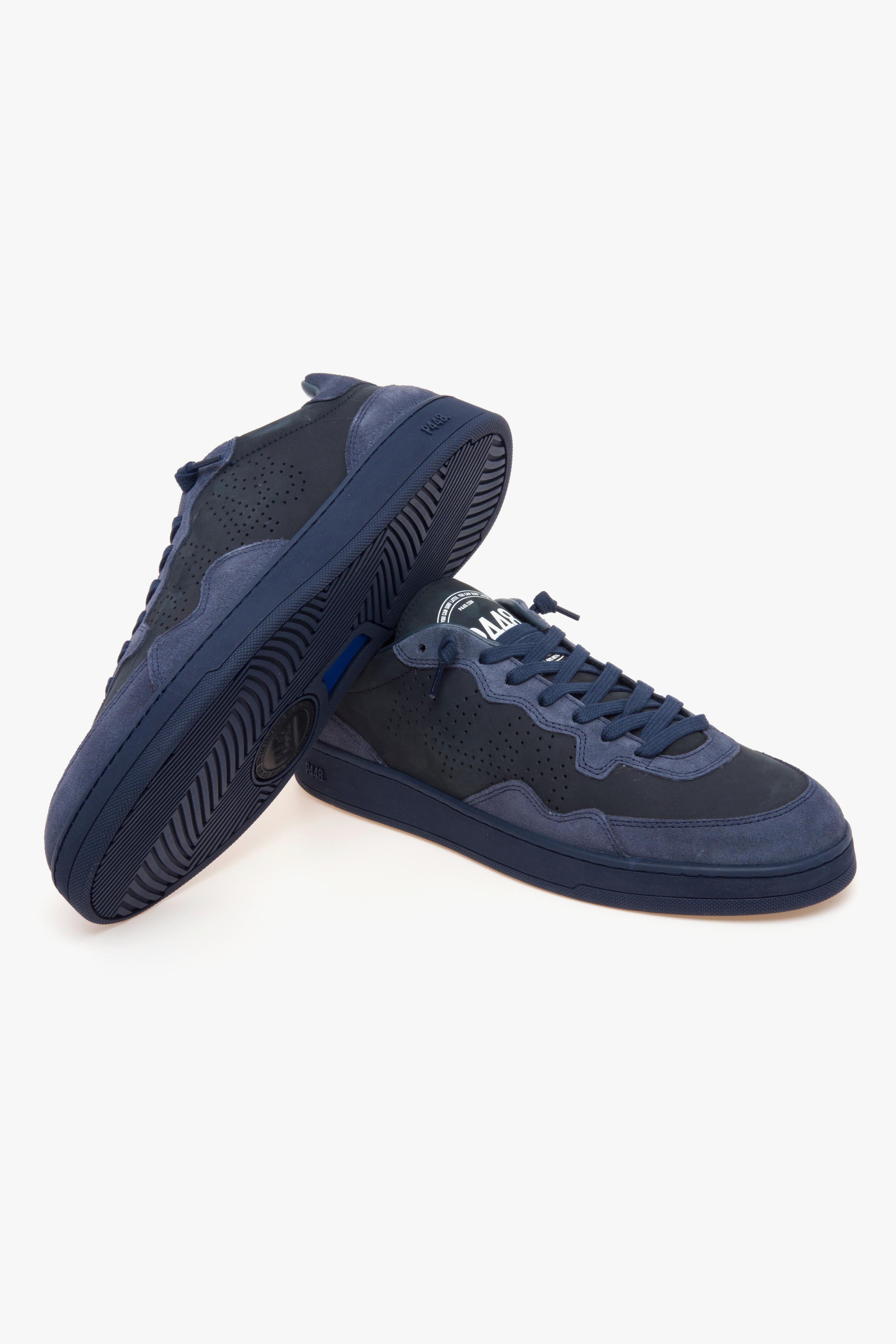 Linee essenziali e carattere urbano definiscono P448 Vert All Blue, una low-top dal look monocromatico che combina texture morbide e comfort tecnico. La tomaia in nabuk blu scuro è rifinita da inserti in suede tono su tono e lacci in cotone blu, mentre l’interno in spugna e la soletta in memory foam assecondano il passo nel quotidiano. La suola in gomma firmata P448 riprende il mondo dello skate con battistrada a spina di pesce e pivot point per maggiore grip, in un equilibrio di stile e funzionalità pensato per la città. Caratteristiche principali:# Modello: Vert All Blue (uomo) .# Tomaia: pelle nabuk blu scuro con rifiniture in suede; linguetta e punta in nabuk blu scuro .# Soletta: memory foam estraibile (indicata come memory-foam insole).# Suola: gomma P448 con battistrada a spina di pesce e pivot point; tread blu scuro.# Lacci: cotone blu scuro