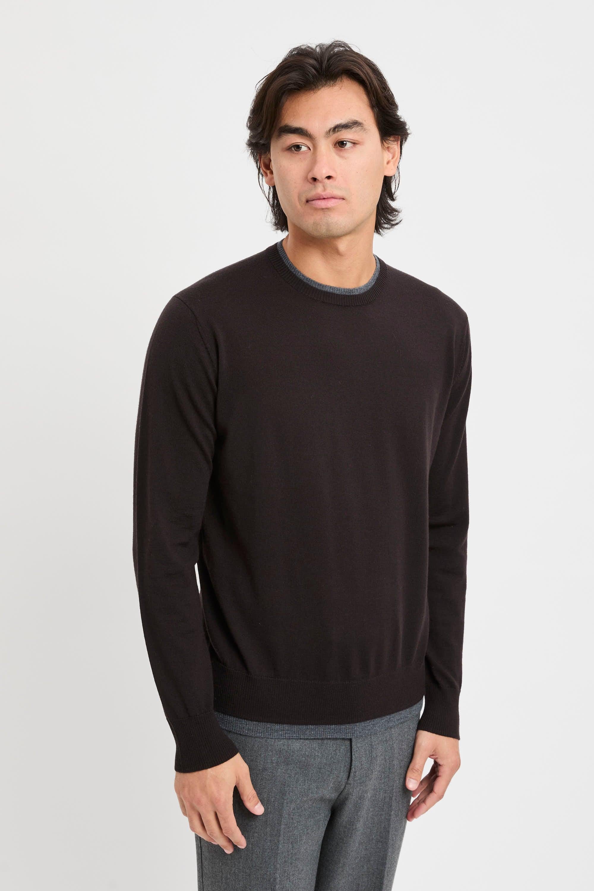 - Maglia girocollo in lana merino extrafine- Profili a contrasto su collo e fondo- Finiture a costineColore: MarroneIl modello indossa la taglia M, è alto 1.83 cm e pesa 72 kg.STAGIONE: AUTUNNO INVERNO 2025/2026COD: A007 F001 2358Materiale: 100% Lana vergine