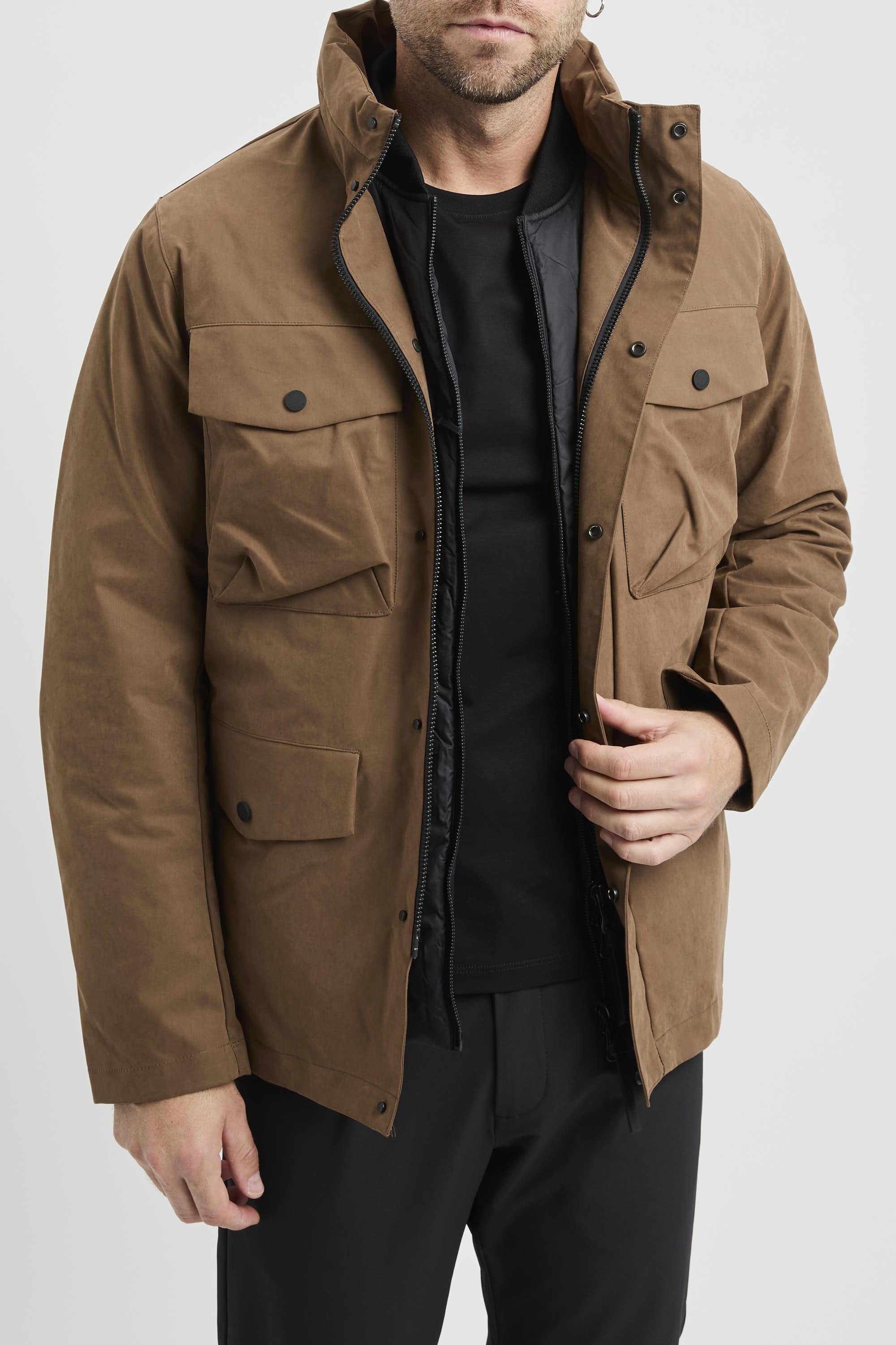 Field jacket tecnico in microfibra con membrana pensato per affrontare pioggia, vento e sbalzi termici con un unico capo modulare. Il cappuccio ripiegato nell’interno collo è pronto quando serve, mentre le nastrature termosaldate e le numerose tasche esterne e interne proteggono l’essenziale e tengono tutto in ordine. La zip pressofusa a doppio cursore con finta chiusura a bottoni a pressione unisce praticità e pulizia visiva. All’interno, un giubbino imbottito staccabile in PRIMALOFT® (collo bomber) aggiunge isolamento termico tecnico, traspirabilità e comfort: si indossa insieme alla shell nelle giornate più rigide oppure da solo nelle mezze stagioni. Dettagli brand su entrambe le maniche, inclusa la rubber label con le coordinate dello Shibuya Crossing.Caratteristiche principali:# Tessuto: microfibra con membrana.# Cappuccio ripiegato nell’interno collo (main fabric).# Nastrature termosaldate per protezione dagli elementi.# Chiusura frontale con zip pressofusa doppio cursore e finta chiusura con bottoni a pressione (superiori a vista personalizzati).# Tasche esterne: basse con pattina e bottoni; alte applicate con pattina e bottoni.# Tasche interne termonastrate con zip (porta-cellulare e porta-documenti).# Badge brand su manica sinistra. # Rubber label su manica destra con coordinate Shibuya Crossing.Giubbino interno staccabile (imbottitura PRIMALOFT®):# Collo bomber; collo e polsini in costina anti-pilling.# Zip pressofusa doppio cursore con tiretto personalizzato.# Tasche esterne: basse a filetto con bottone a pressione; tasca superiore destra con zip.# Inserti sottomanica in mesh traspirante.# Tasche interne termonastrate con zip (porta-cellulare e porta-documenti).# Badge brand su manica sinistra.# Rubber label su manica destra con coordinate Shibuya Crossing.