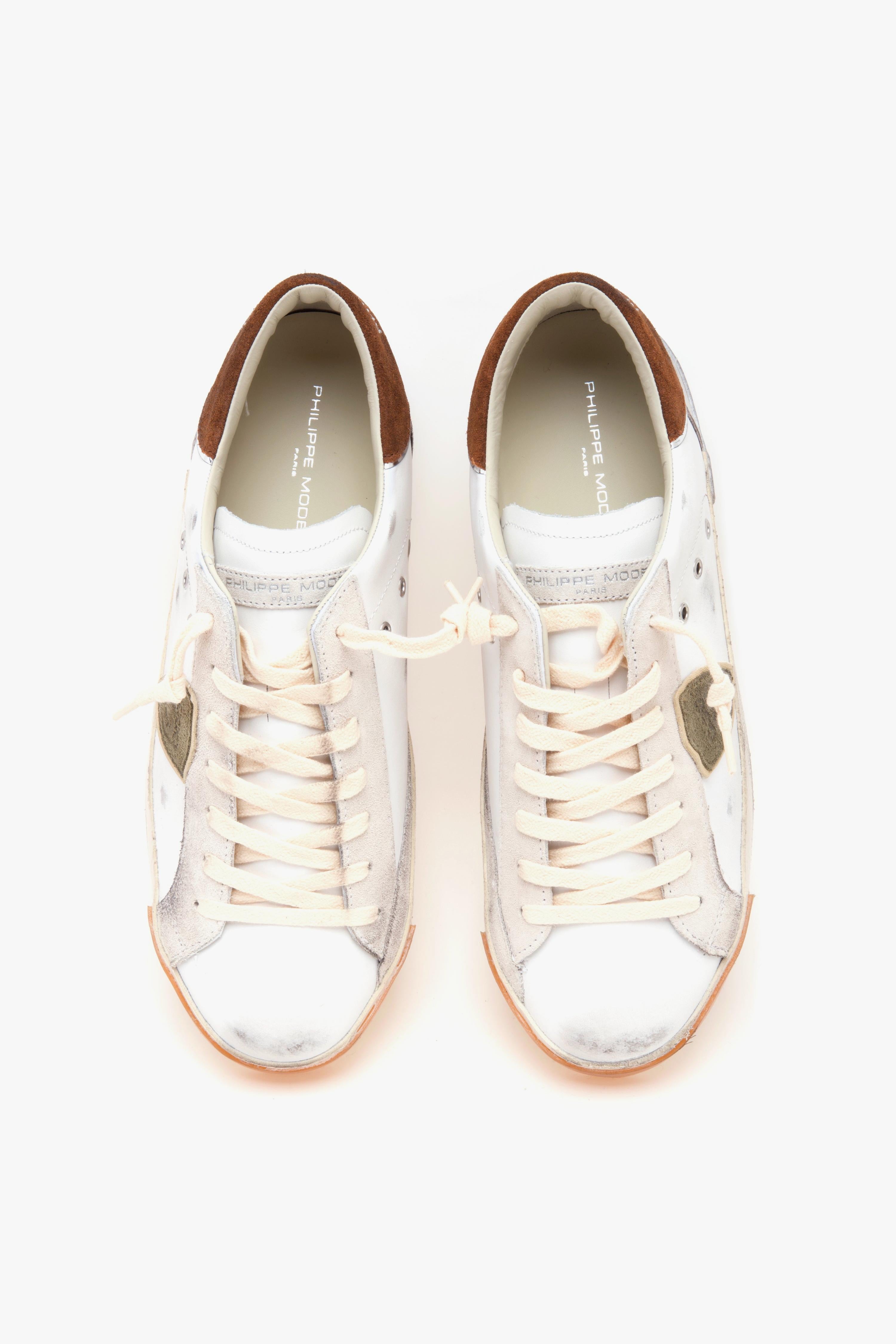 Una rilettura contemporanea del classico Philippe Model PRSX Uomo, pensata per muoversi con naturalezza tra look raffinati e outfit casual. La tomaia interamente in pelle di vitello è arricchita da inserti in suede effetto vintage tono su tono, mentre il talloncino in camoscio marrone e l’iconico scudo laterale in camoscio verde aggiungono profondità cromatica e carattere. Il profilo conserva la cifra artigianale della linea: la fasciatura della suola volutamente irregolare e la finitura worn out creano un effetto vissuto equilibrato, impreziosito da un inserto argento effetto vintage sul tallone e da un inserto color caramello sulla parte anteriore. All’interno, fodera in pelle e spugna di cotone e soletta estraibile assicurano comfort quotidiano in un insieme leggero, fedele all’estetica francese del brand.Caratteristiche principali:# Modello: Philippe Model PRSX Uomo – PRLU-VDP1.# Tomaia: pelle di vitello con inserti in suede effetto vintage; talloncino in camoscio marrone; scudo laterale in camoscio verde.# Finitura: worn out con fasciatura della suola a linee irregolari; inserto argento vintage sul tallone e inserto color caramello sul davanti.# Fodera: pelle e spugna di cotone.# Soletta: estraibile.# Suola: altezza 2,5 cm.# Materiali: realizzata con materiali italiani.