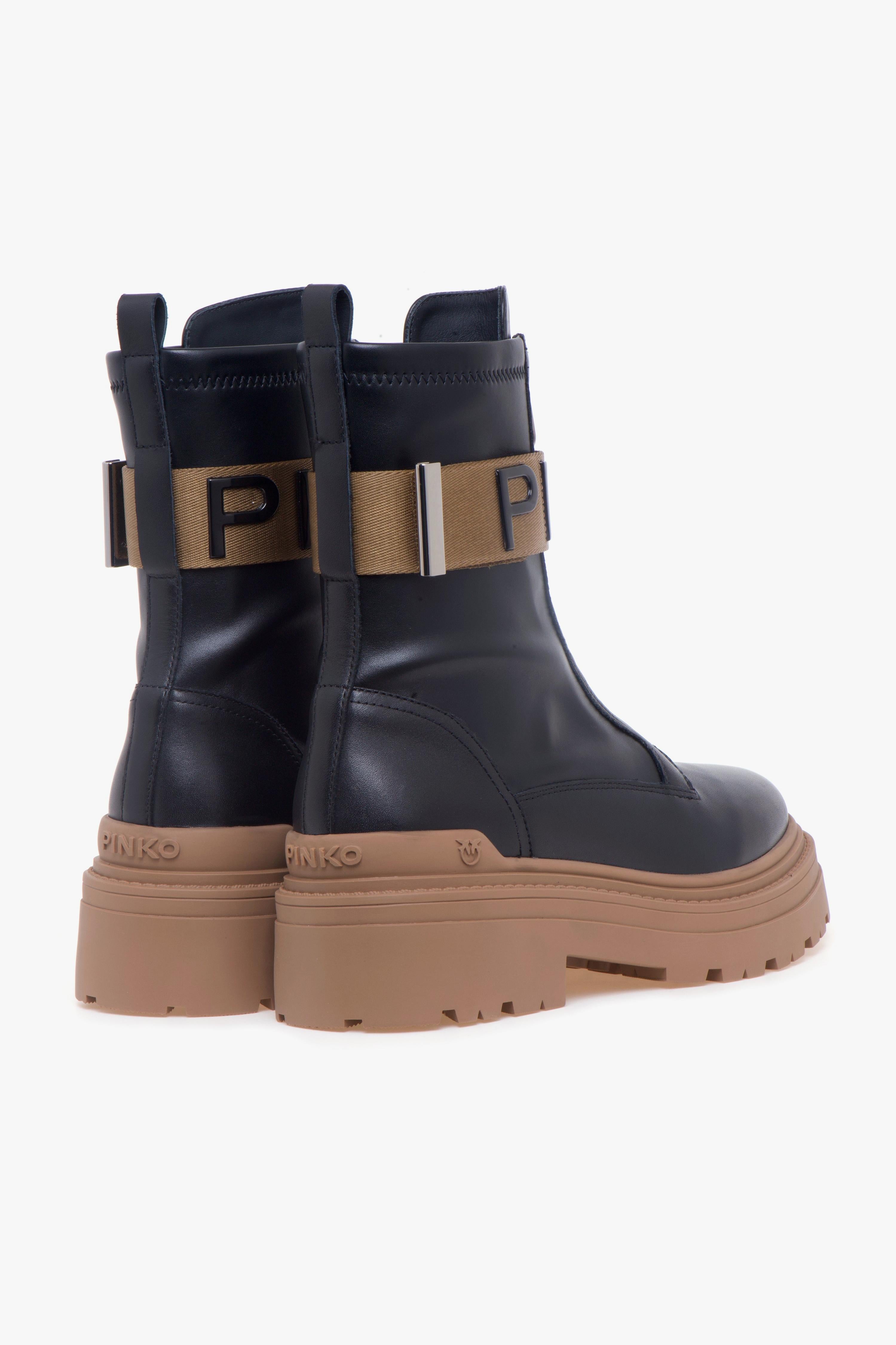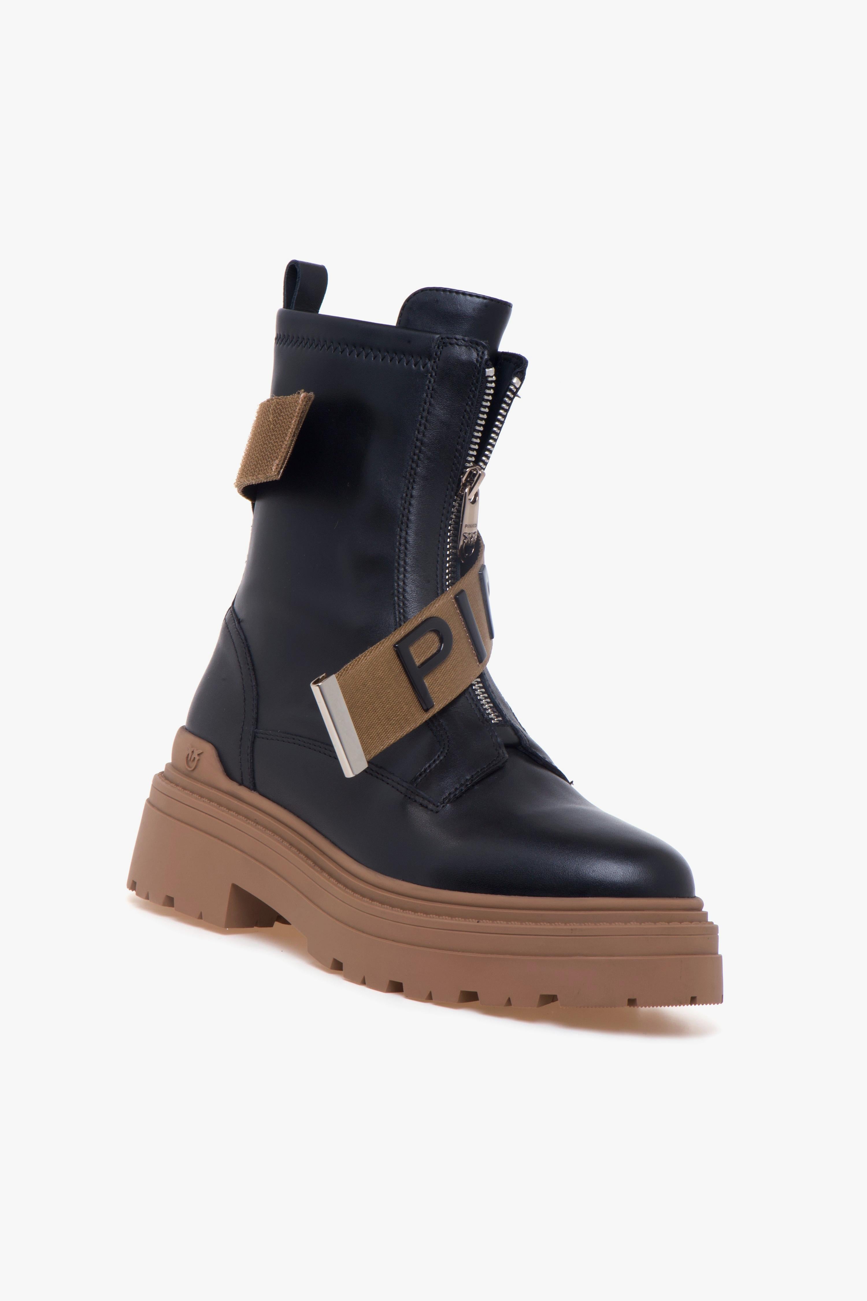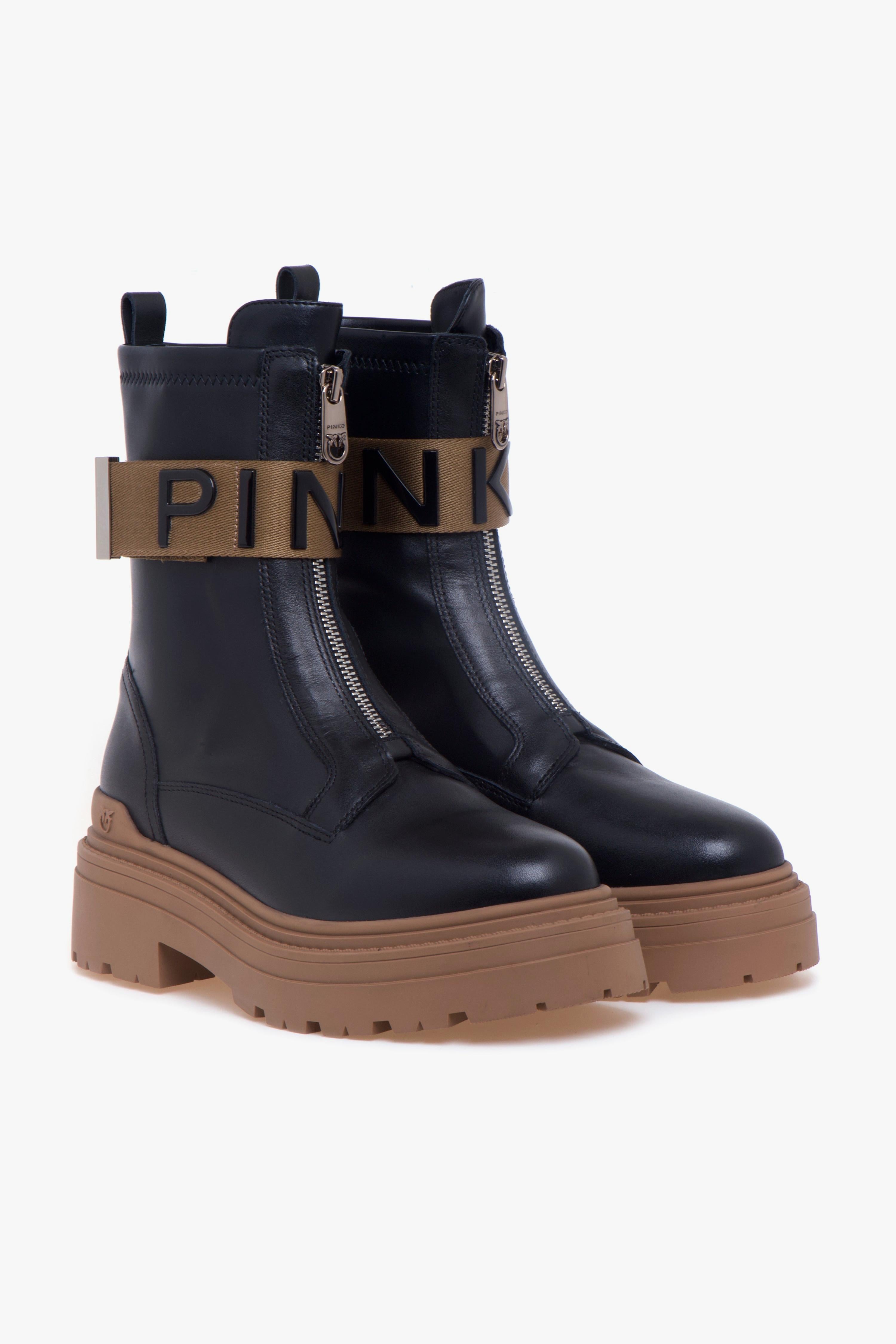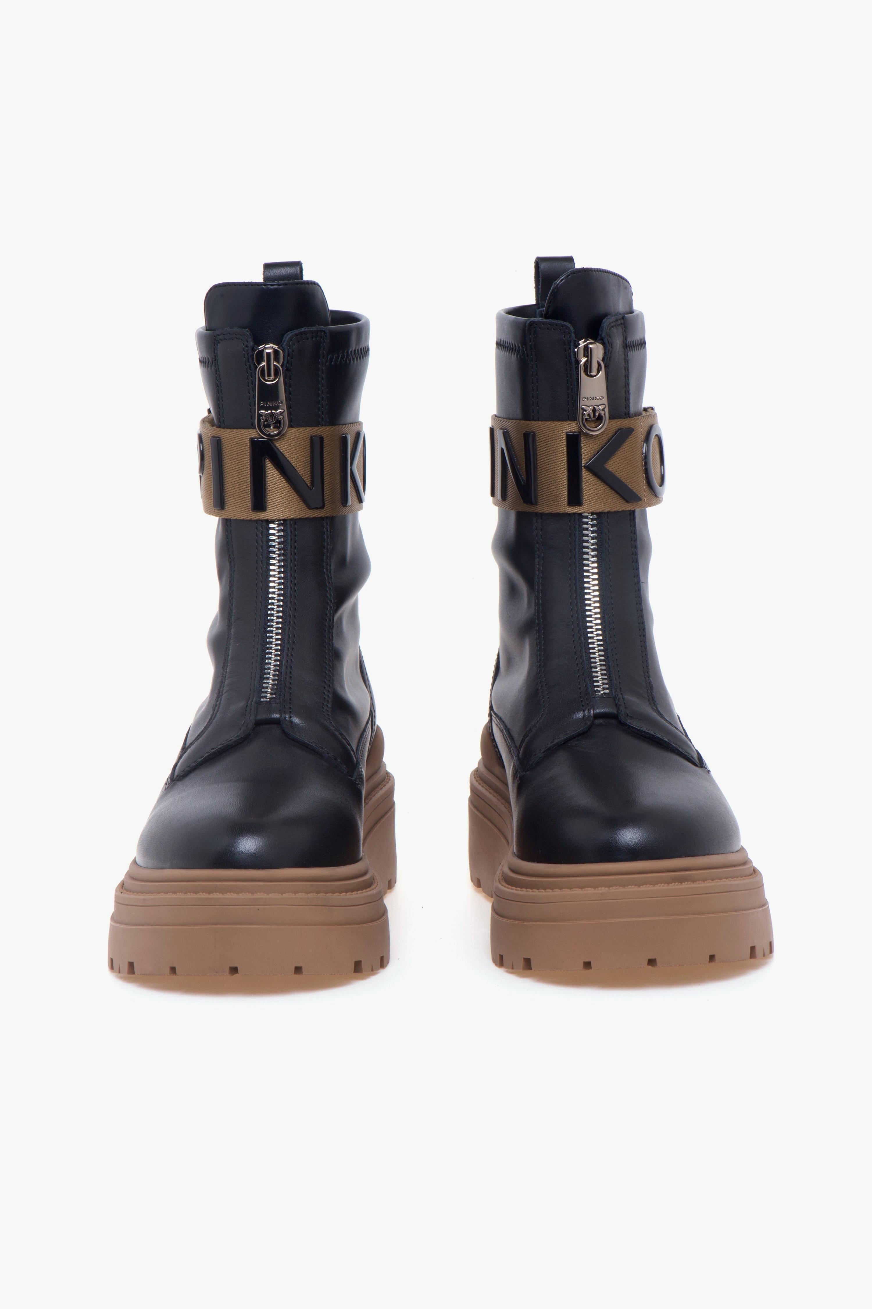 Anfibio PINKO in pelle dal carattere urban-chic con gambale a 3/4 dalla linea pulita impreziosita con zip frontale che garantisce una calzata rapida e agevole. La suola in gomma con platform e battistrada a carrarmato (5,5 cm) assicura slancio, grip e leggerezza, mentre la fodera e il sottopiede in pelle garantiscono comfort e traspirabilità per tutta la giornata.A firmare il design, la fascia in nastro tecnico con logo lettering PINKO: un dettaglio grafico che rende il modello subito riconoscibile. Moderni e versatili, questi anfibi sono perfetti per completare look casual e grintosi con un tocco contemporary.Caratteristiche principali:# Tomaia 100% pelle.# Gambale 3/4.# Zip frontale e tirante posteriore.# Fodera e sottopiede in pelle.# Suola platform carrarmato in gomma – 5,5 cm.# Fascia in nastro tecnico con logo lettering PINKO.