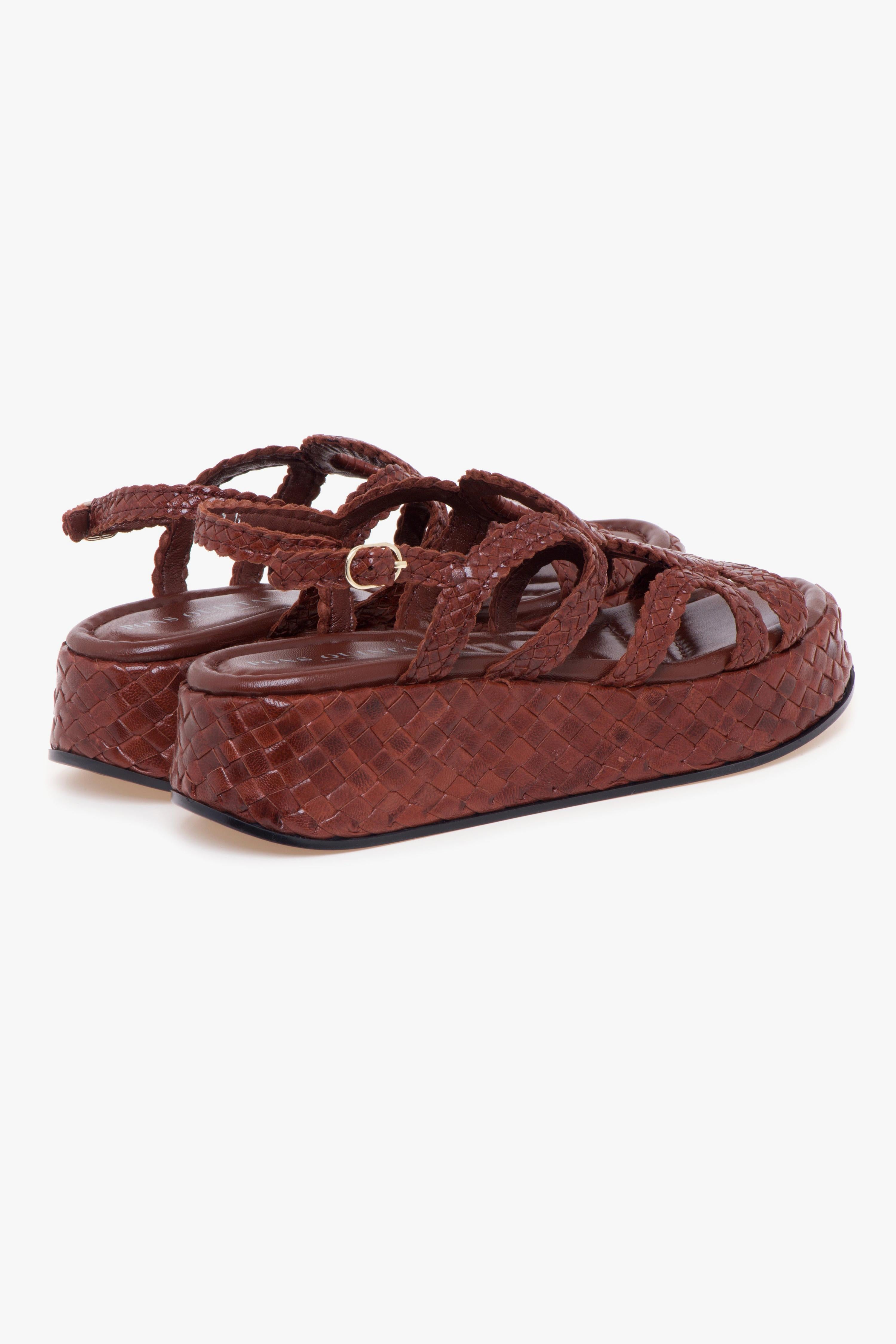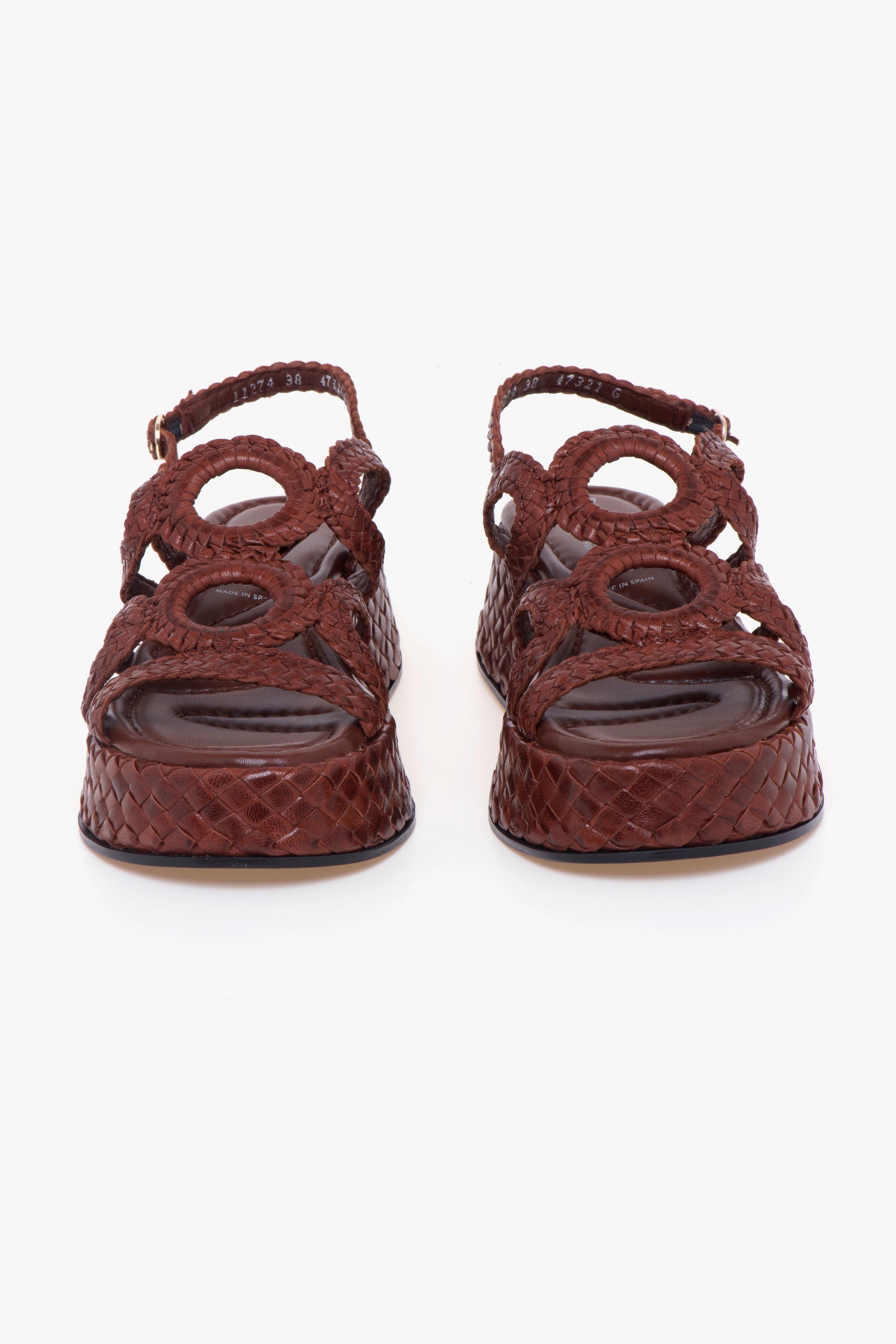 Realizzato interamente in pelle intrecciata, questo sandalo flat firmato Pons Quintana si distingue per l’equilibrio tra artigianalità e design contemporaneo. La tomaia è composta da eleganti cerchi in pelle intrecciata che decorano il collo del piede, donando un tocco originale senza rinunciare alla sobrietà. Il platform, anch’esso rivestito in pelle intrecciata, presenta un'altezza di 45 mm sul tallone e 30 mm nella parte anteriore, offrendo una leggera elevazione e un’andatura confortevole. Completano la struttura la fodera in pelle, il sottopiede imbottito e la suola in gomma che garantisce stabilità.Ideale da indossare con abiti in lino o pantaloni cropped, per un look estivo raffinato e disinvolto. # Altezza del platform nel tallone: 45 mm.# Altezza del platform davanti: 30 mm. # Tomaia in pelle. # Fodera in pelle.# Sottopiede in pelle imbottito. # Battistrada in gomma.