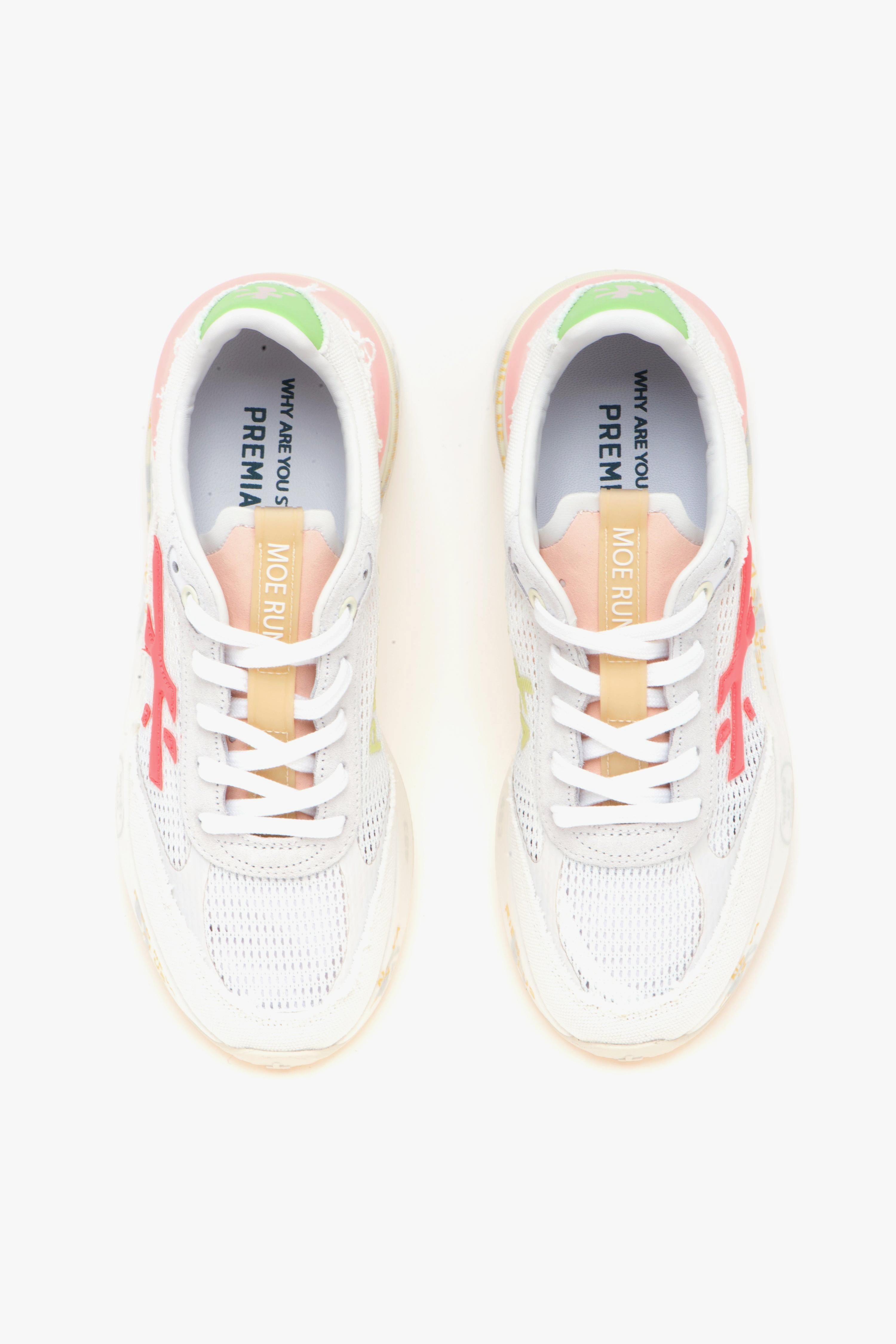 MoeRun è l’innovativa sneaker firmata Premiata che in un’unica calzatura unisce tecnologia all’avanguardia e stile inconfondibile. Questa versione, ideale per l'estate, si distingue per la tomaia in canvas impreziosita con inserti retinati sui lati e sulla punta che contribuiscono a mantenere il piede fresco in ogni momento della giornata. Il suo look è inoltre impreziosito con l'iconico logo in color corallo ed il talloncino in pelle verde menta. Infine, ne completa il design, l'innovativa suola in gomma super soffice che tra le altre è anche tra le più leggere mai realizzate da Premiata e caratterizzata dall'iconica livrea brevettata che contraddistingue tutti i modelli del brand. Internamente, la fodera è in pelle e tessuto mentre il sottopiede removibile è in pelle. Grazie al loro confort eccezionale e al design casual-chic, saranno le tue compagne ideali per la nuova stagione!