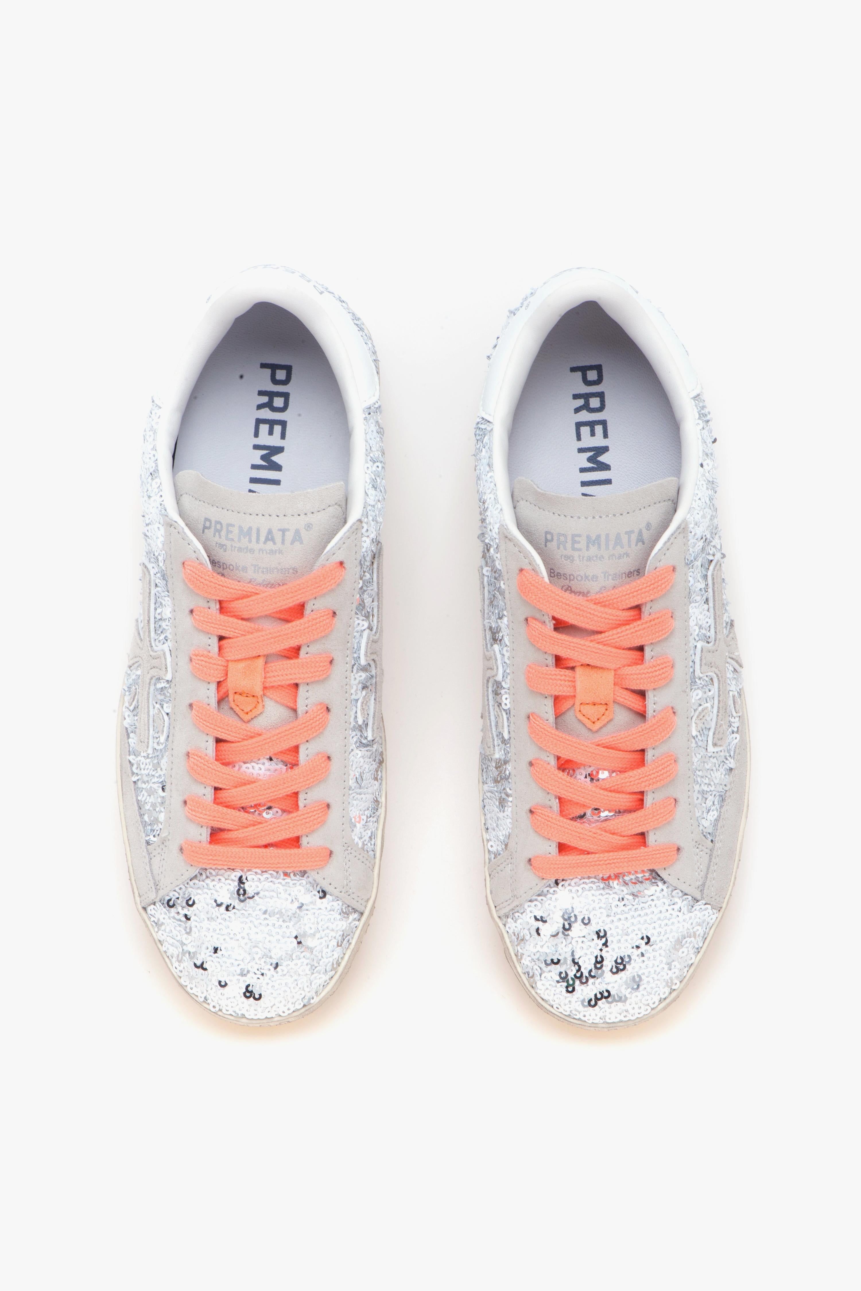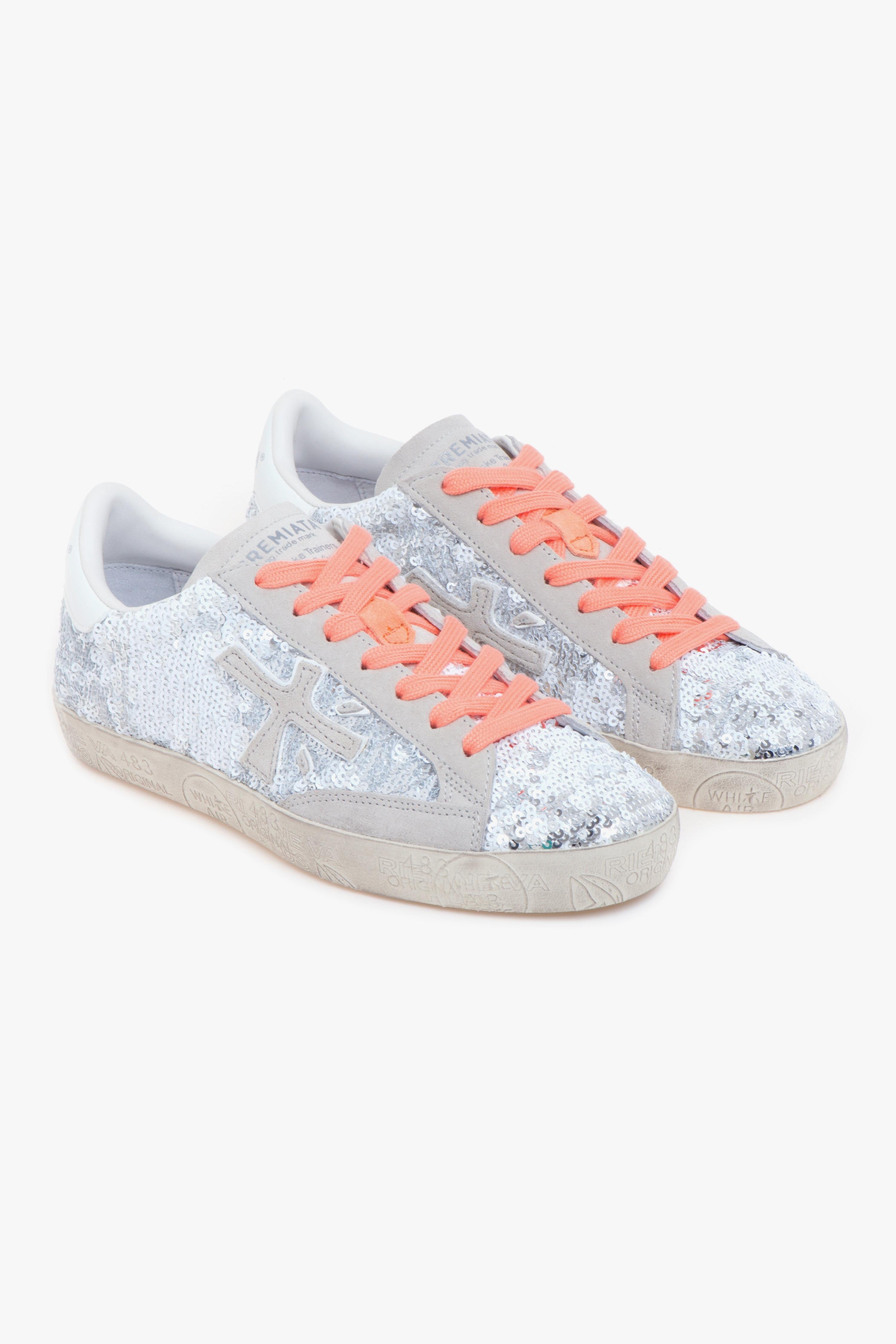 Realizzata interamente con paillettes double-face bianco e argento, questa versione speciale di Premiata Steven, presenta un look estremamente chic e ricercato. La tomaia, si distingue appunto per le molteplici sfaccettature delle paillettes che regalano un gioco di riflessi e brillantezza unici a seconda della luce circostante. Completano il look di questa preziosa sneaker, il logo e gli inserti in camoscio ghiaccio, il talloncino in pelle bianca e i lacci color pesca. Internamente, la fodera è in pelle ed il sottopiede, anch'esso in pelle è estraibile. La suola in gomma, presenta infine l'iconica livrea Premiata a rilievo.