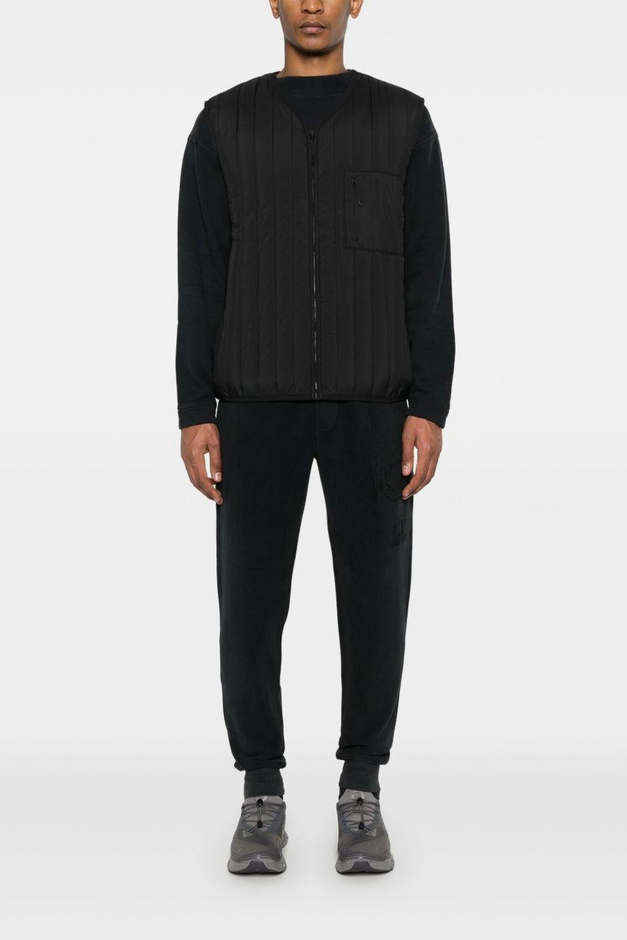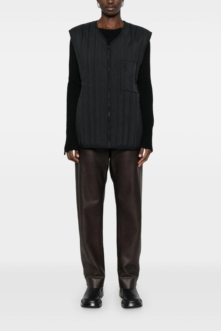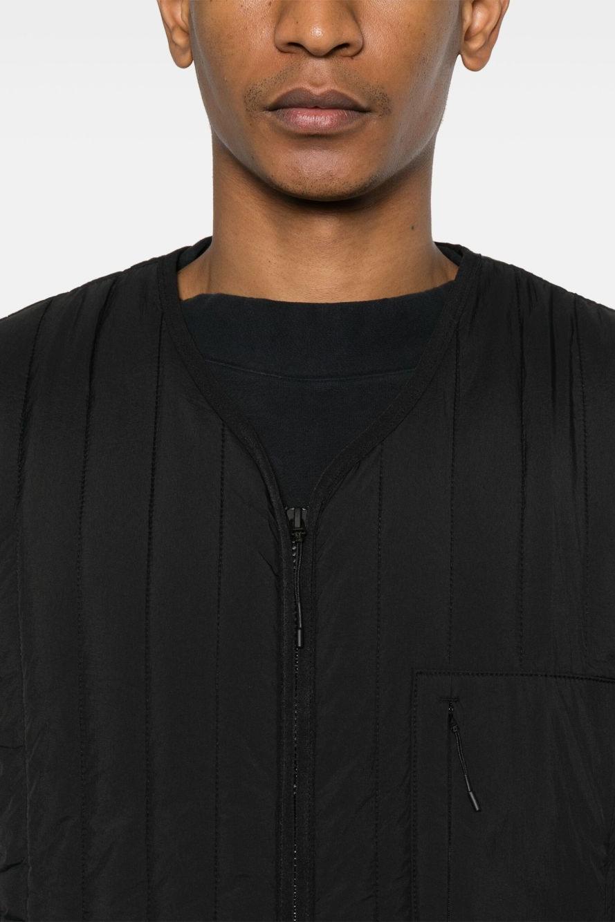 Proposto in nero, presenta un design trapuntato con scollo a V, chiusura frontale con zip e struttura senza maniche per la massima libertà di movimento. Le due tasche laterali a filetto e la tasca con zip sul petto aggiungono praticità e carattere tecnico, mentre l’orlo dritto garantisce una linea pulita e moderna.