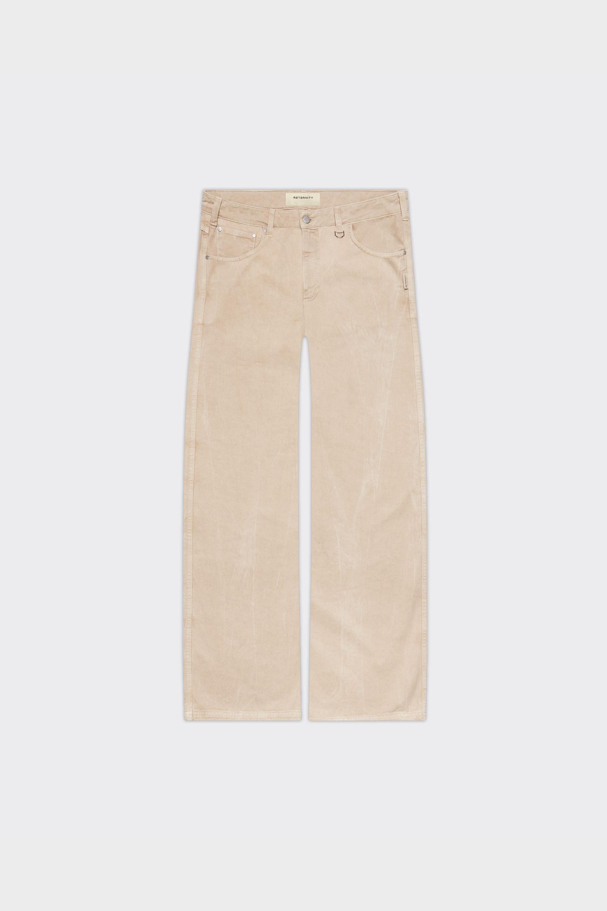 Colore sabbia, tessuto canvas con effetto stropicciato. Tasche anteriori e posteriori semplici, cuciture visibili sui lati.