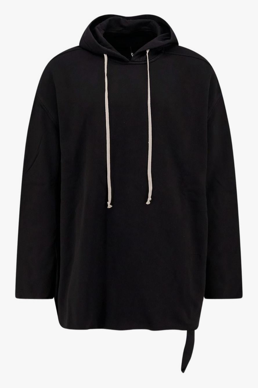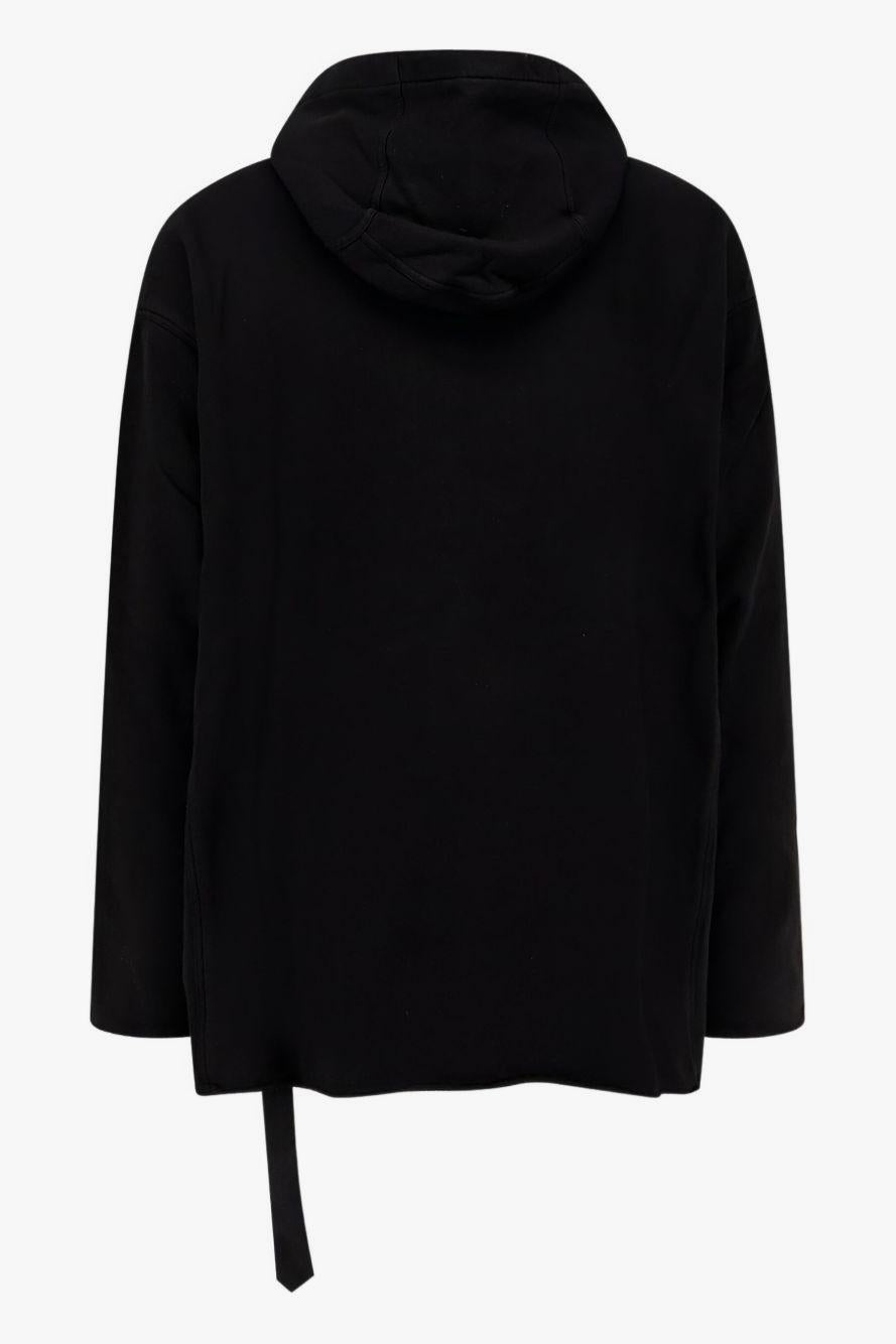 Il colore nero, cifra stilistica ricorrente nelle creazioni di Rick Owens, esalta la purezza delle linee e la costruzione minimal del capo. Lo scollo con cappuccio dona un’impronta casual e contemporanea, mentre le maniche lunghe con spalla bassa contribuiscono a un fit rilassato e leggermente oversize. L’orlo con coulisse permette di regolare il volume e aggiunge un dettaglio tecnico-funzionale, in pieno stile Owens.