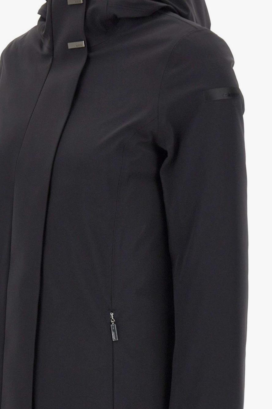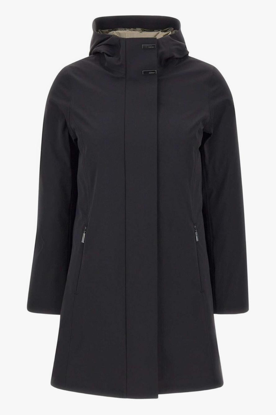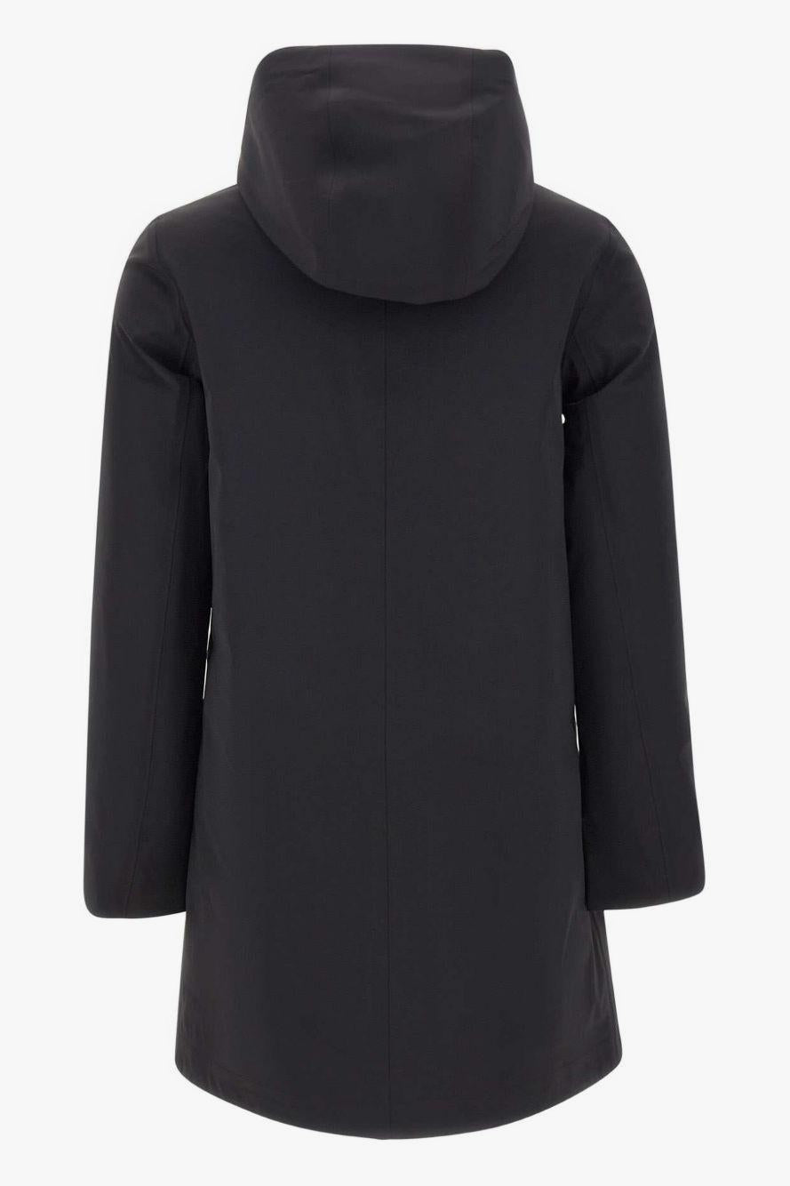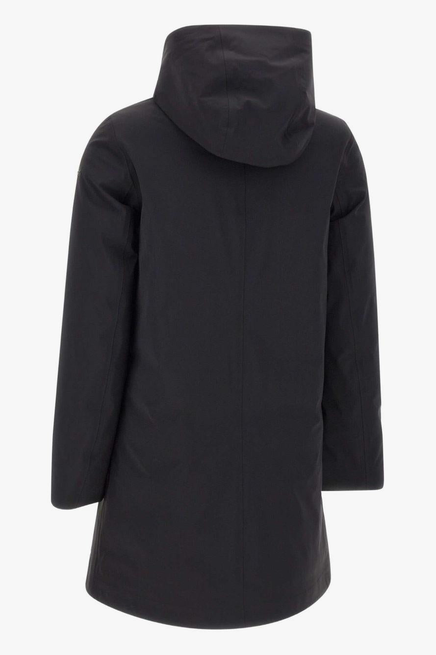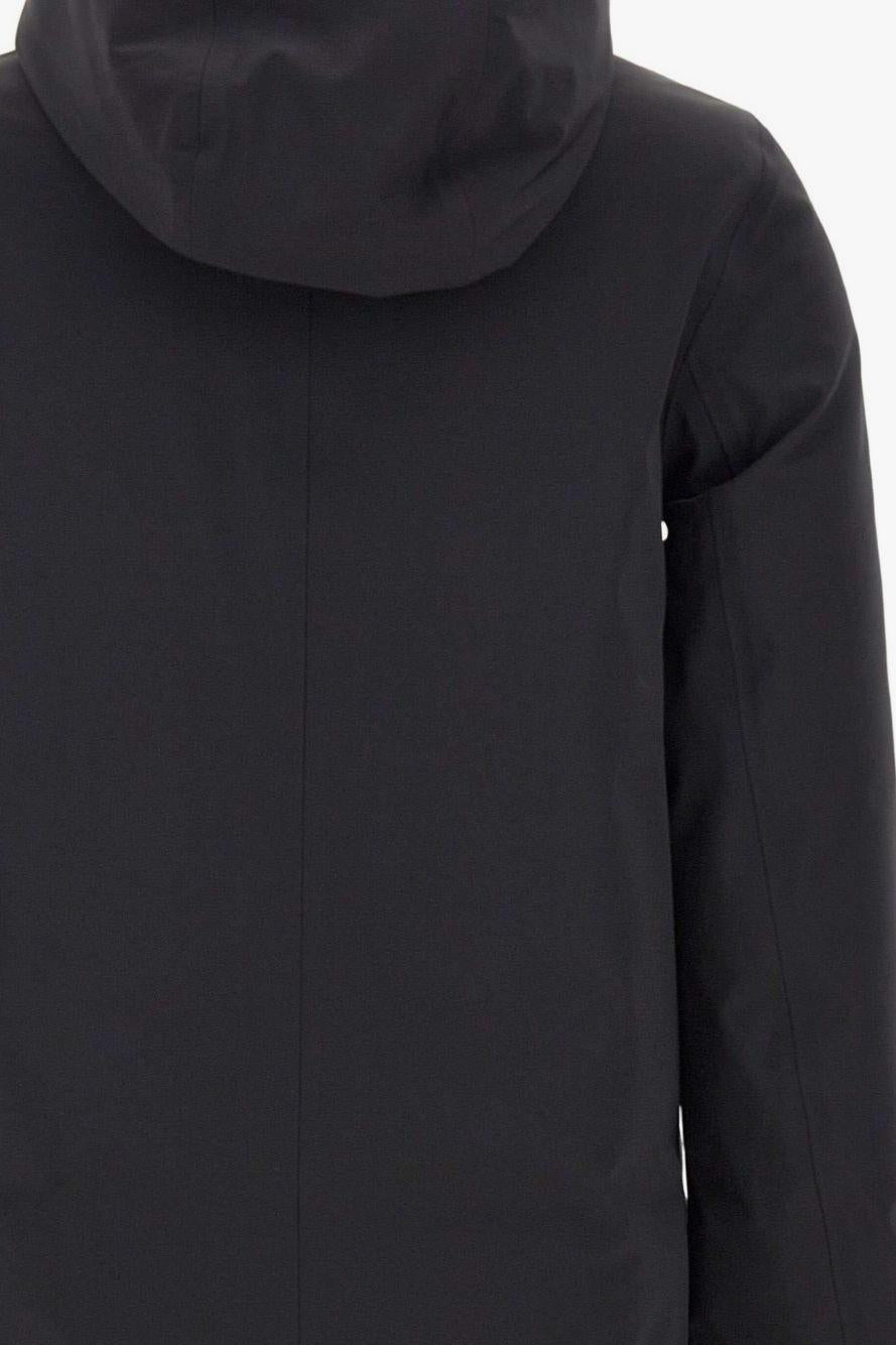 Proposta in nero, presenta cappuccio imbottito, chiusura frontale con zip e bottoni a pressione nascosti per un design pulito e raffinato. Il dettaglio logo e la finitura opaca completano il look con uno stile moderno e discreto, perfetto per affrontare la stagione fredda con comfort e classe.