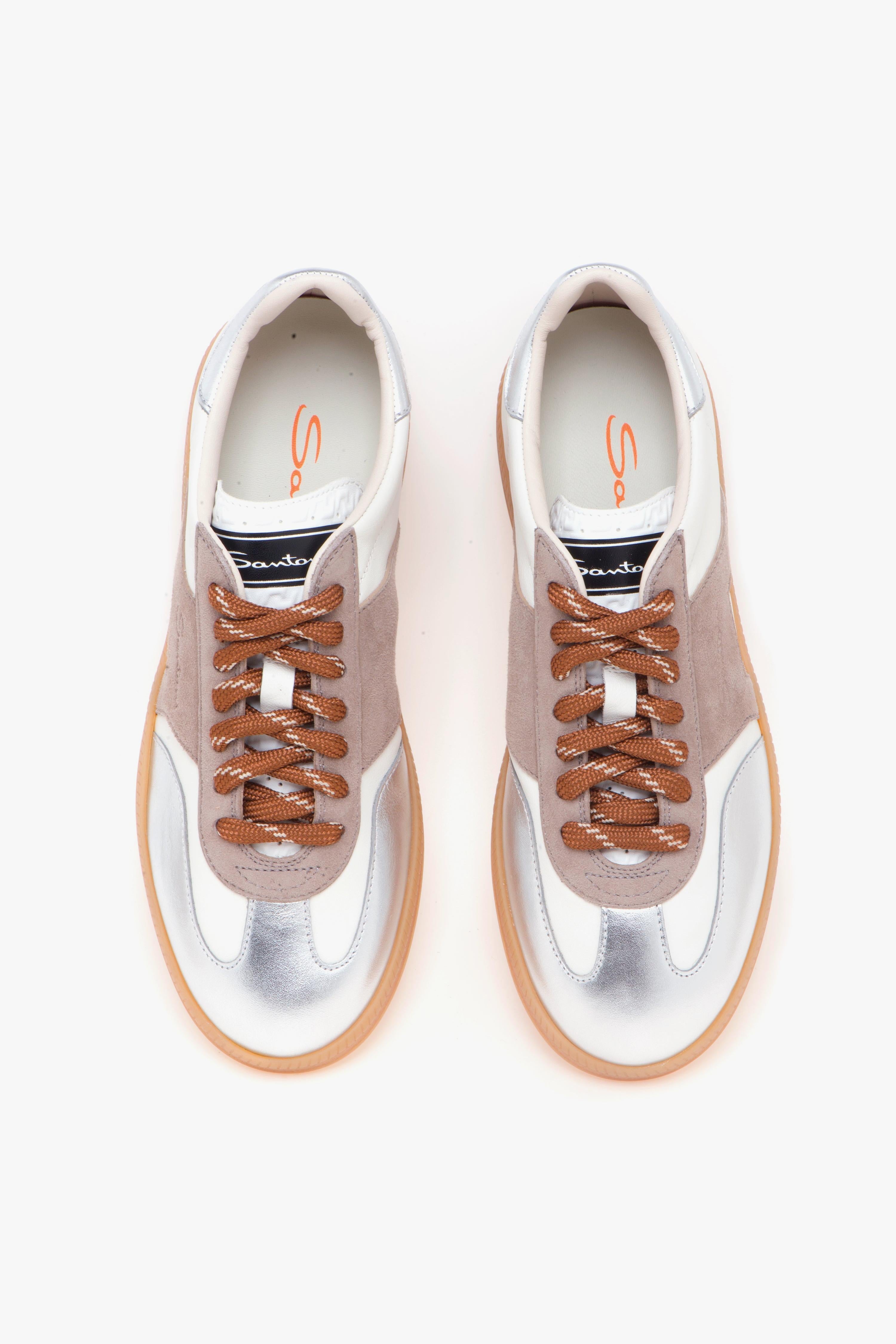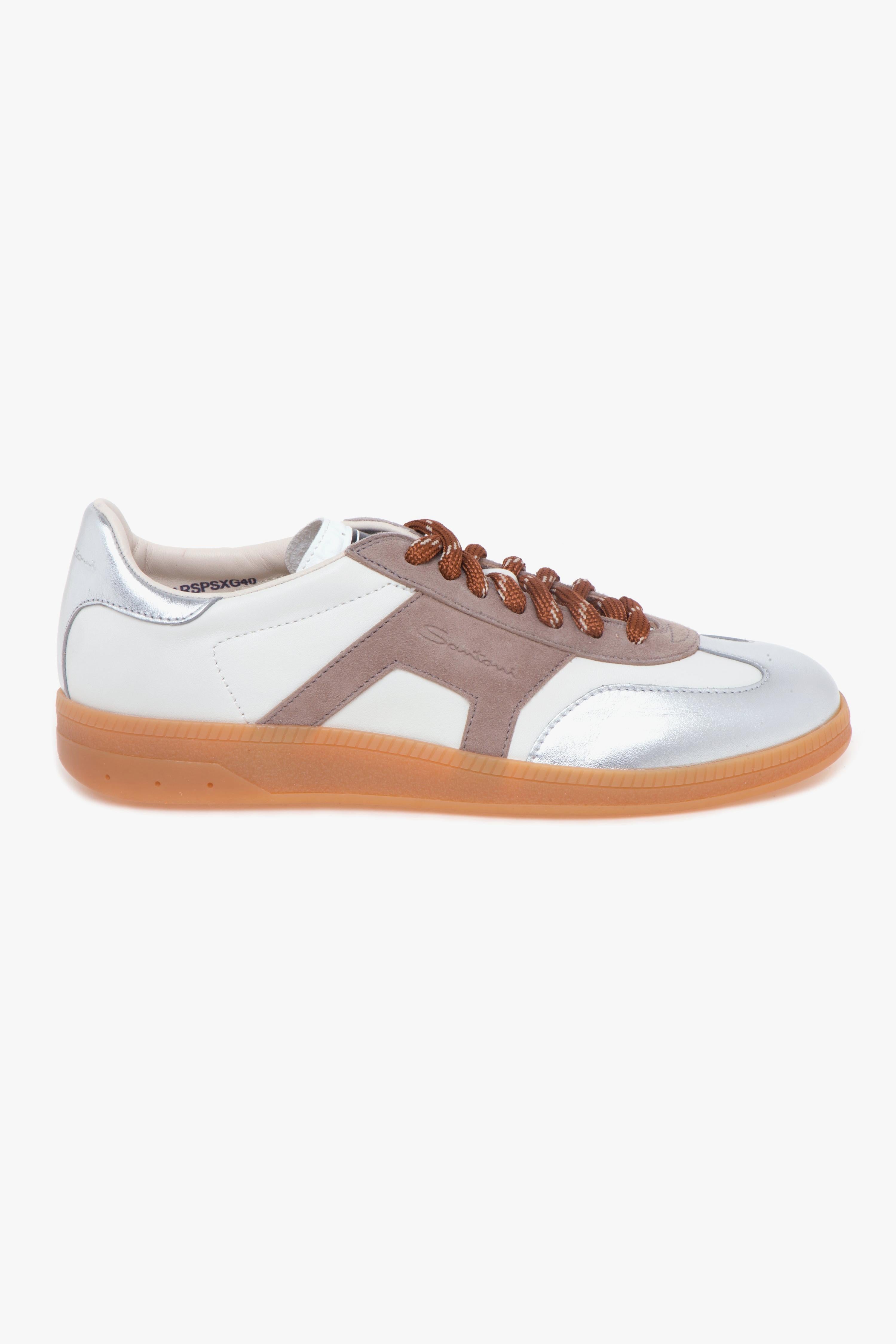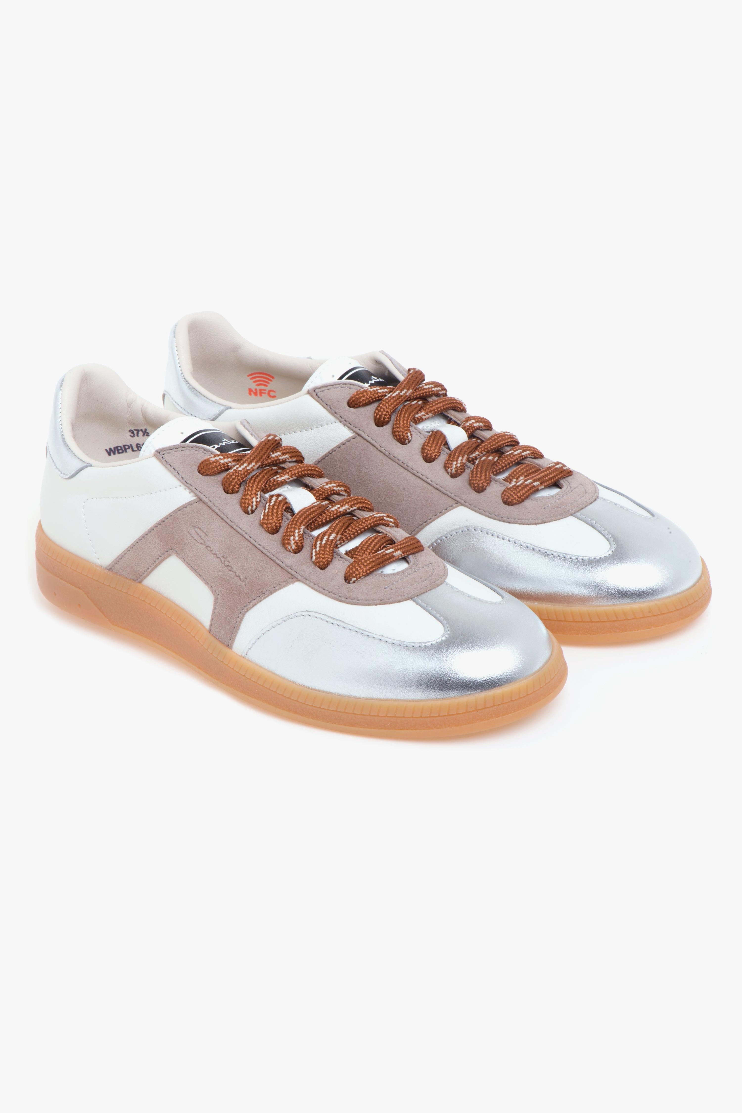 DBS Olympic è la sneaker firmata Santoni ispirata alla calzature che hanno fatto la storia negli anni '70.Presenta una silouette slanciata ed impreziosita dall'iconica "doppia fibbia" stilizzata e in colore a contrasto che rende inconfondibile ogni modello del brand.Lo stesso tema del logo con doppia fibbia viene riproposto anche nel pattern della linguetta, realizzata in pelle stampata.La tomaia, estremamente morbida e realizzata con materiali di alta qualità è in pelle bianca ed argento con la fascia laterale in camoscio tortora. La suola, in gomma naturale è color miele.Completa il look il laccio rotondo dai toni bronzati che aggiunge un tocco di personalità.Nel complesso la scarpa è estremamente leggera e flessibile garantendo un confort senza pari durante tutto il giorno.# Tomaia in pelle e camoscio.# Fodera in pelle.# Sottopiede estraibile in pelle.# Suola in gomma.# Made in Italy.