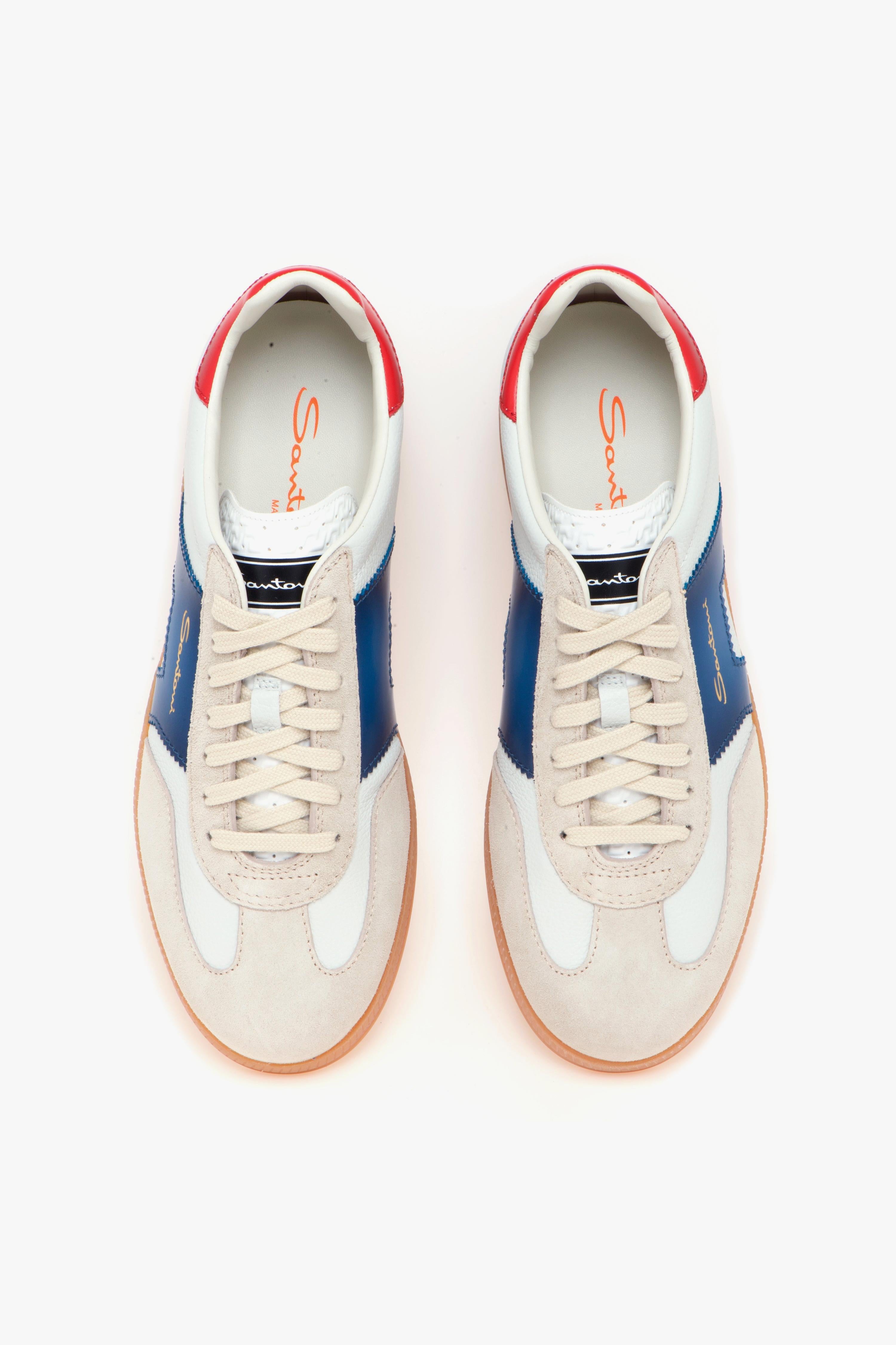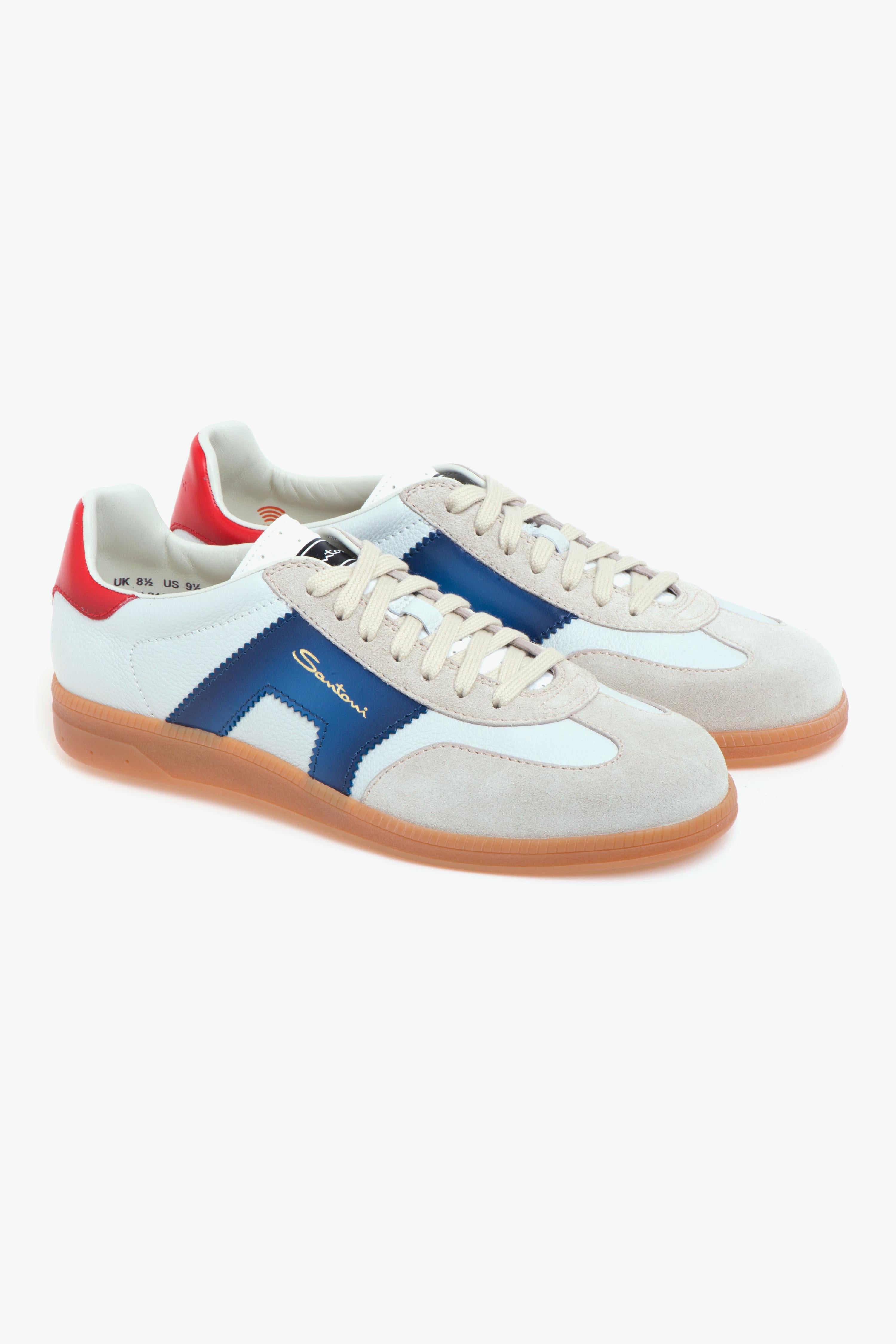 DBS Olympic è la nuova sneaker firmata Santoni ed ispirata alla calzature che hanno fatto la storia negli anni '70. Presenta una siloutette slanciata ed impreziosita dall'iconica "doppia fibbia" stilizzata che rende inconfondibile ogni modello del brand. Lo stesso tema della doppia fibbia viene riproposto anche nel pattern della linguetta, realizzata in pelle stampata. La tomaia è in pelle e camoscio con inserti a contrasto color blu e rosso mentre la suola è in gomma extra light. Nel complesso la scarpa è estremamente leggera e flessibile garantendo un confort senza pari durante tutto il giorno. Può essere indossata nel tempo libero con un outfit casual oppure con un abito non troppo formale. # Tomaia in pelle e camoscio. # Sottopiede in pelle estraibile. # Suola in gomma color miele. # Made in Italy.