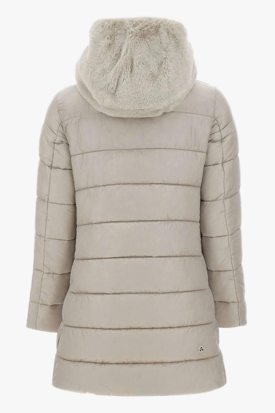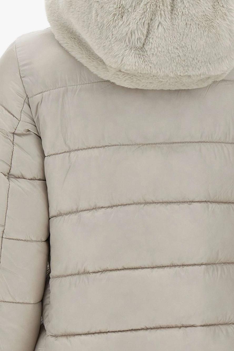 Proposto in un elegante beige, presenta un cappuccio rifinito da pelliccia sintetica, una chiusura frontale con zip, tasche laterali con zip e l’iconica applicazione con logo sulla manica. Il design imbottito garantisce calore e una vestibilità avvolgente, mantenendo allo stesso tempo uno stile femminile e moderno.