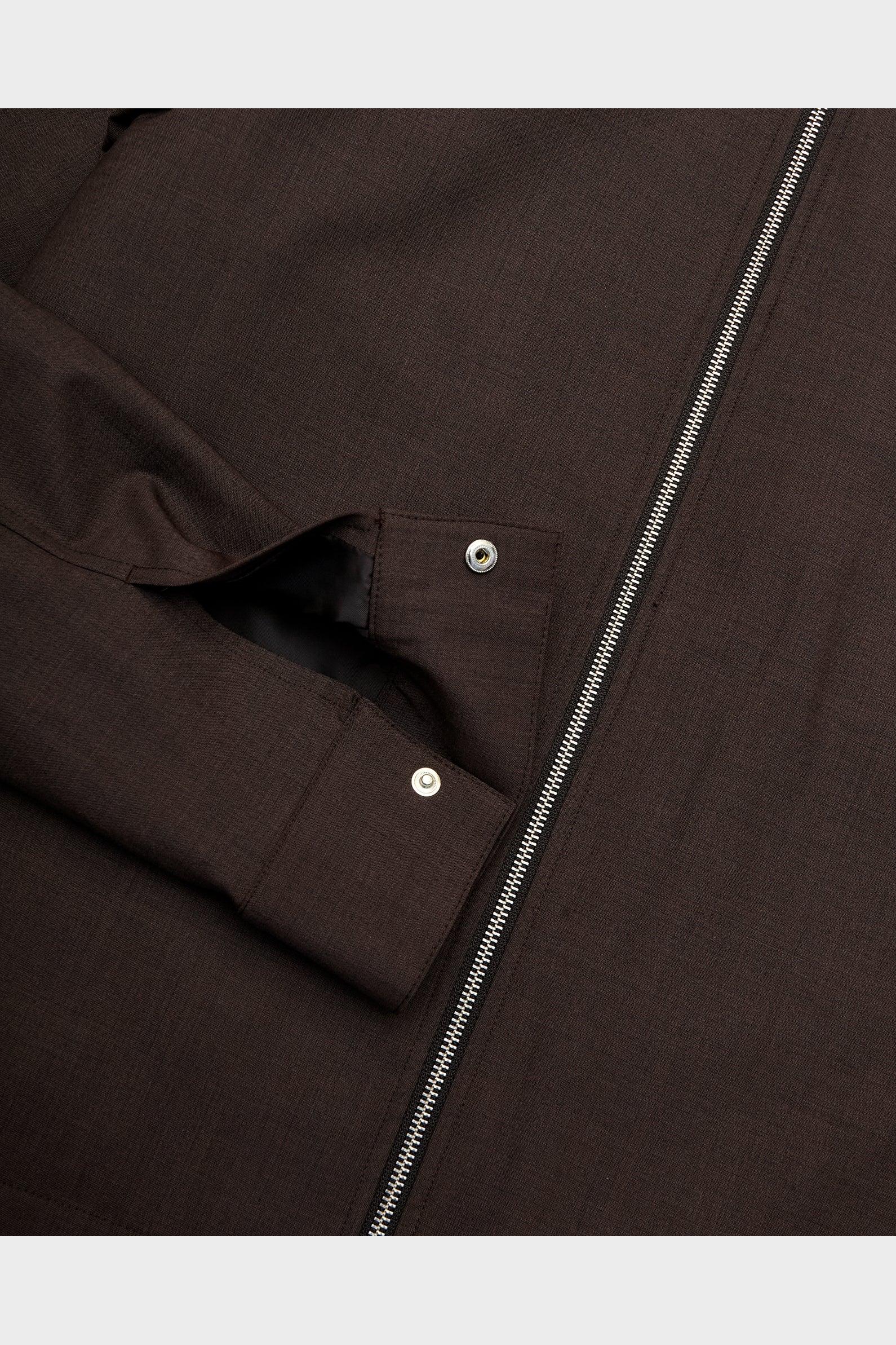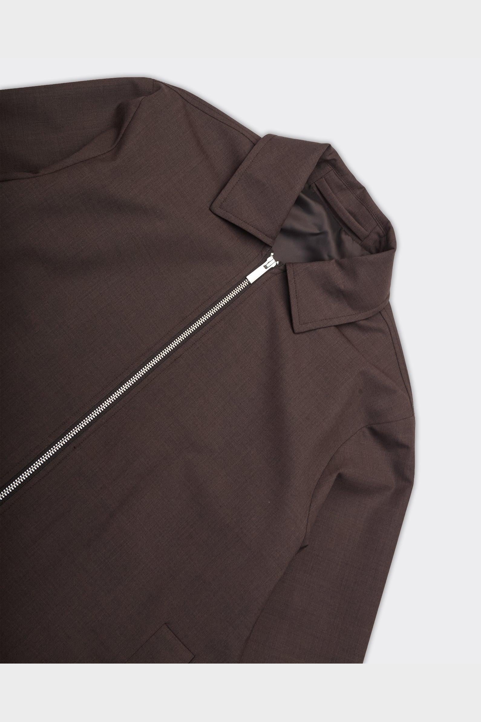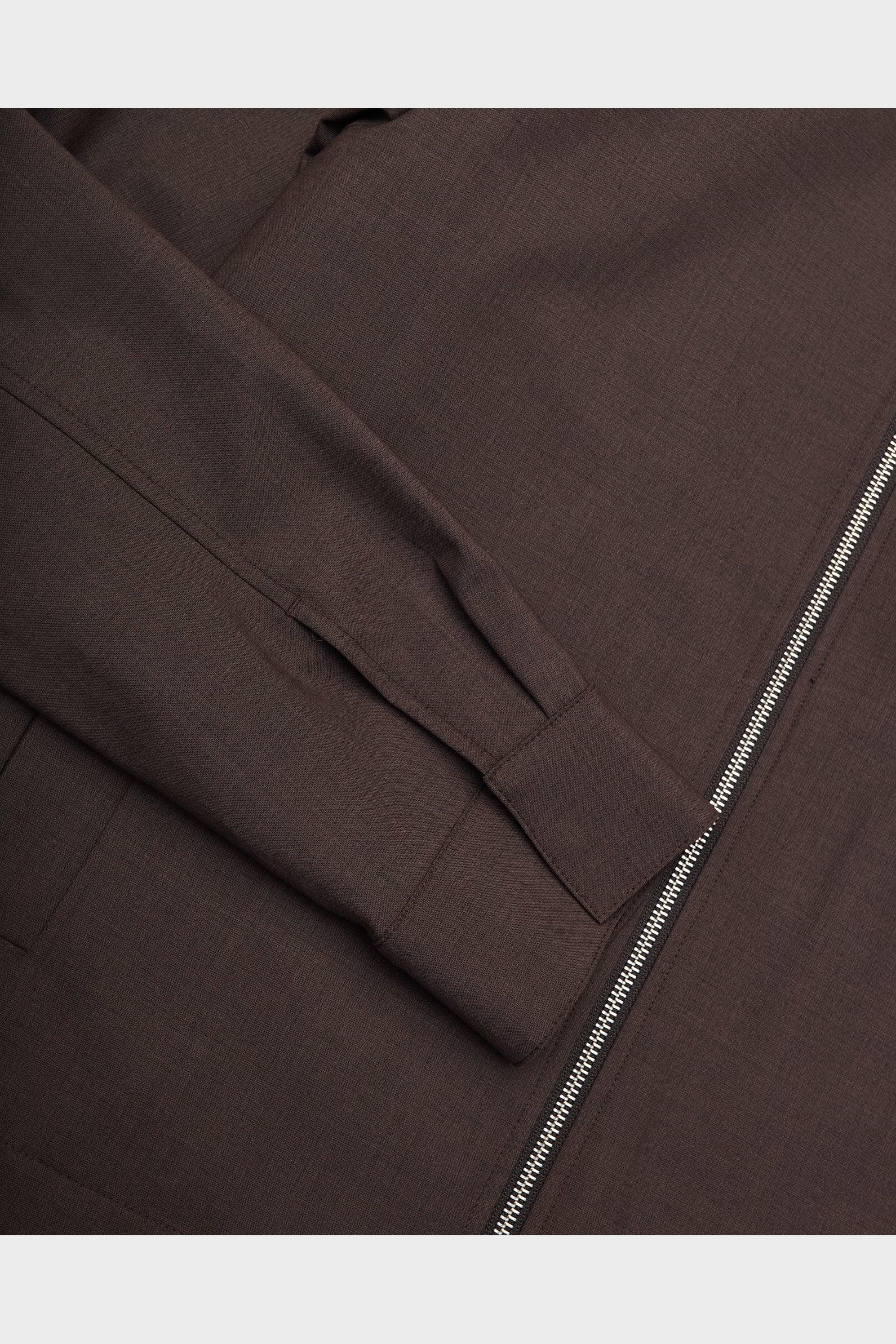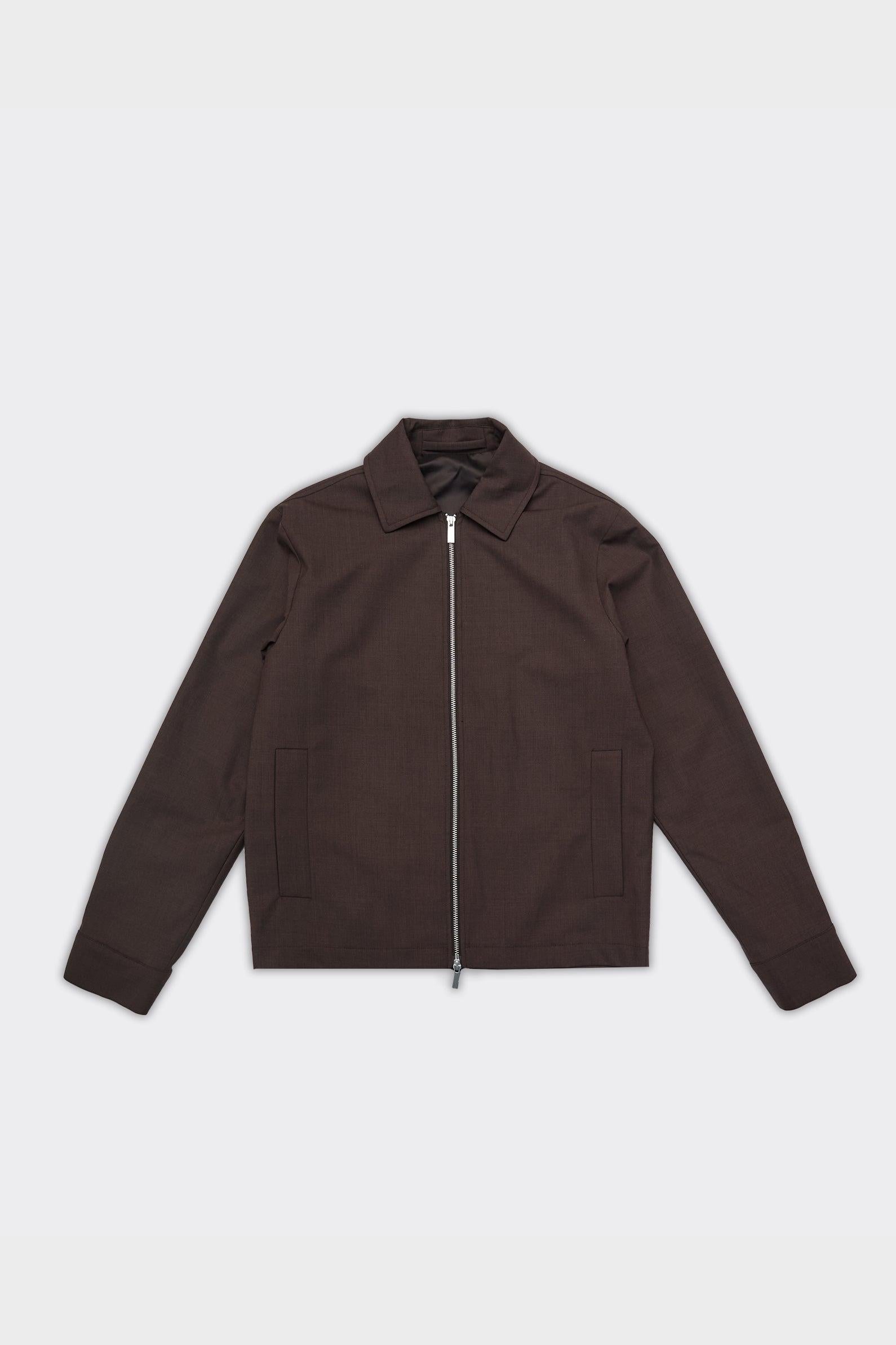 Giacca marrone in misto lana con chiusura a zip centrale. Tasche laterali senza decorazioni visibili. Colletto classico.