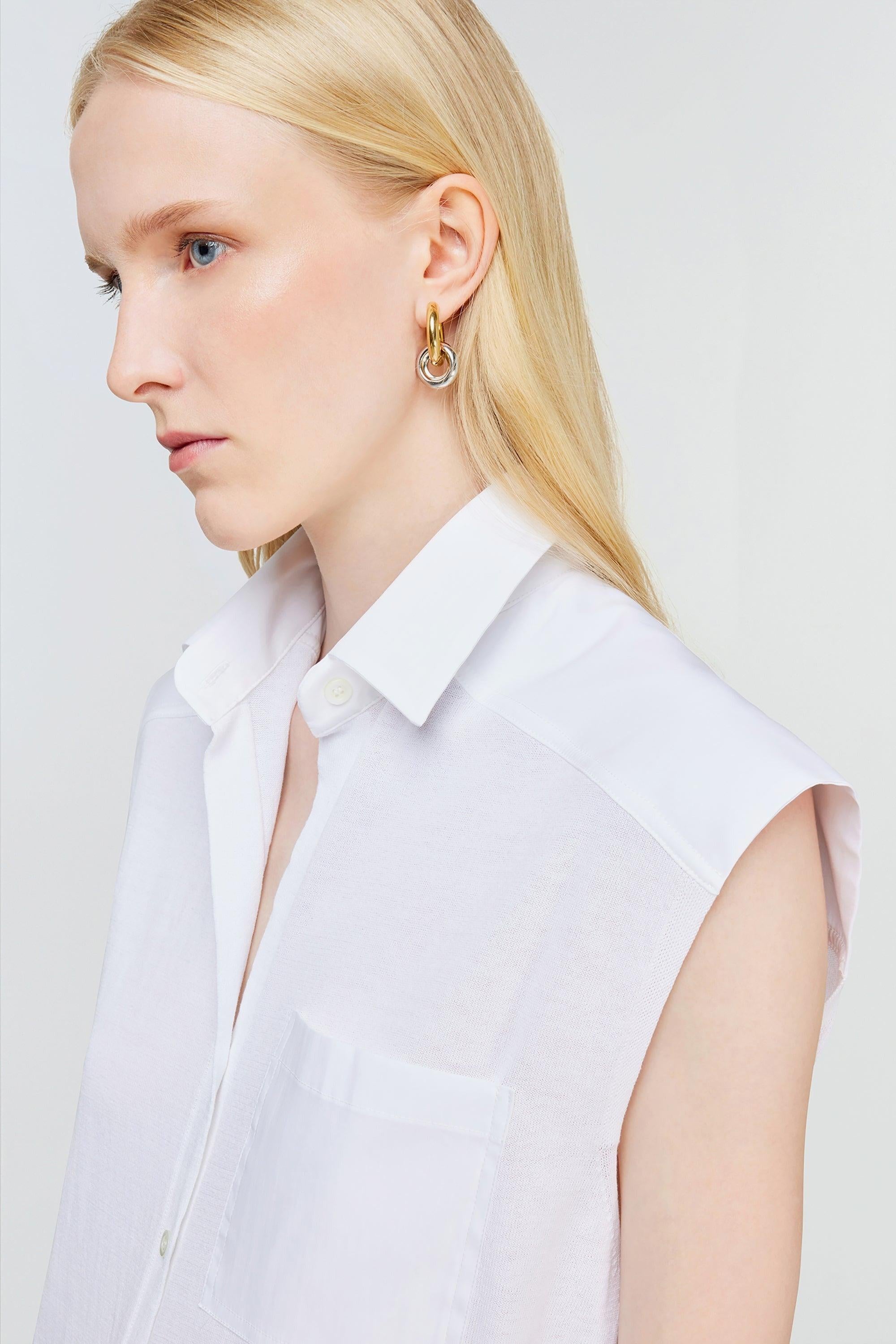 Un capo essenziale e raffinato, perfetto per chi ama un'eleganza minimalista ma ricercata. Questo gilet in cotone è un'interpretazione moderna di un classico senza tempo, caratterizzato da linee pulite e dettagli sartoriali, ideali per completare look sofisticati e versatili.La silhouette regular fit, con lunghezza al bacino, assicura una vestibilità equilibrata, mentre il colletto classico e la manica ad aletta con taglio raglan aggiungono un tocco di femminilità contemporanea. Il taschino sul petto e l’abbottonatura frontale conferiscono al capo un’eleganza sobria, perfetta per outfit sia casual che più formali.Realizzato in puro cotone, con inserti in popeline tono su tono, questo gilet combina comfort e leggerezza, risultando perfetto per la stagione primaverile ed estiva. # Composizione tessuto principale: 100% cotone. # Composizione tessuto secondario: 79% cotone, 18% poliammide, 3% elastan. # Abbottonatura frontale.# Taschino sul petto. # Colletto classico.# Manica ad aletta, con taglio raglan.# Inserti in popeline, in tono. # Vestibilità regular.# Made in Italy.