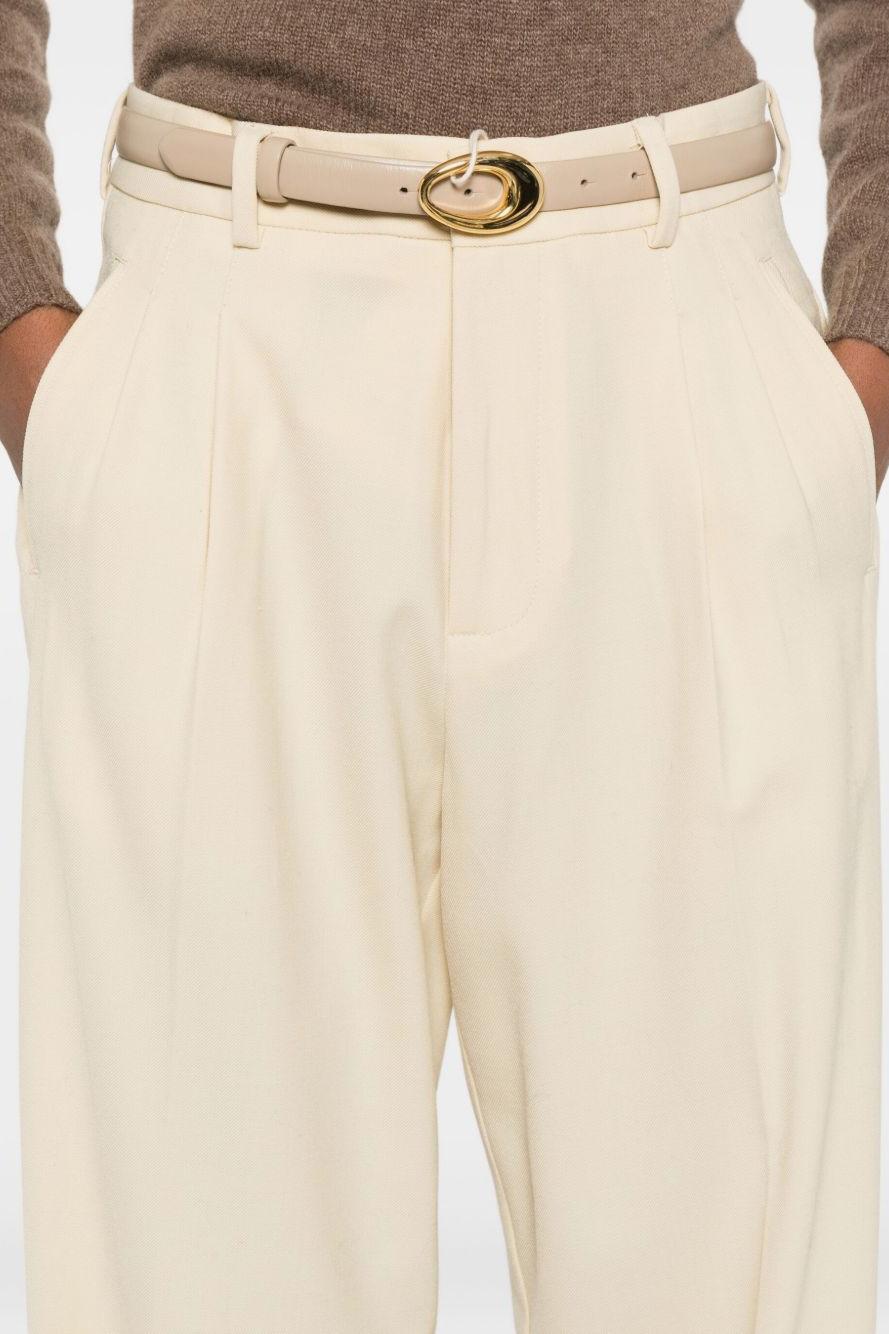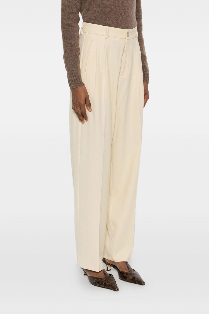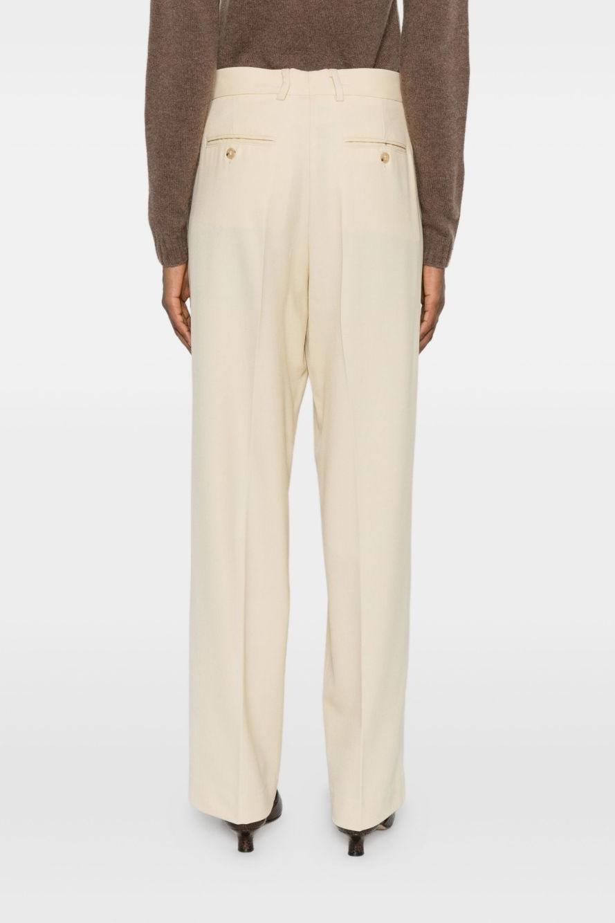 Il design è arricchito da dettaglio plissettato che definisce la linea e slancia la silhouette. La chiusura frontale con abbottonatura, i passanti per cintura e la tasca laterale a filetto garantiscono funzionalità e comfort, mantenendo un’estetica pulita e sartoriale.