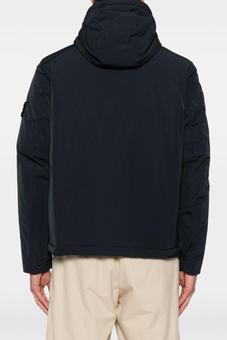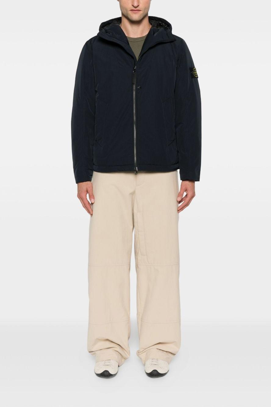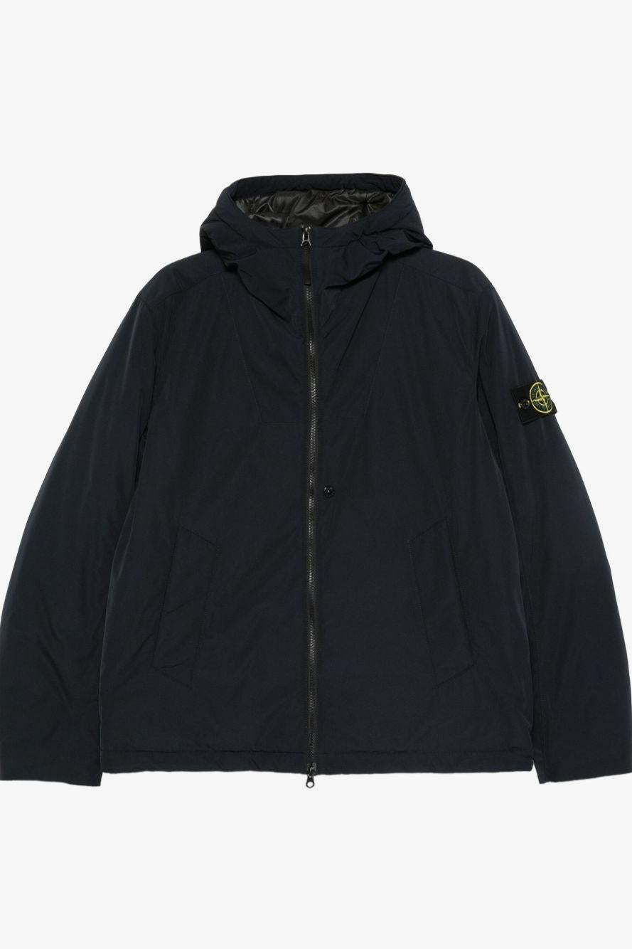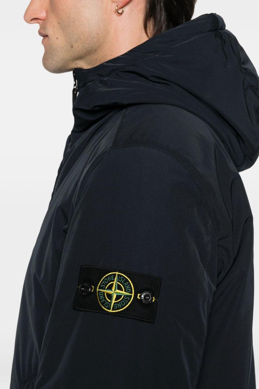 Proposto in blu, presenta chiusura frontale con doppia zip, cappuccio imbottito e polsini con abbottonatura automatica per una vestibilità regolabile e confortevole. Il giogo sul petto e la costruzione sartoriale tipica di Stone Island completano il design con un tocco distintivo e contemporaneo.