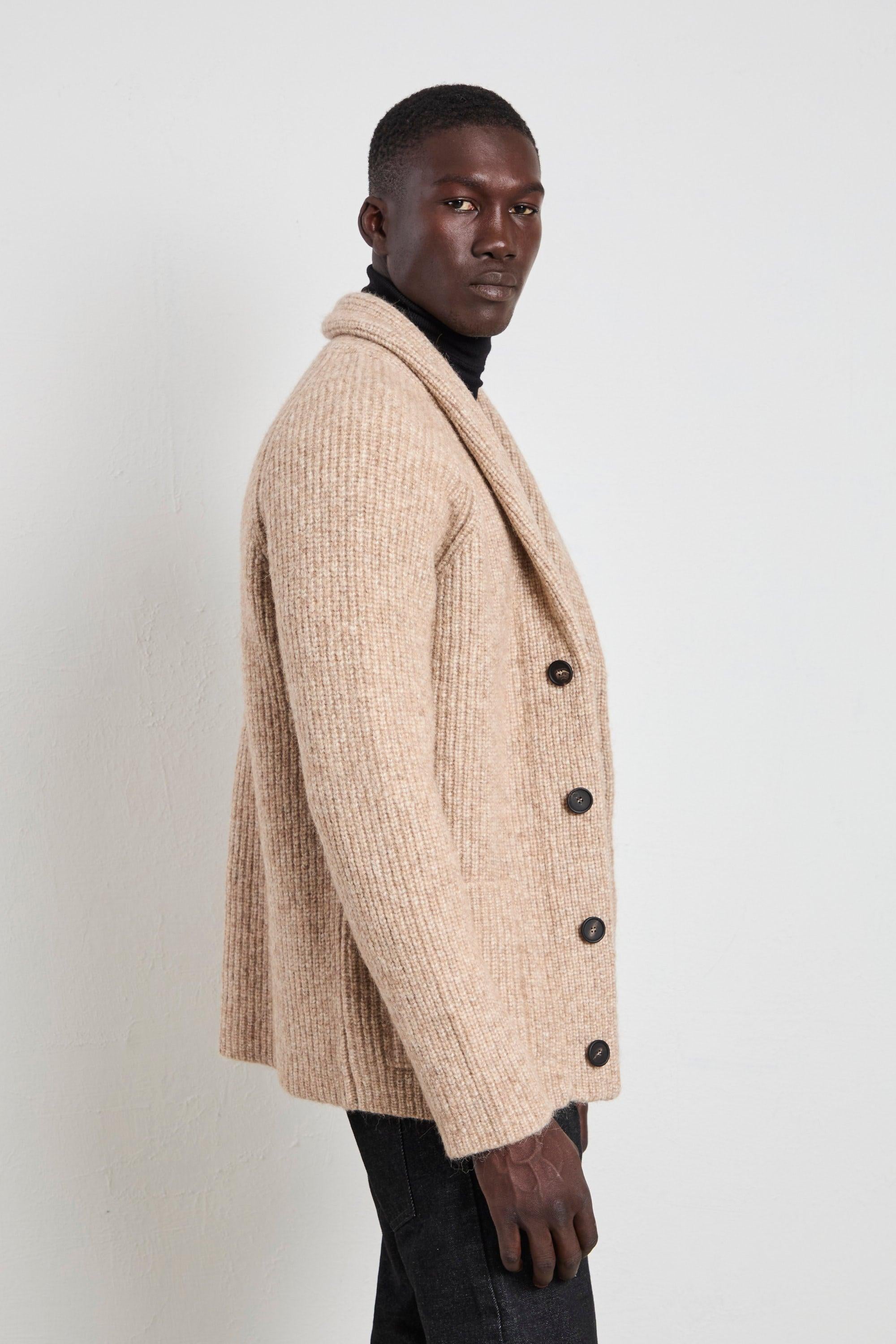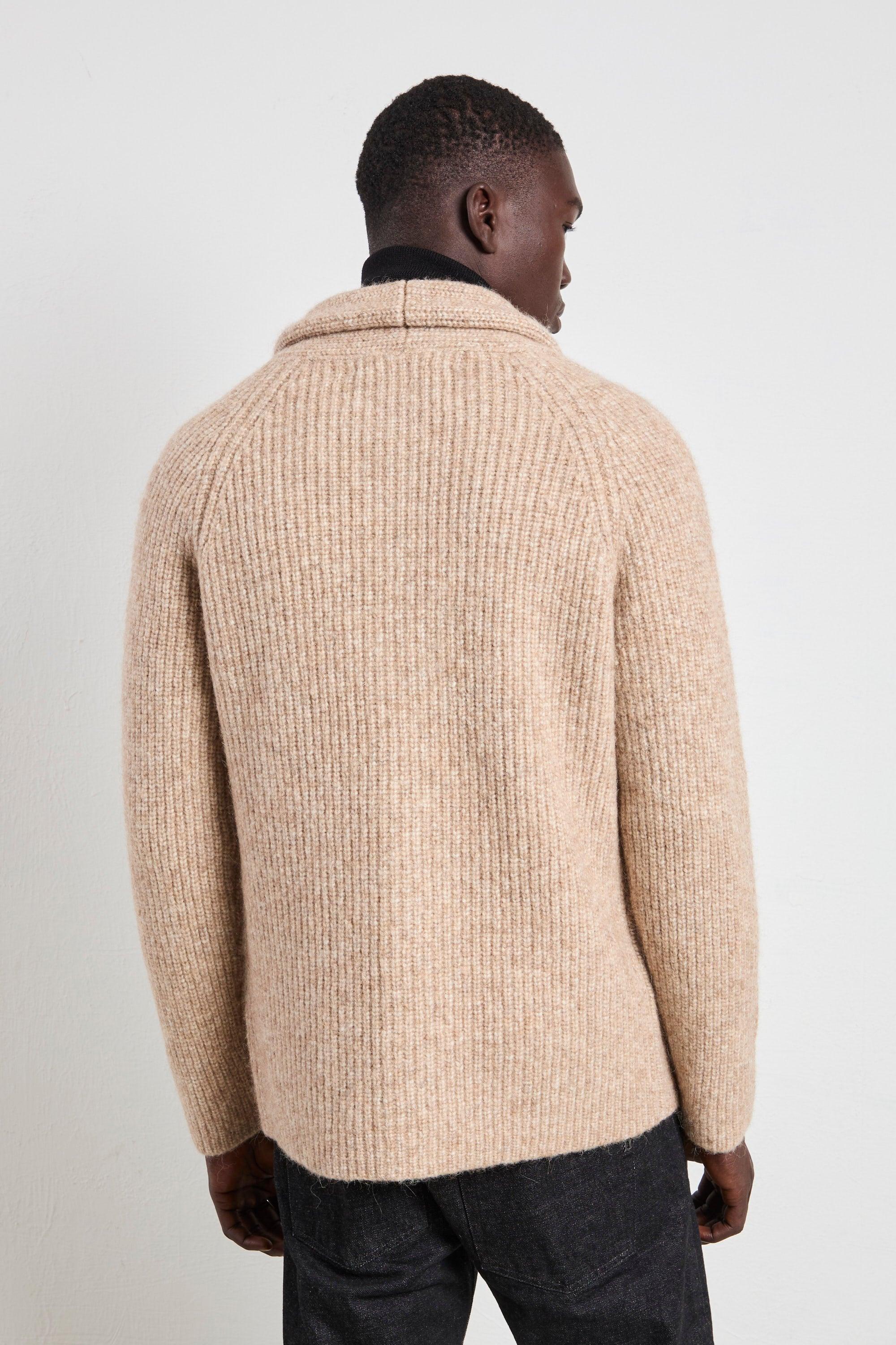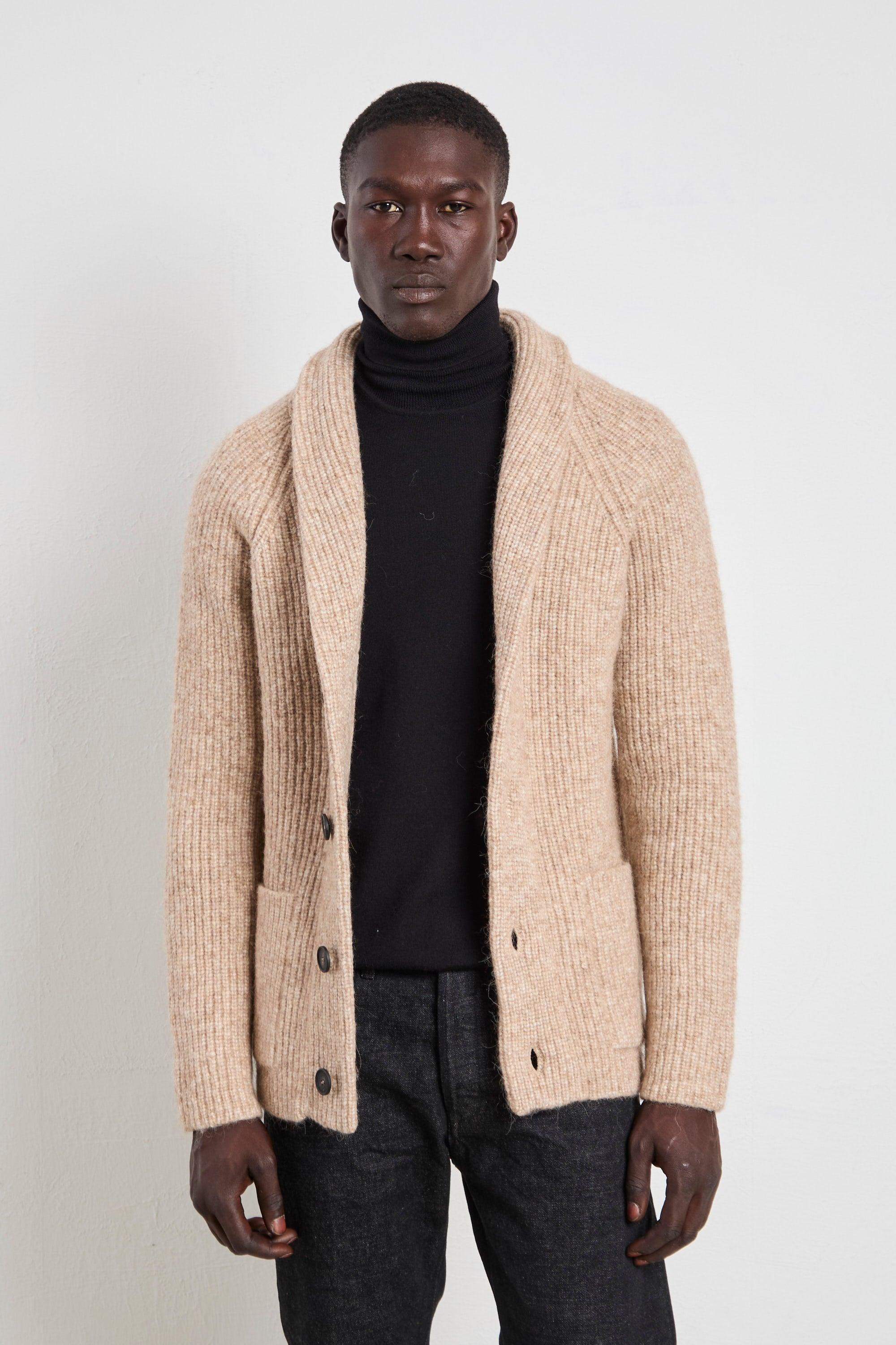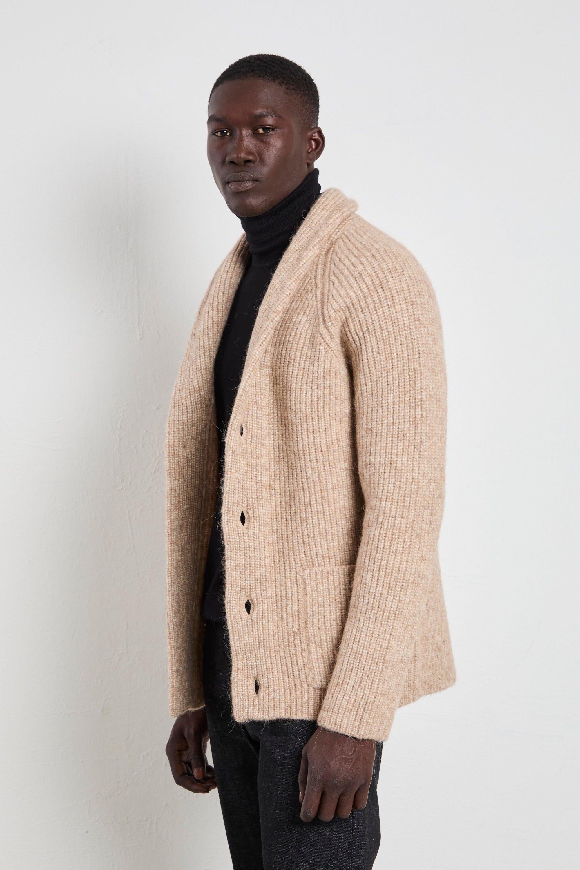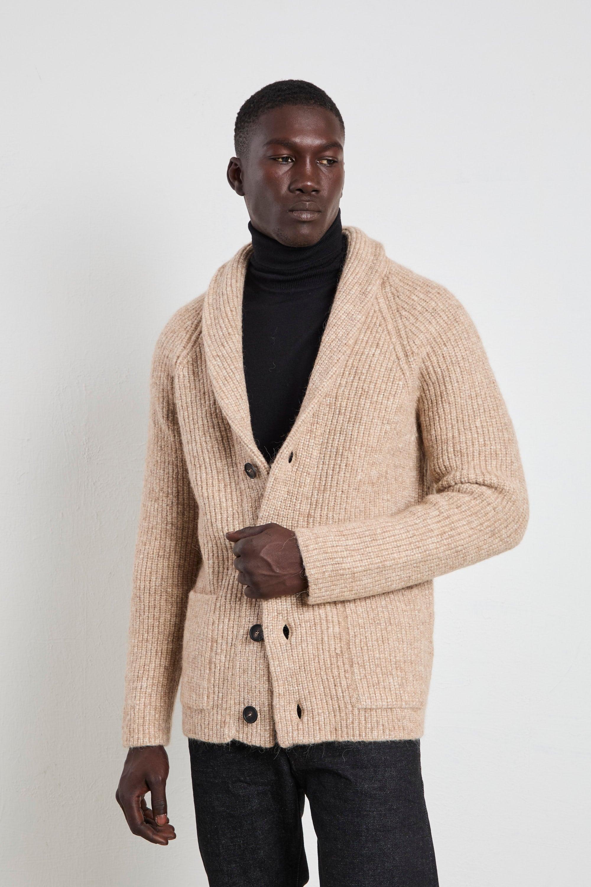 Dettagli del prodotto: Modello: cardigan con collo sciallato e chiusura a bottoni Vestibilità: morbida e comoda Colore: beige, tonalità neutra e versatile Composizione: 40% baby alpaca, 30% lana vergine, 30% poliammide Taglia indossata: L Made in: Italia Tasche: due tasche laterali
