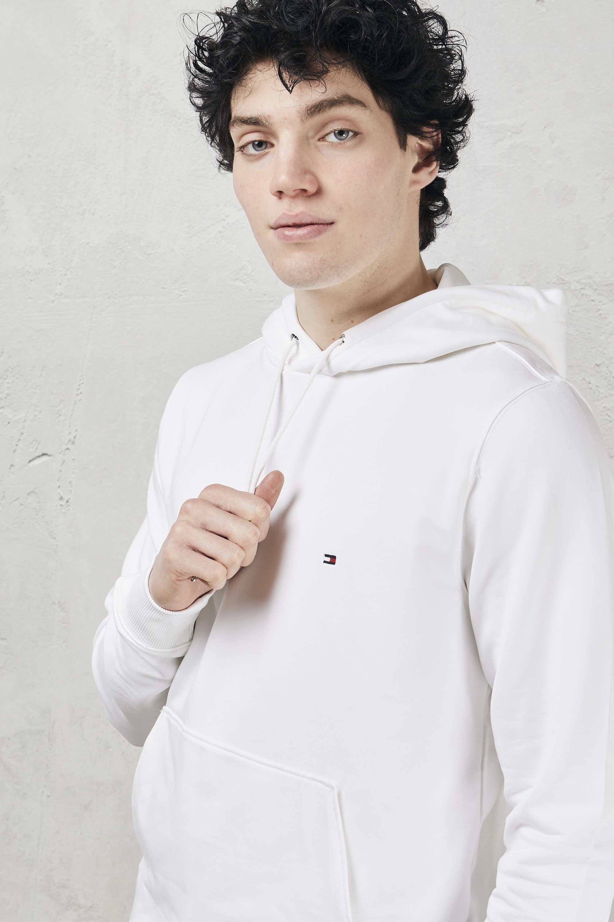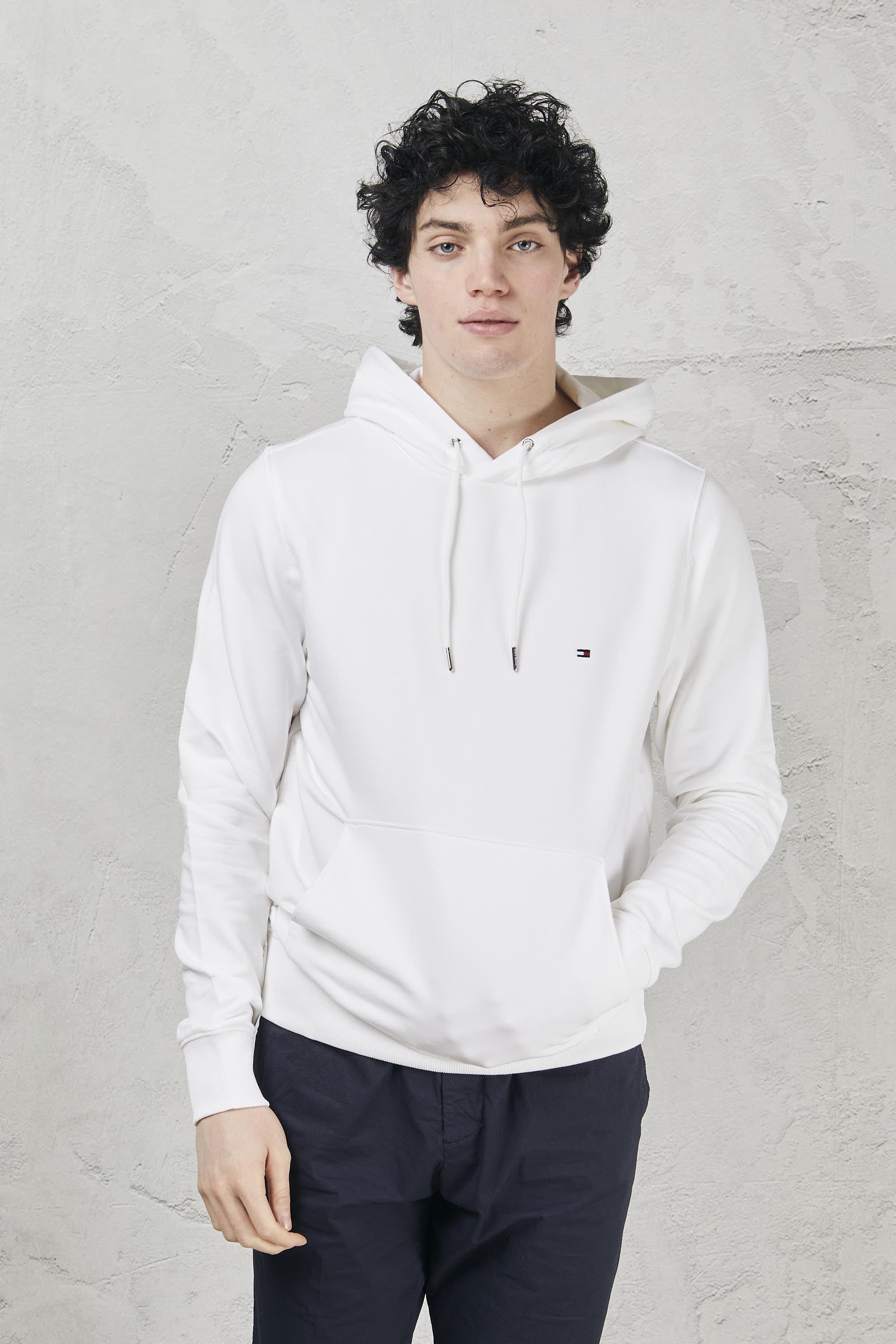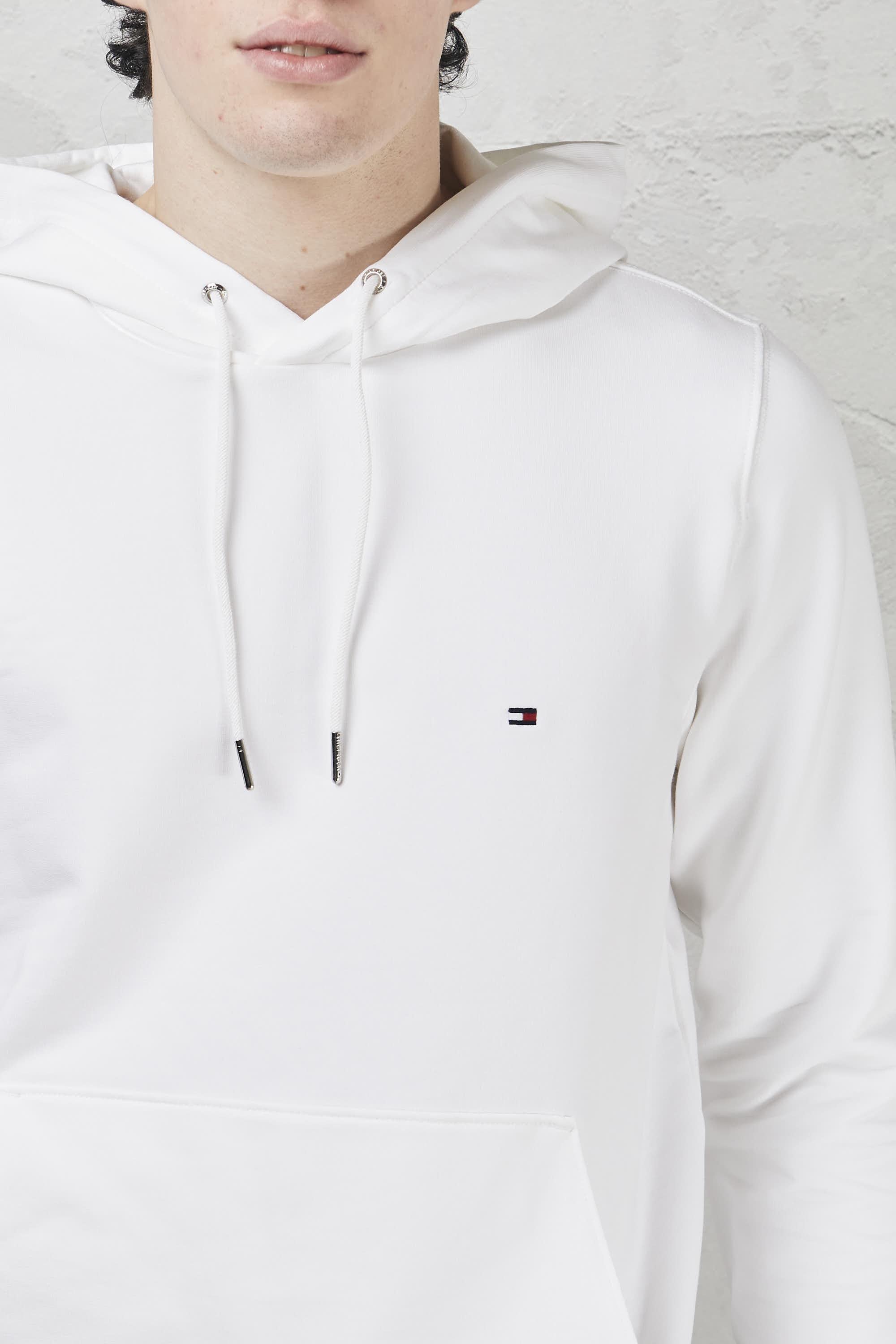 Felpa con cappuccio e lacci, tasca a marsupio e bandierina Tommy Hilfiger ricamata sul petto. Il modello è alto 187 cm e indossa la taglia L.Materiale: 65% Cotone biologico 30% Cotone 5% Elastan