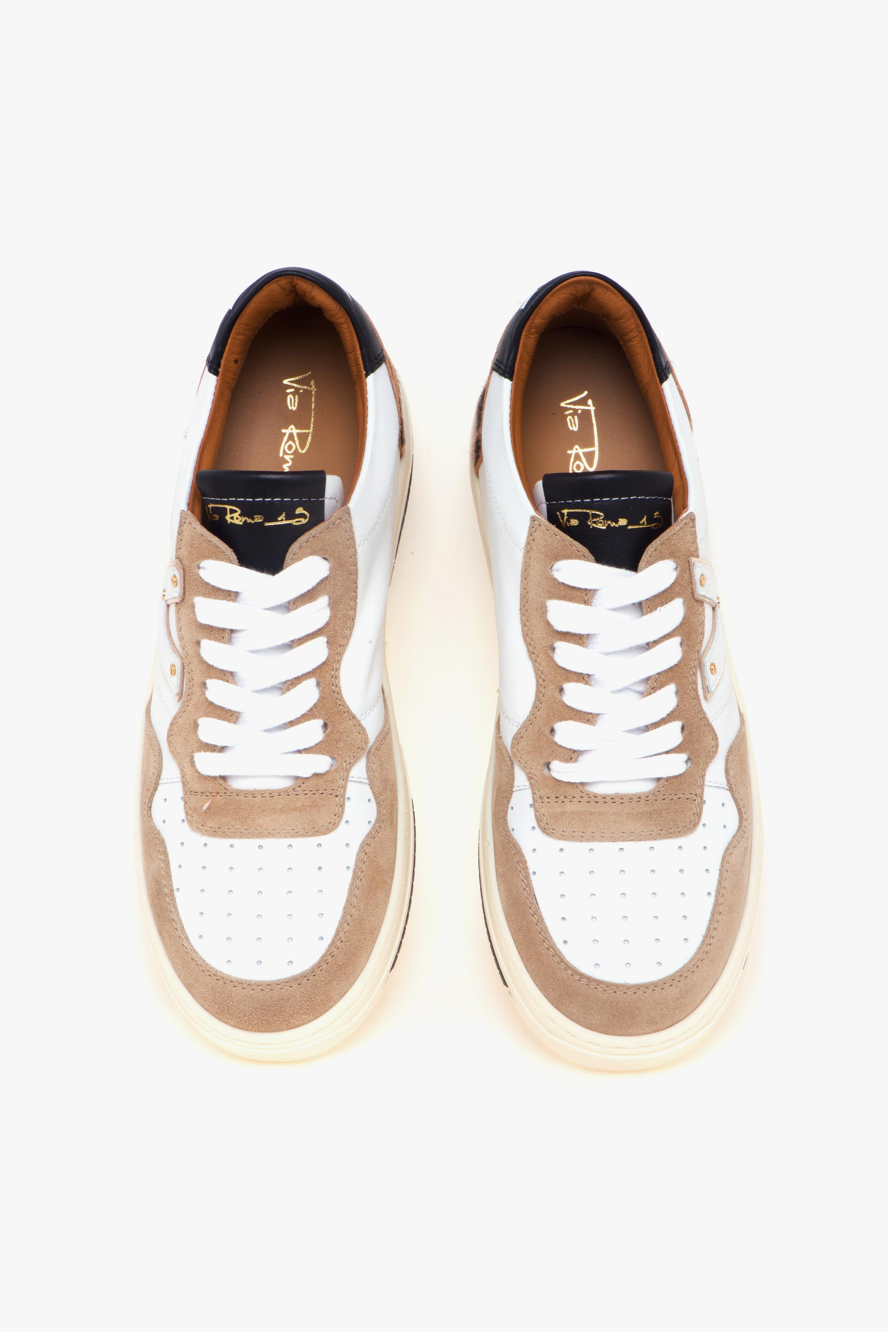 La sneaker Via Roma 15 unisce richiami rétro e design contemporaneo per un modello dallo stile urbano e raffinato. La tomaia in pelle è arricchita da inserti in camoscio beige posizionati in punta e a ridosso dei lacci, che donano contrasto materico e un tocco ricercato. A rendere unico il design è il tallone in cavallino maculato, dettaglio dal carattere deciso che aggiunge personalità e rende la scarpa immediatamente riconoscibile. Il talloncino in pelle nera con logo VR15 a contrasto enfatizza l’identità del brand, mentre la suola in gomma personalizzata garantisce comfort, resistenza e stabilità nell’uso quotidiano. Interno e sottopiede in pelle — quest’ultimo estraibile — offrono una calzata morbida e traspirante. Una sneaker Made in Italy, perfetta per chi cerca versatilità e stile con un tocco distintivo. Caratteristiche principali: # Tomaia 100% pelle con inserti in camoscio beige. # Tallone in cavallino maculato. # Talloncino in pelle nera con logo VR15 a contrasto. # Fodera in pelle. # Sottopiede estraibile in pelle. # Suola in gomma personalizzata con logo. # Made in Italy.