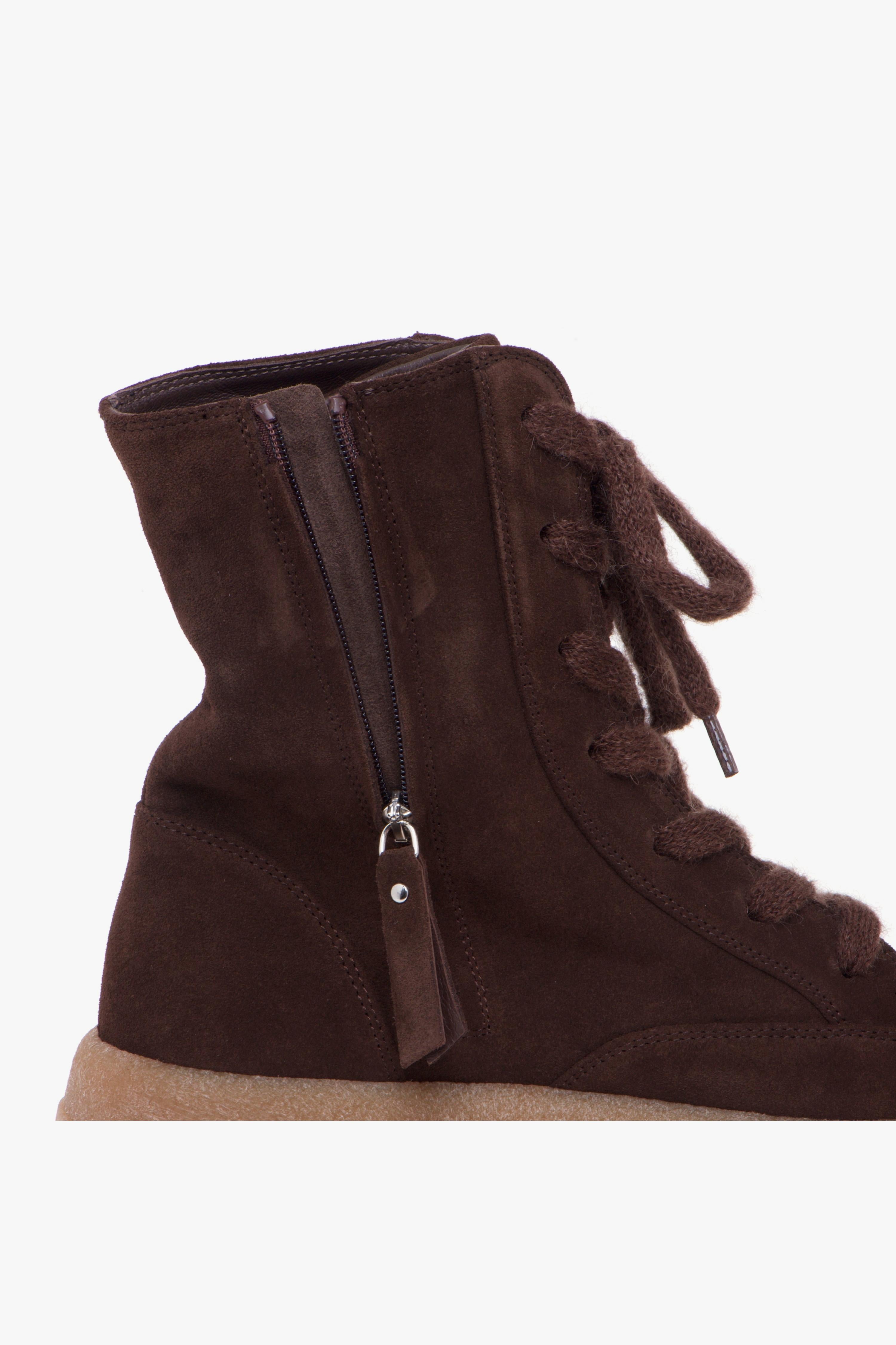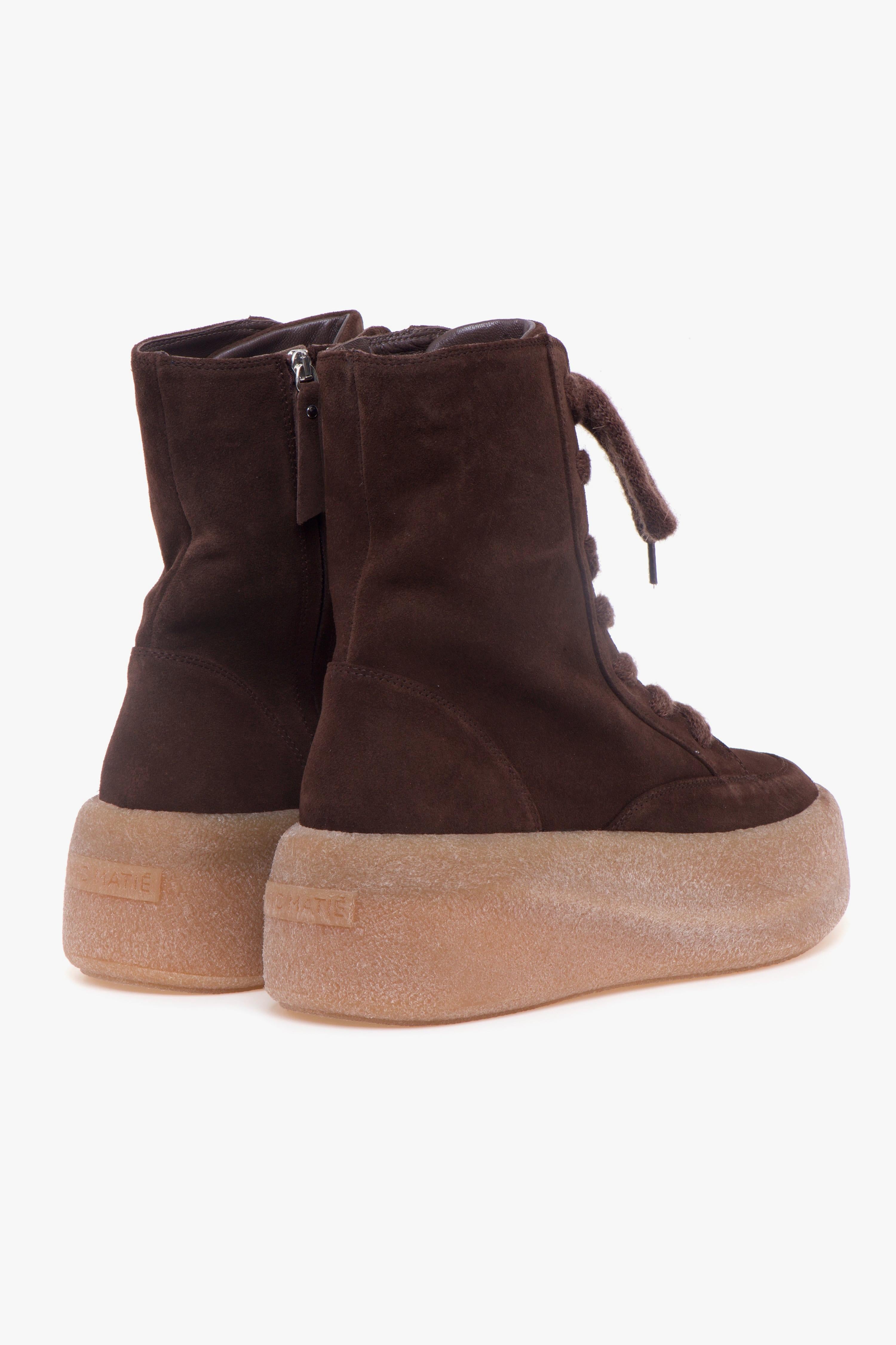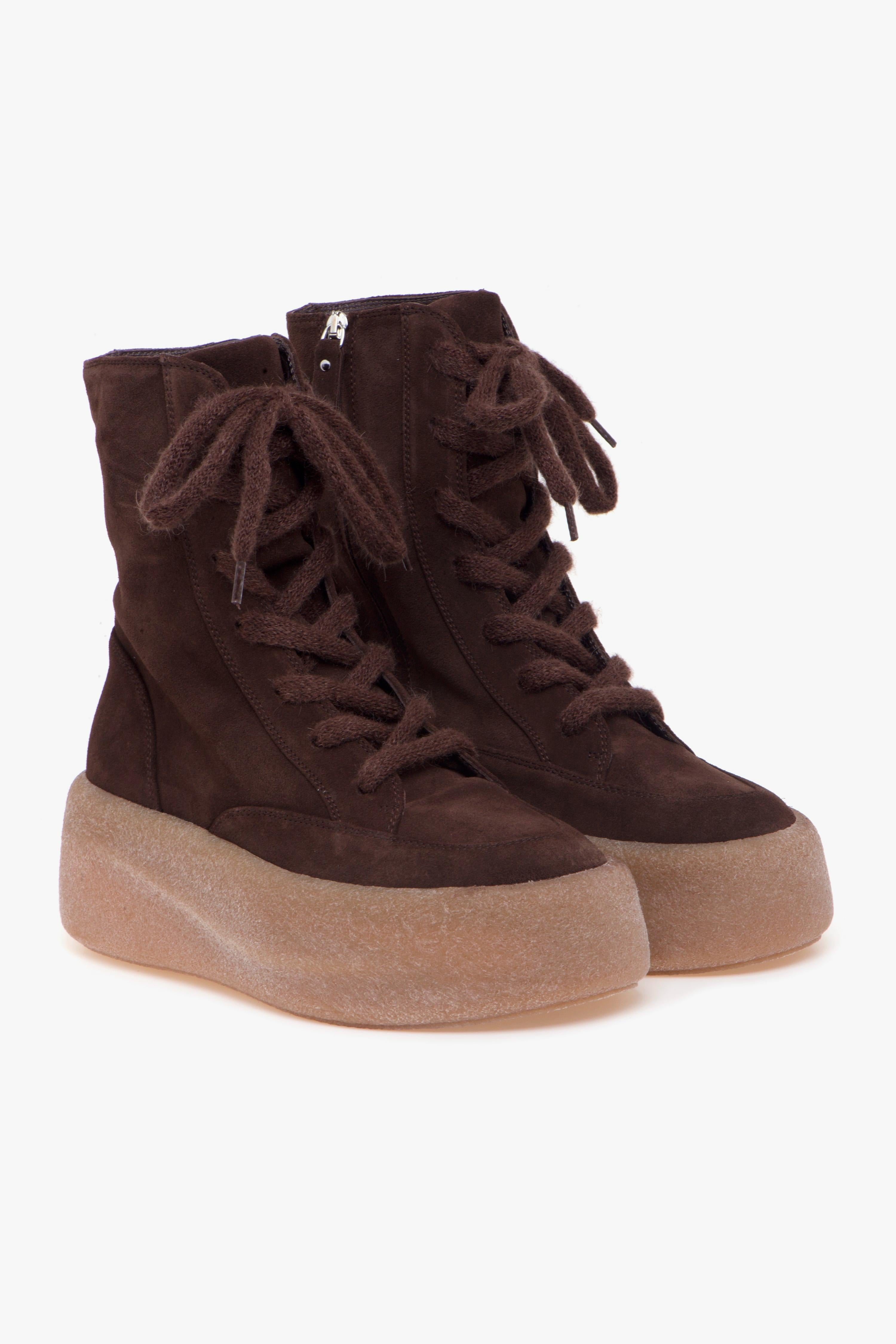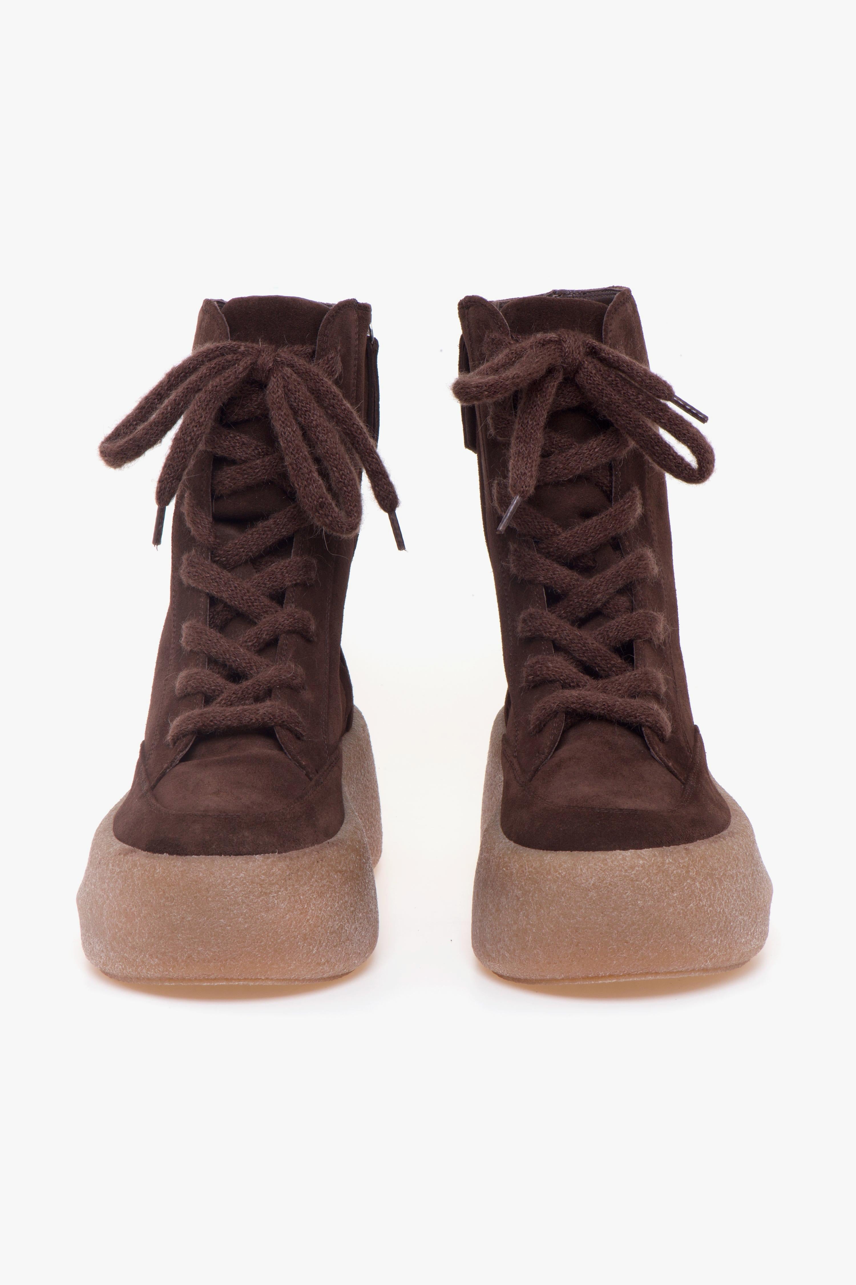 Vic Matiè eleva il concetto di polacco con un modello in morbido suede color coffee dal profilo contemporaneo e ricercato. La suola oversize in para color miele definisce il carattere casual-chic: un platform dalle linee morbide e tondeggianti che snelliscono la silhouette e assicurano stabilità (70 mm al tallone, 60 mm in punta, dislivello 10 mm). La zip interna rende la calzata immediata, mentre i lacci in lana, dal look tondeggiantei, aggiungono un dettaglio materico che non passa inosservato. Internamente, fodera e sottopiede in pelle, quest’ultimo estraibile, completano una costruzione artigianale Made in Italy pensata per il comfort quotidiano con un’estetica di forte personalità.Caratteristiche principali: # Polacco Vic Matiè in camoscio (suede) color coffee.# Suola oversize in gomma para color miele (platform).# Design della suola con linee morbide e tondeggianti.# Zip sul lato interno per calzata rapida.# Lacci in lana a volume leggermente più ampio.# Fodera in pelle.# Sottopiede estraibile in pelle.# Suola in gomma.# Altezza suola: 70 mm tallone / 60 mm punta (dislivello 10 mm).# Prodotto artigianale – Made in Italy.