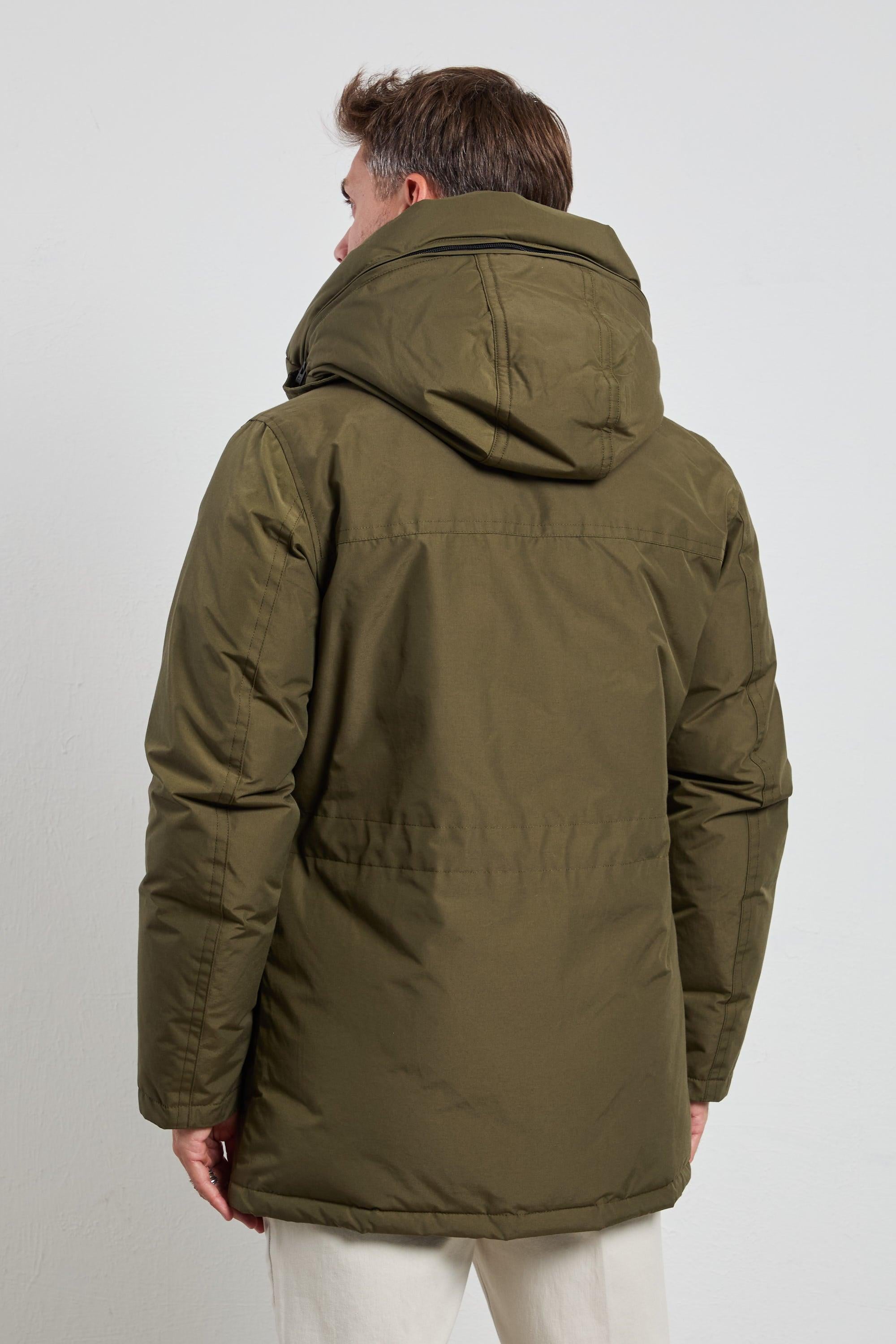 Dettagli prodotto Modello: Ramar Artic Parka Vestibilità: regolare Vita: regolabile con coulisse interna Composizione: 60% cotone, 40% fibre tecniche; imbottitura 90% piuma, 10% piumino Colore: verde Chiusura: doppia zip nascosta da patta con bottoni a pressione Tasche: due tasche scaldamani con zip, due tasche a patta con bottone Taglia indossata: L Logo: nel cappuccio richiudibile con zip