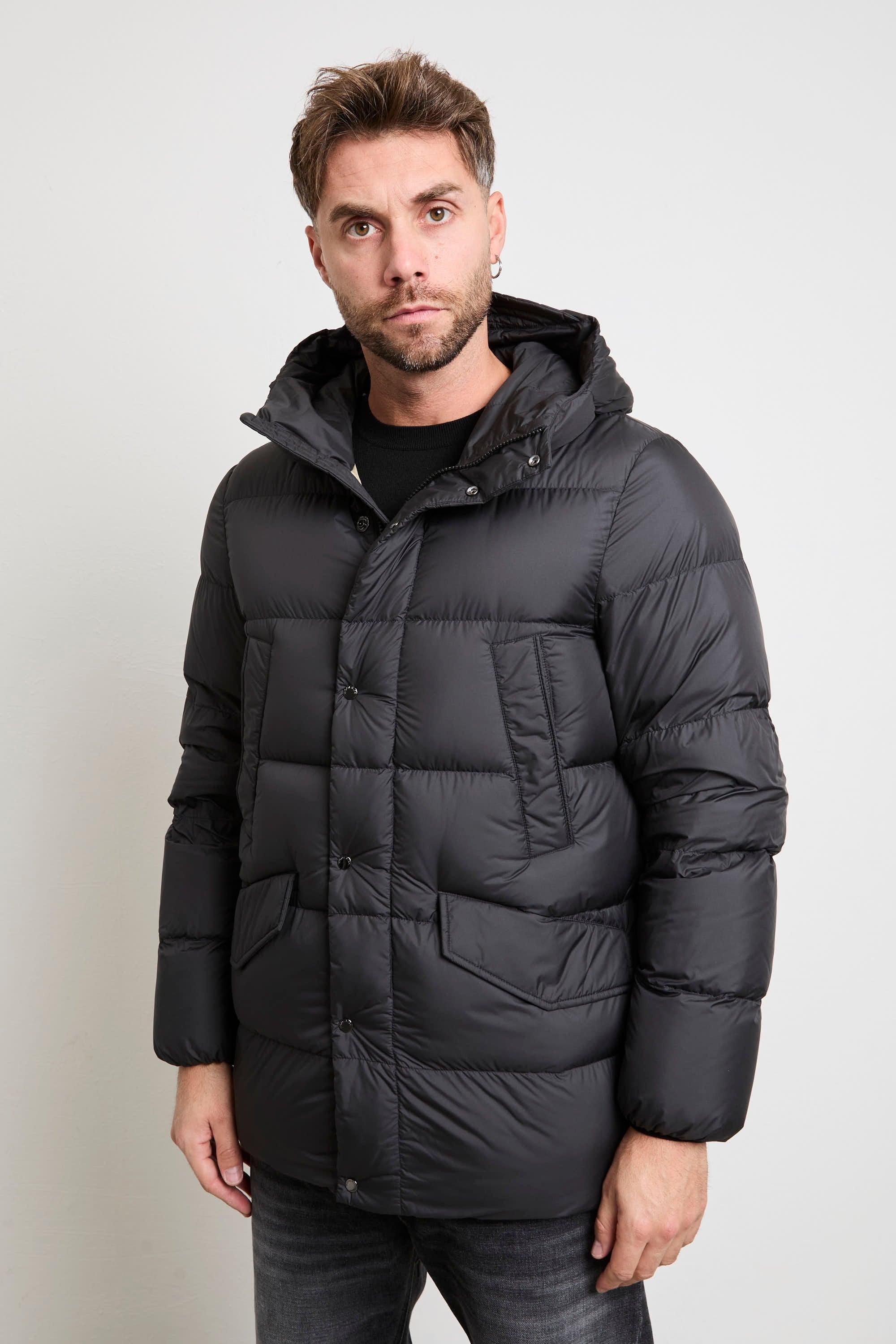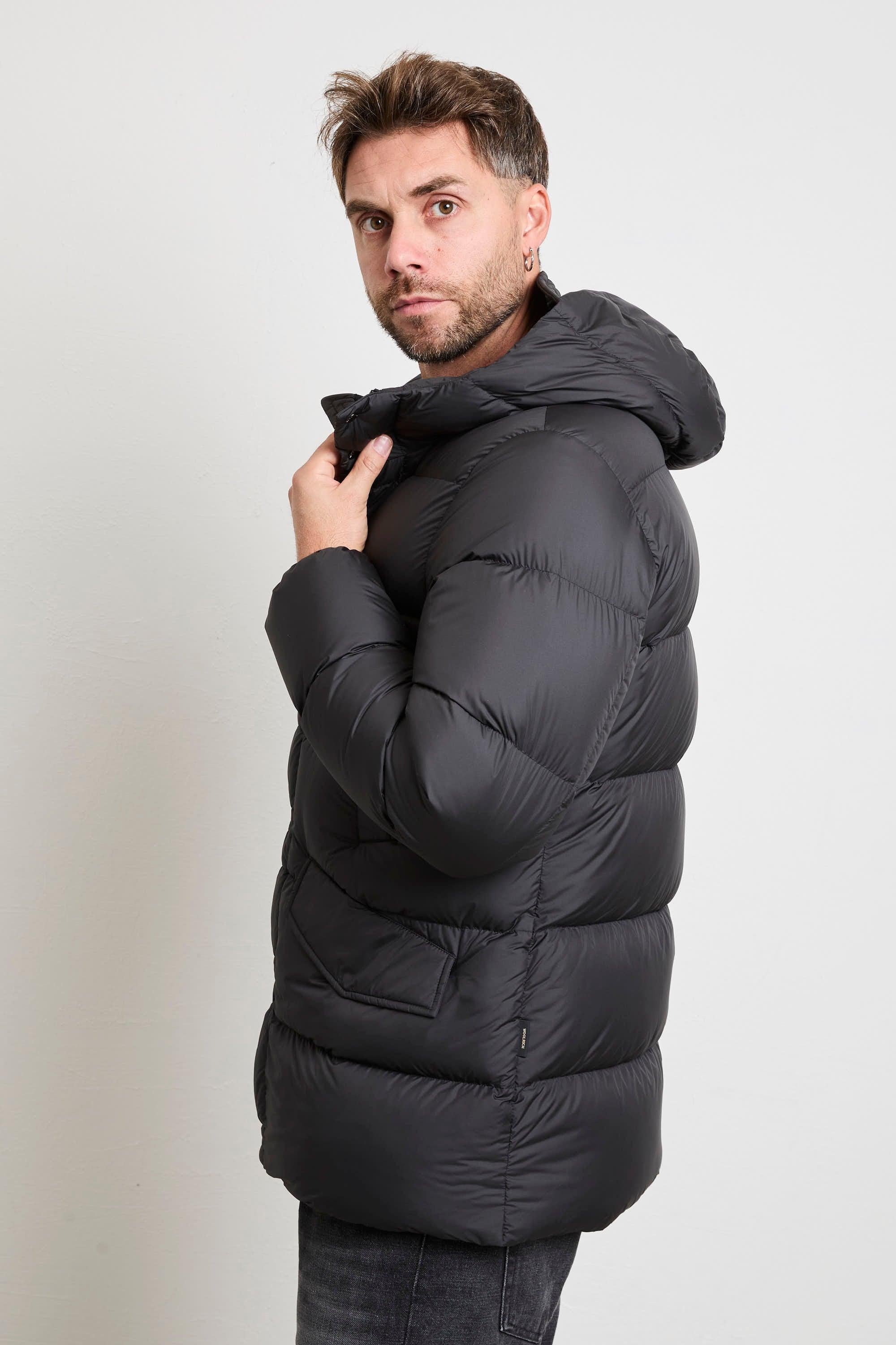 Caratteristiche Modello: Cloud Davis Vestibilità: regolare Colore: nero Composizione: tessuto tecnico resistente all’acqua, imbottitura leggera Chiusura: zip coperta da patta con bottoni Logo: etichetta sul petto Tasche: due tasche laterali con patta e bottoni; tasca interna con zip Cappuccio: regolabile con coulisse Taglia indossata: L