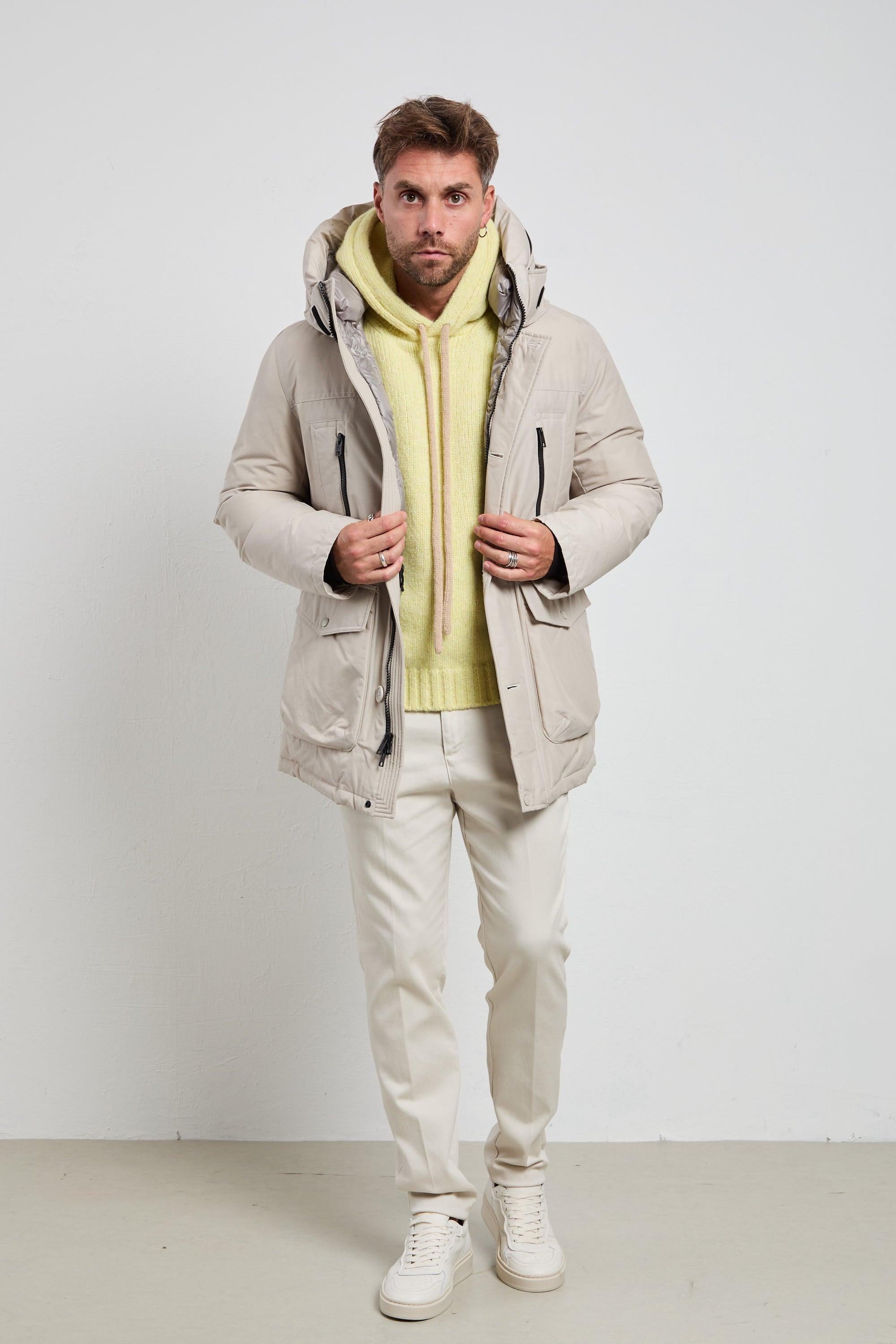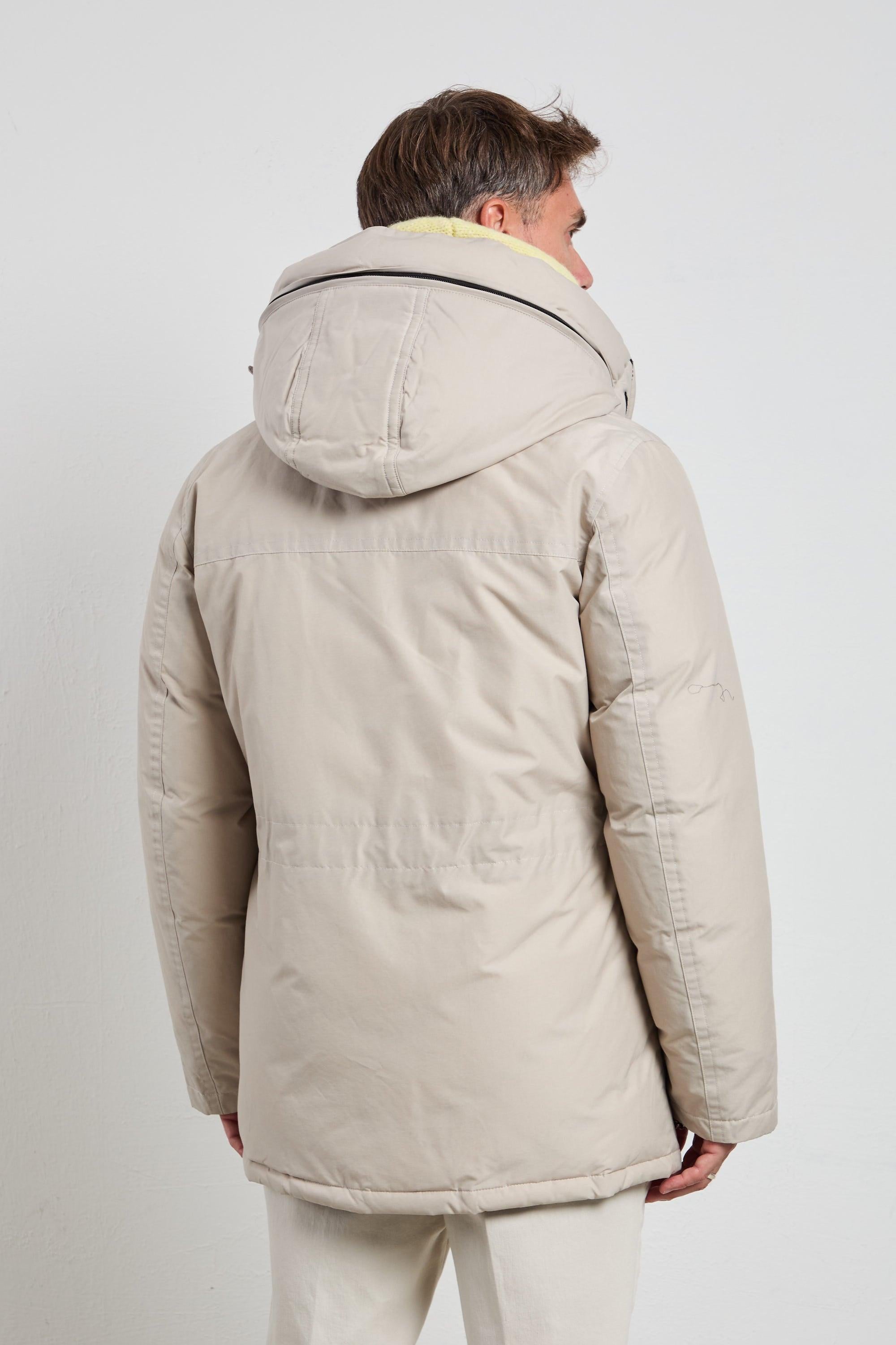 Perfetto per il colore ghiaccio, questo parka si abbina armoniosamente a pantaloni in lana chiara e stivaletti beige per un look urbano luminoso, a jeans chiari e sneakers pastello per un outfit casual contemporaneo, o a pantaloni tecnici e scarponcini neutri per un’eleganza funzionale durante le attività outdoor. Modello: Ramar Artic Parka Vestibilità: regolare Vita: regolabile con coulisse interna Composizione: 60% cotone, 40% fibre tecniche Imbottitura: 90% piuma, 10% piumino Colore: ghiaccio Chiusura: doppia zip nascosta da patta con bottoni a pressione Tasche: due tasche scaldamani con zip, due tasche a patta con bottone Taglia indossata: L Logo: nel cappuccio richiudibile con zip