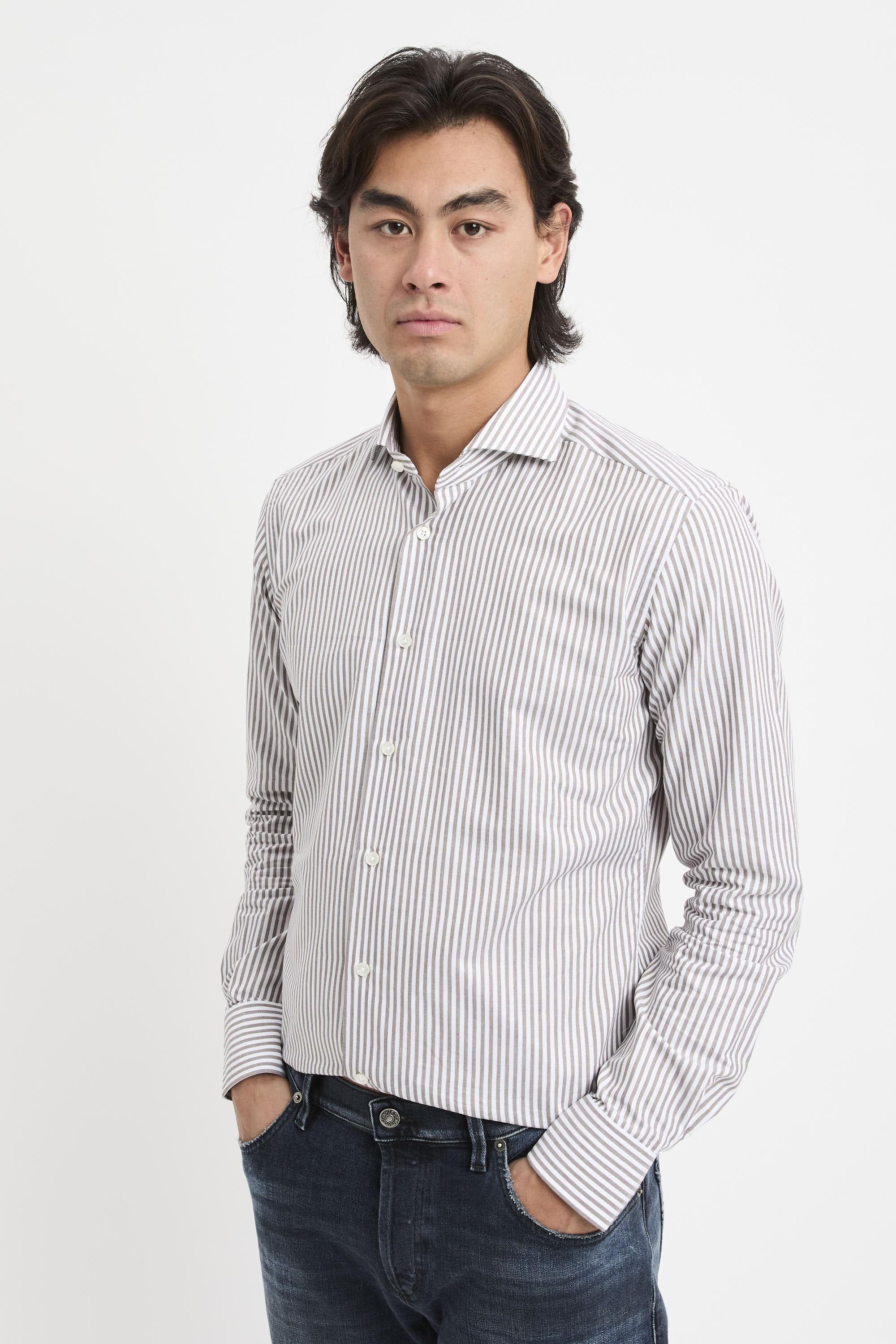 - Camicia con collo francese- Stecche estraibili- Cuciture all'inglese- Polso quadrato- Senza pinces- Motivo a righeColore: Bianco/MarroneIl modello indossa la taglia 40, è alto 1.83 cm e pesa 72 kg.STAGIONE: AUTUNNO INVERNO 2025/2026COD: WF520ML 91810 008Materiale: 100% Cotone